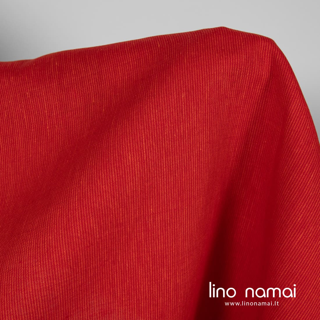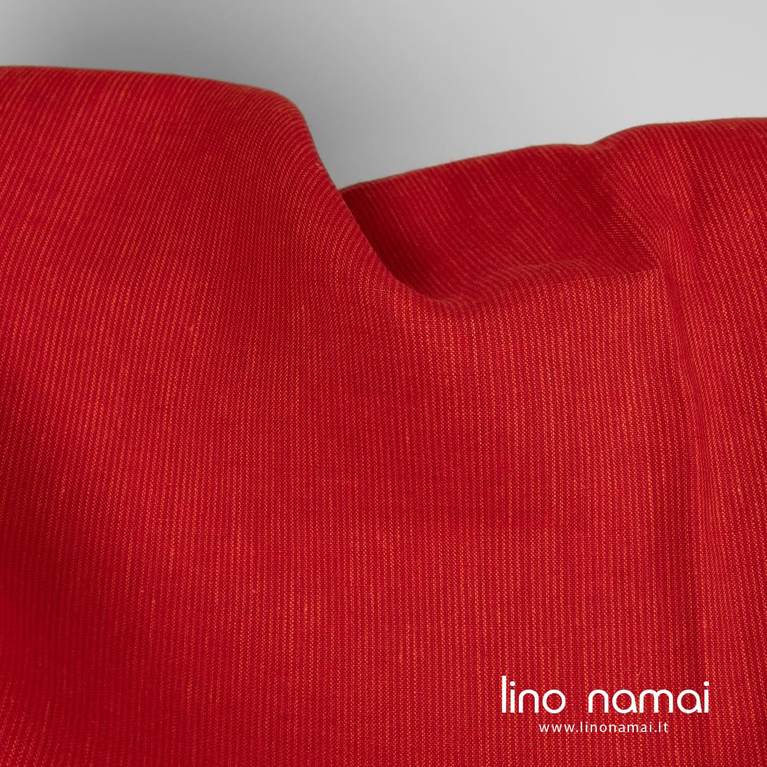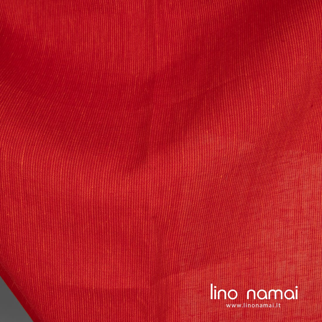 Ryškiai raudonas lininis audinys vertikaliais smulkiais oranžiniais dryžiais yra tvirtas, tankus, lengvas. Tinka drabužiams, patalynei, užuolaidoms, staltiesėms ir servetėlėms siūti.