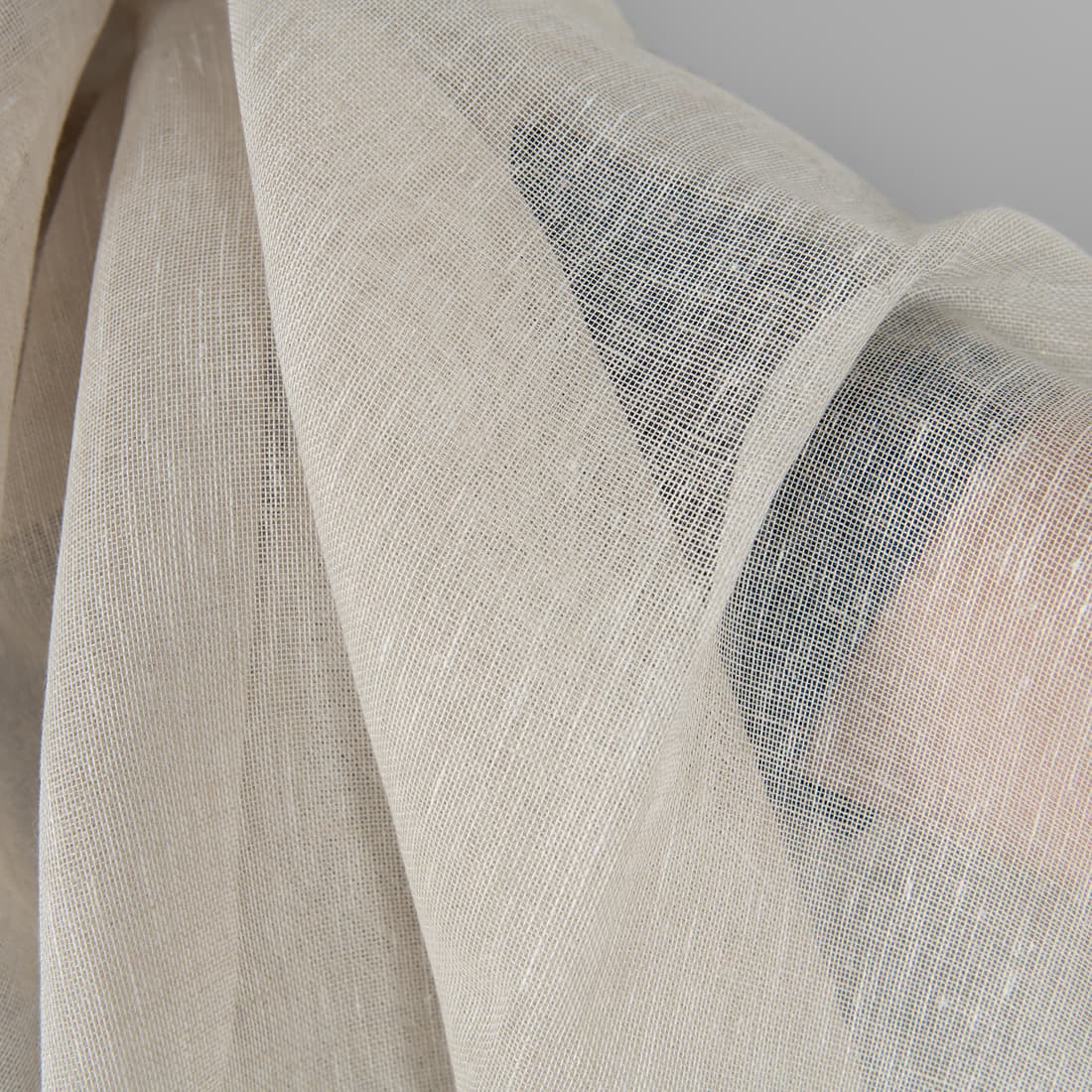 Permatomas rusvas lininis audinys. Šiam audiniui naudoti balti ir rusvi verpalai. Lengvas, ypač retas, plonas lininis audinys puikiai tiks užuolaidoms, šalikams ir kitiems aksesuarams.