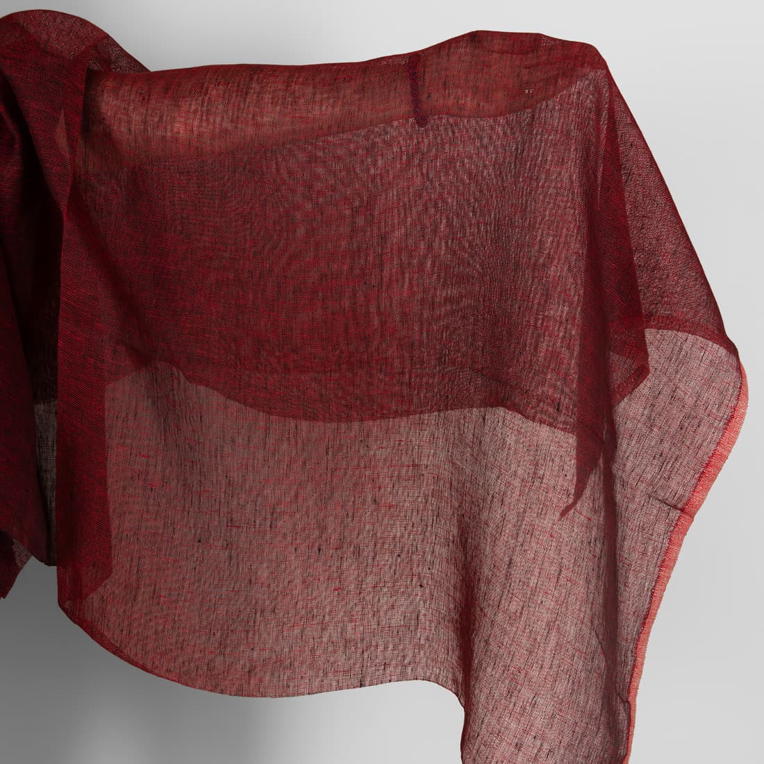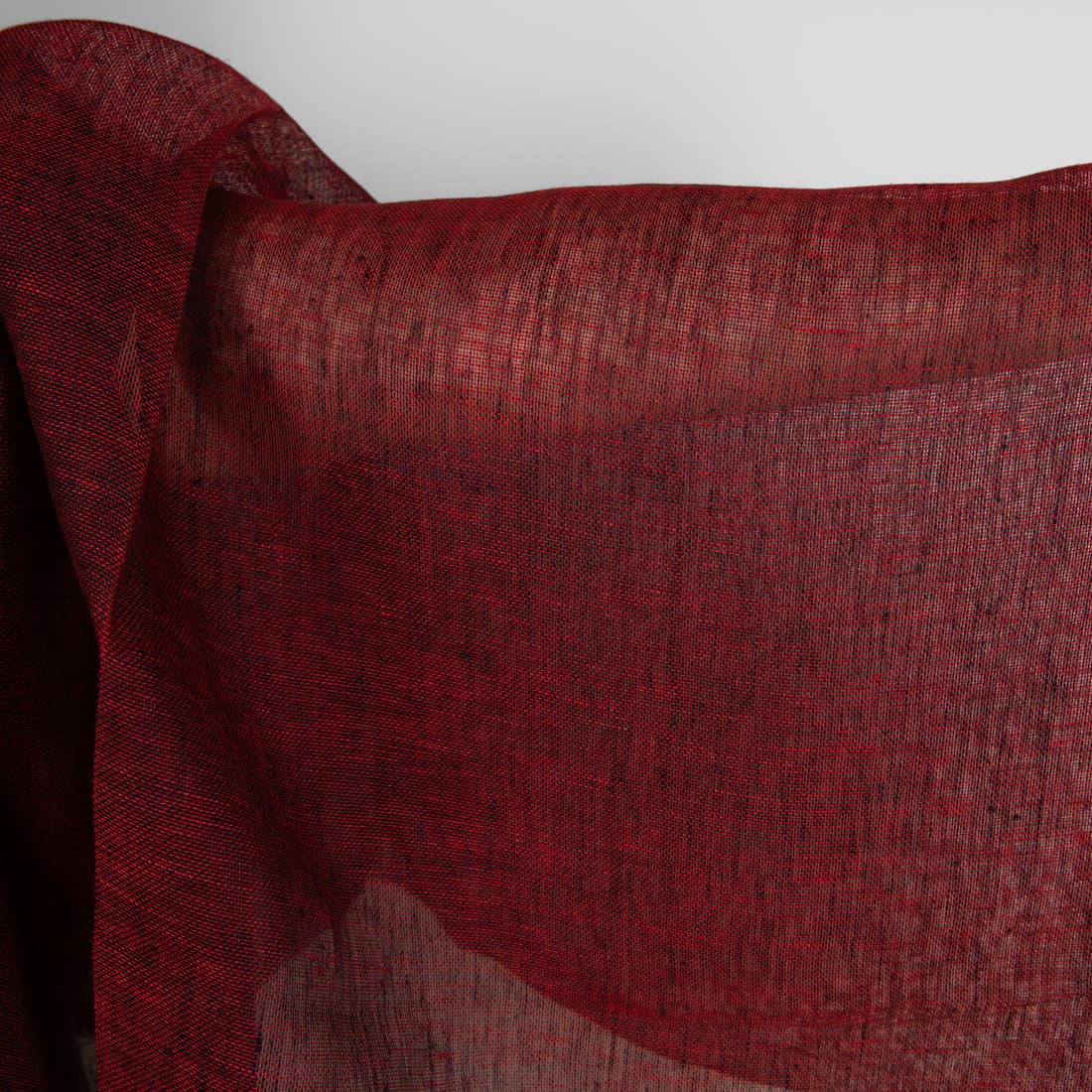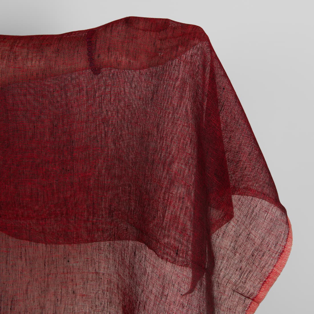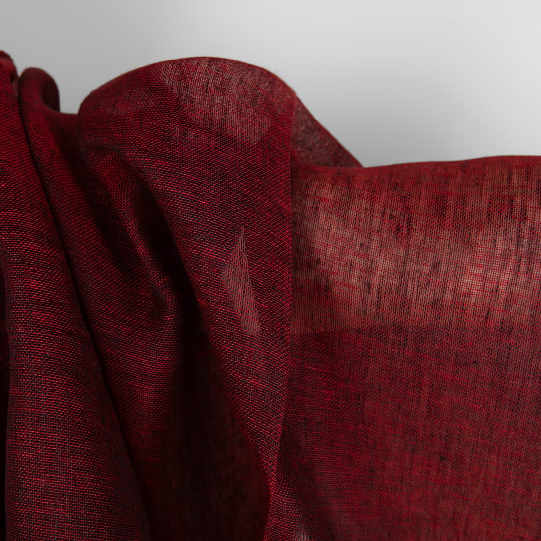 Permatomas lininis audinys išaustas derinant raudoną ir juodą spalvą, tai itin sodri, ryški ir prabangi spalva. Plonas, ypatingai retas ir lengvas. Puikiai tiks šalikams, aksesuarams, užuolaidoms, stalo gaminiams.