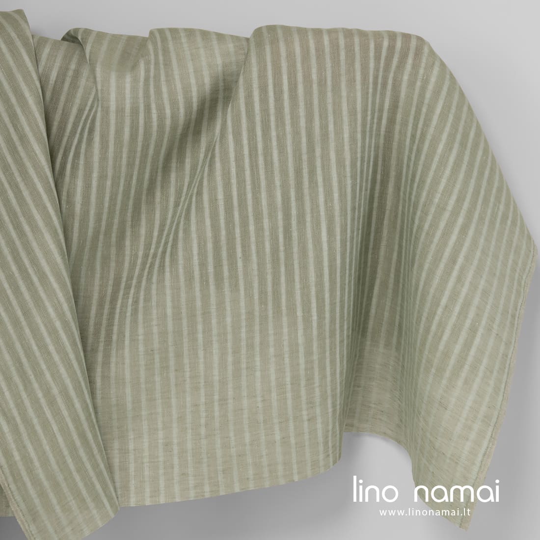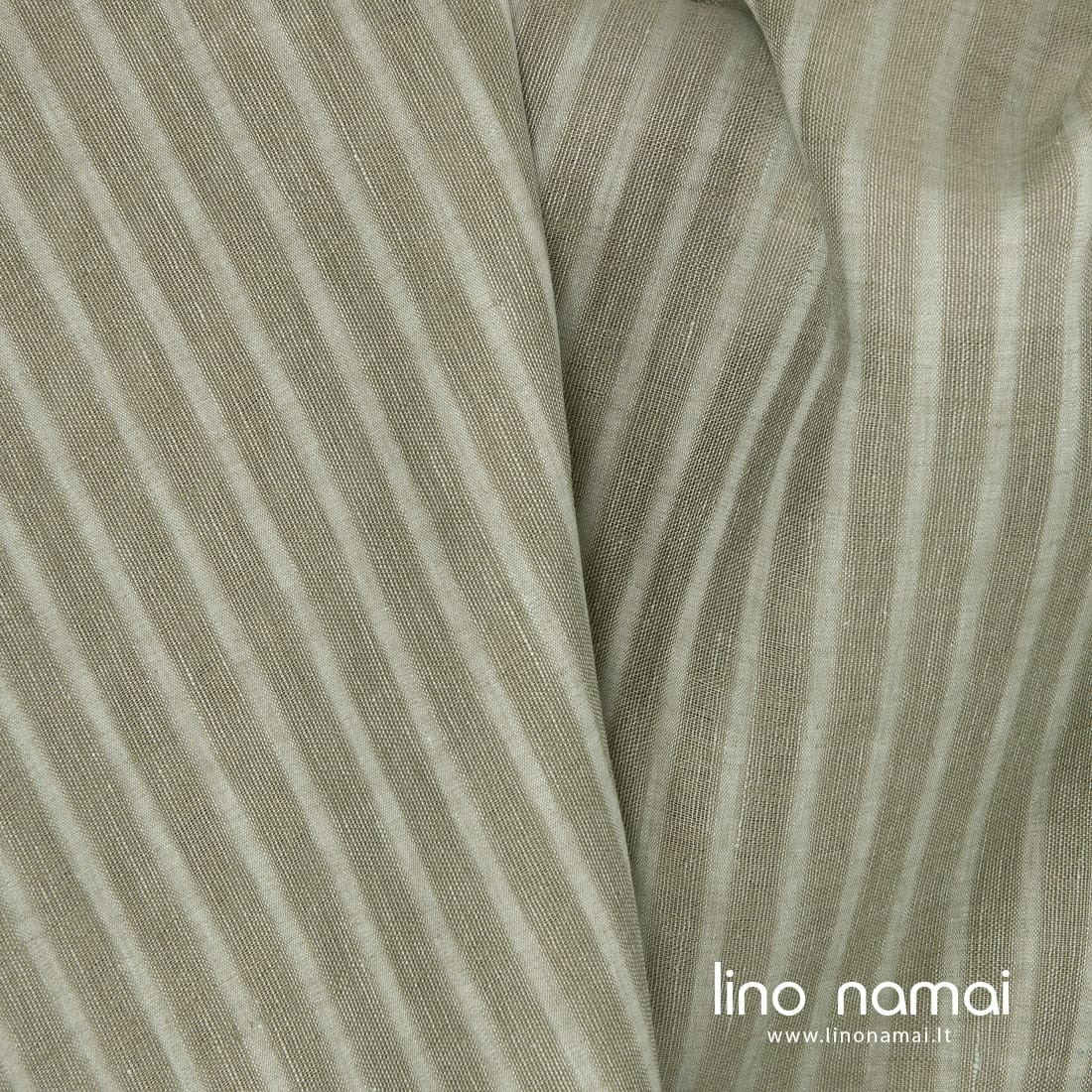 Žalsvas lininis audinys ažūrinėmis (permatomomis) ir tankiomis vertikaliomis juostelėmis. Išaustas iš sendintos žalios ir švelnios mėtinės spalvos verpalų. Šis linas lengvas, tinkamas užuolaidoms, šalikams, skaroms siūti.