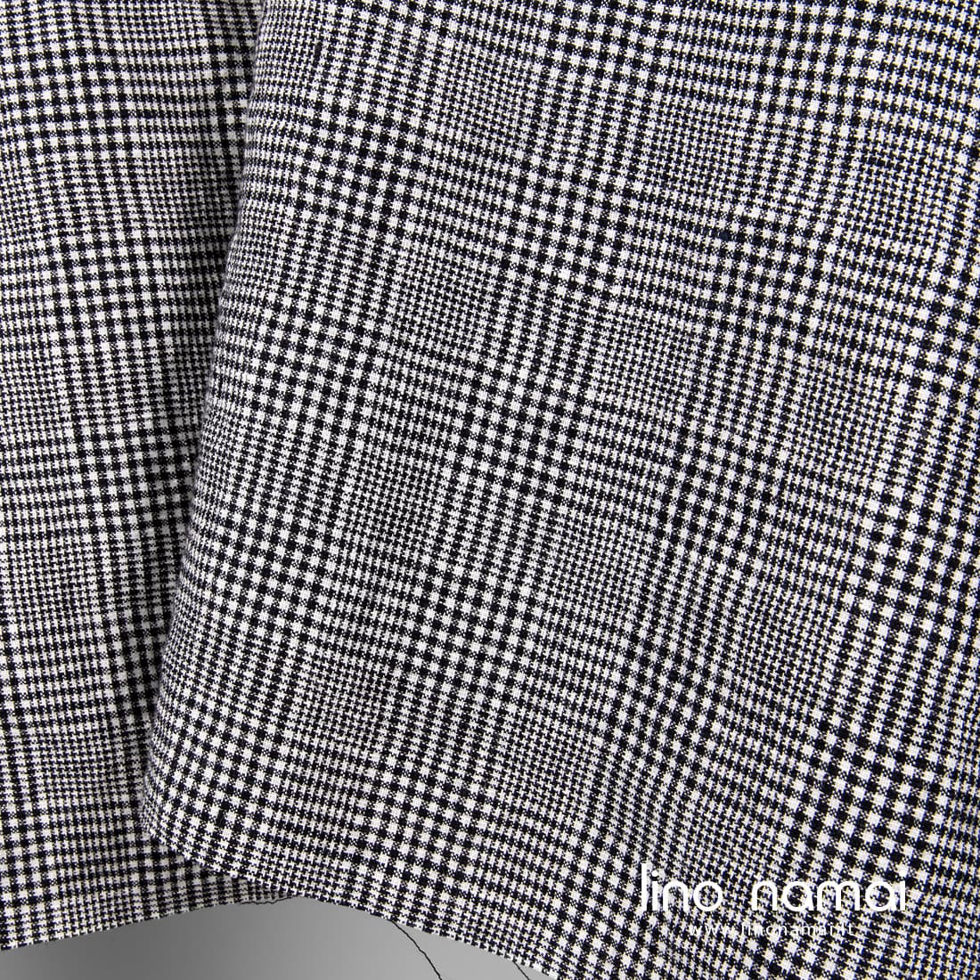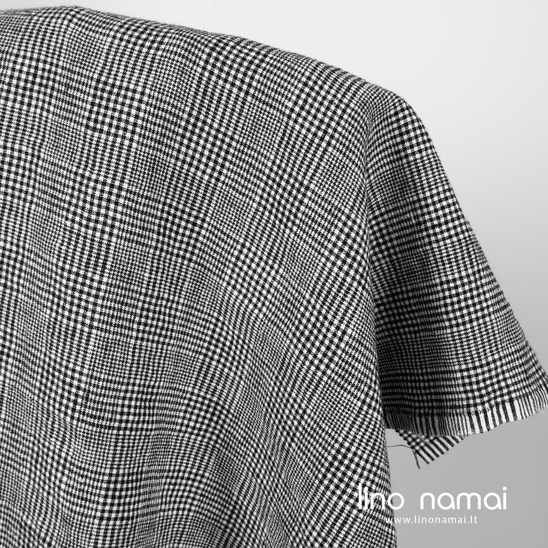 Lino-vilnos audinys juodais langeliais, kuriuos išaudėme iš pieno baltumo (gelsvai baltų), juodų ir tamsiai mėlynų verpalų. Tvirtas, tankus, vidutinio storio audinys po specialaus skalbimo tapo minkštas, švelnus. Siūkite skaras, šalikus, drabužius.