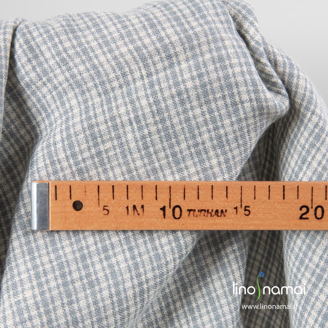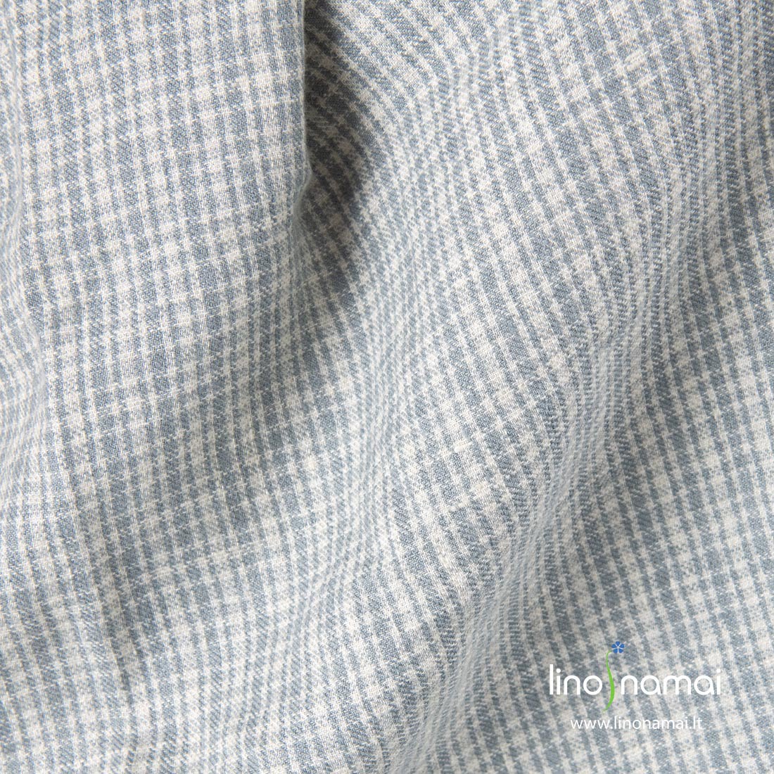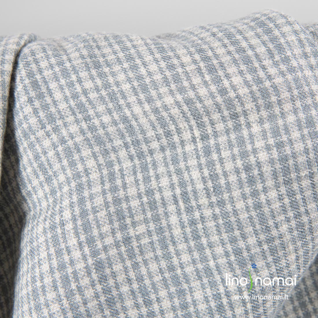 Lino-vilnos audinys pilkai languotas, skalbtas. Šį audinį išaudėme iš gelsvų ir pilkų lino ir vilnos verpalų smulkiu raštu. Specialus skalbimas suteikė jam minkštumo, švelnumo, sumažino traukimąsi. Siukite šiltus drabužius, skaras, šalikus, pledukus.