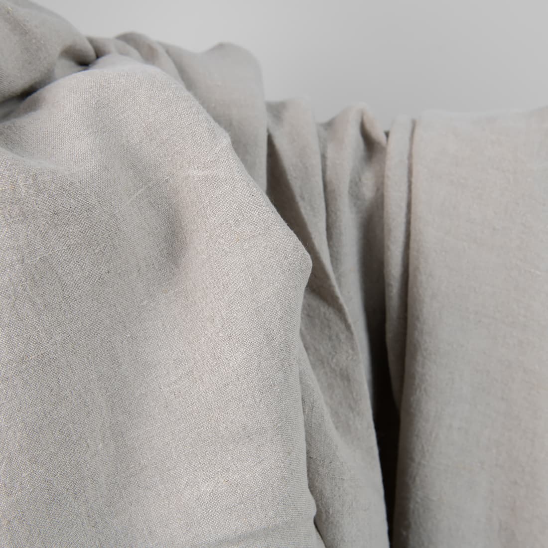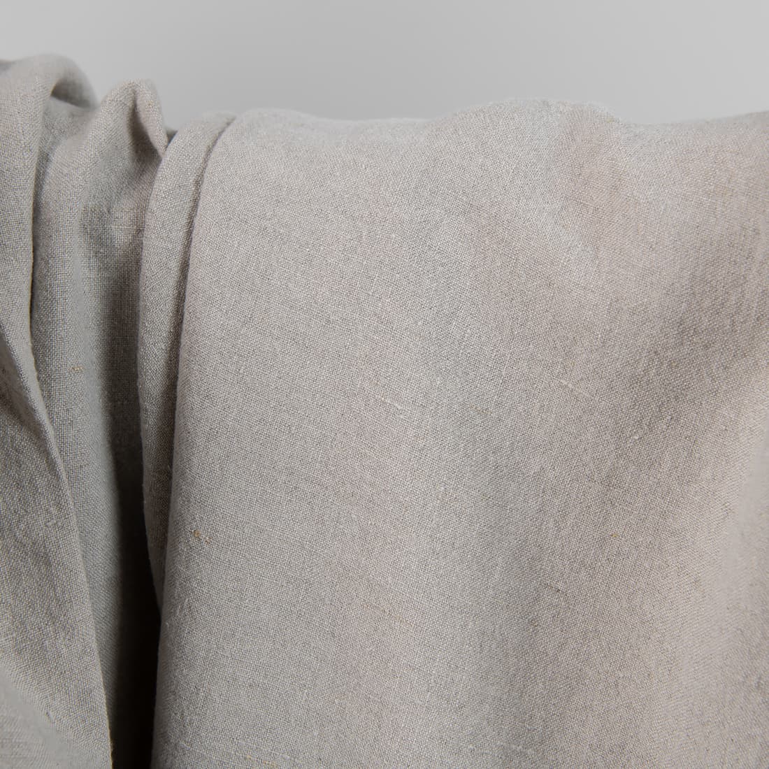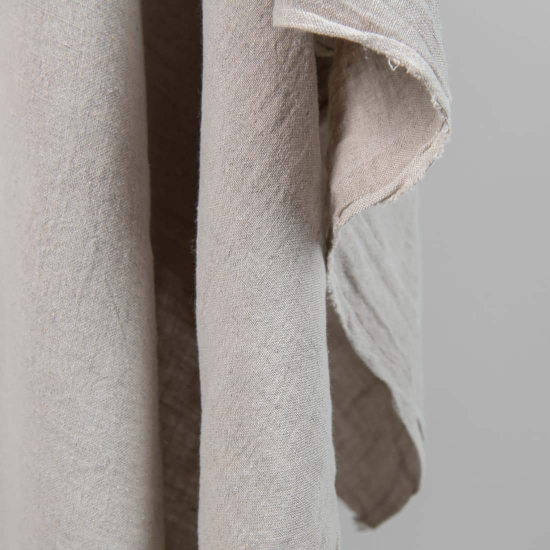 Lininis audinys natūralios pilkos spalvos. Platus (apie 285cm pločio). Skalbtas specialiu būdu, todėl minkštesnis, švelnesnis nei neskalbtas linas, taip pat įgavęs glamžytą paviršiaus struktūrą (Galite taupydami laiką net nelyginti. Šis audinys toks ir turi būti). Dar vienas privalumas - nebesitrauks skalbiamas. Labai tvirtas, tankus, vidutinio storio.