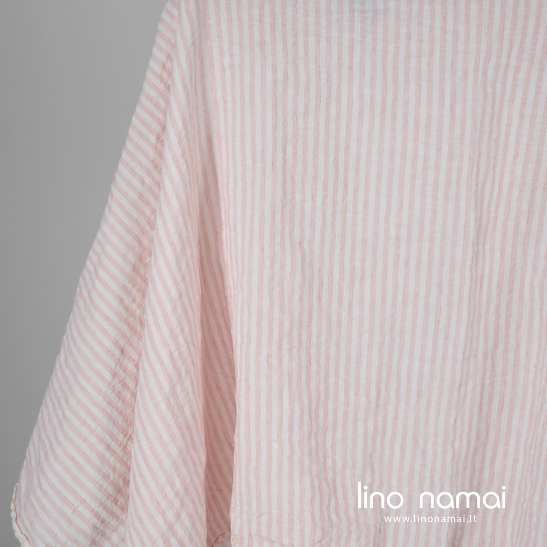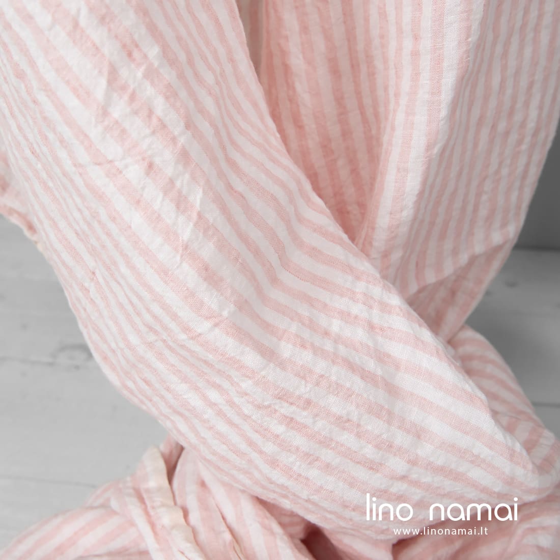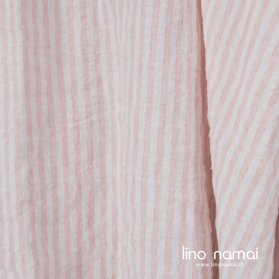 Lininis audinys vertikaliais siaurais šviesiai rožiniais dryžiais ryškiai baltame fone. Tvirtas, tankus, vidutinio storio linas buvo išskalbtas specialiu būdu, kad suminkštėtų, taptų švelnus, nebesitrauktų. Šį audinį, skirtą drabužiams ir namų tekstilei, siūlome 295cm pločio.