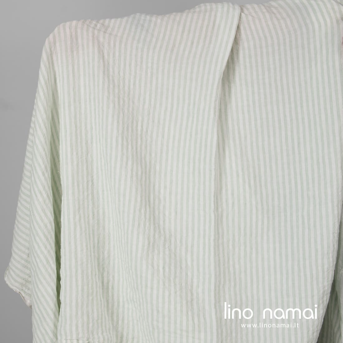 Lininis audinys vertikaliais siaurais šviesiai žaliais dryžiais ryškiai baltame fone. Tvirtas, tankus, vidutinio storio linas buvo išskalbtas specialiu būdu, kad suminkštėtų, taptų švelnus, nebesitrauktų. Šį audinį, skirtą drabužiams ir namų tekstilei, siūlome 295cm pločio.