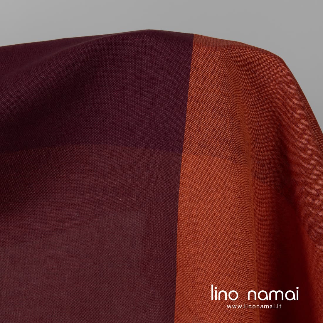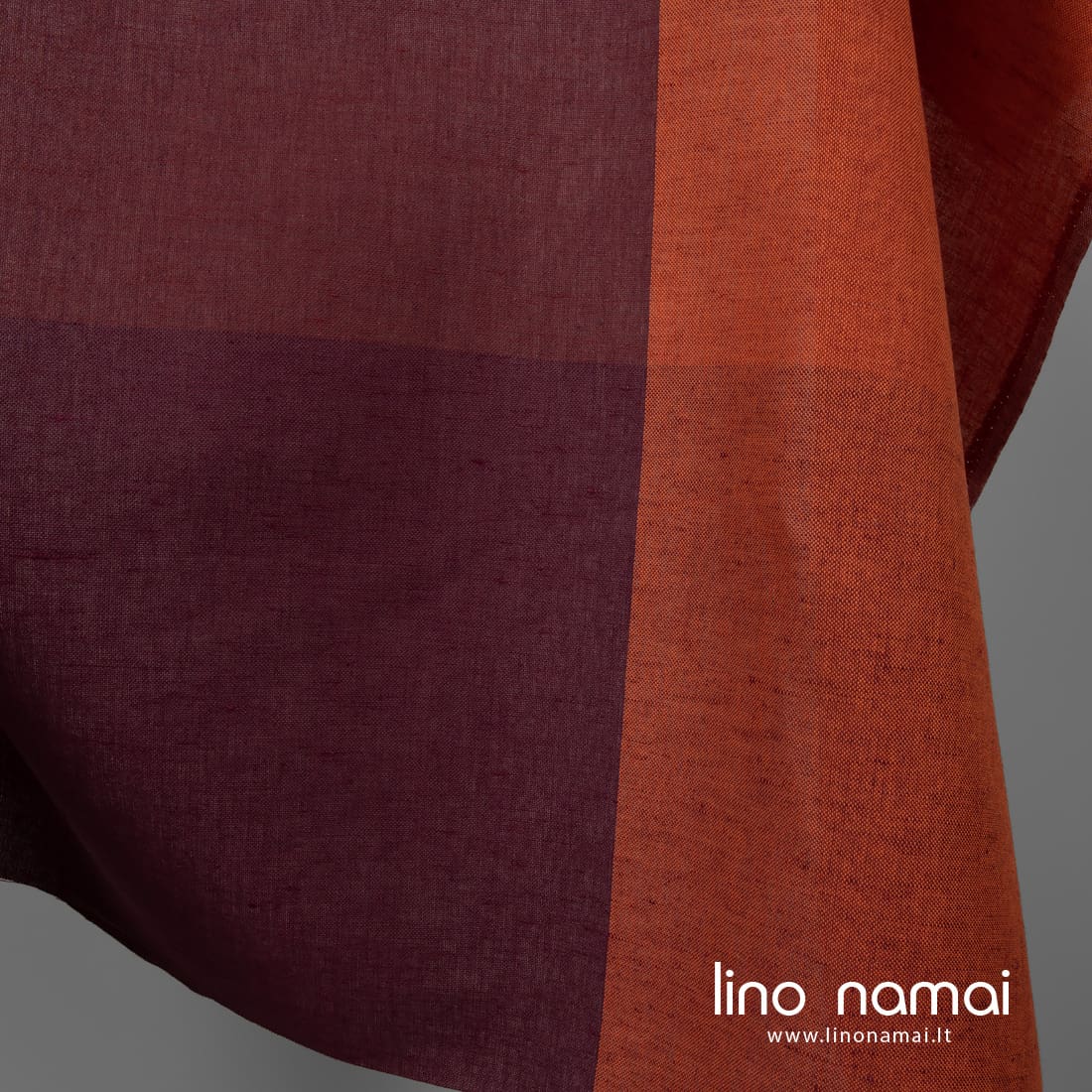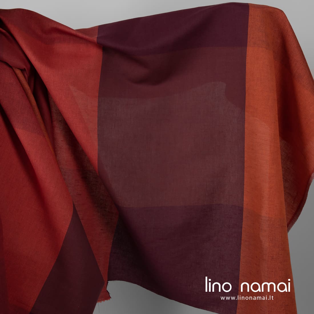 Lino - medvilnės audinys plačiomis juostomis, sudarančiomis didelius langelius. Audinys išaustas iš oranžinių, violetinių, raudonų ir tamsiai raudonų verpalų. Tvirtas, tankus, vidutinio storio. Didelis plotis (280cm!) idealiai tinka didelių išmatavimų staltiesėms, užuolaidoms, paklodėms, antklodžių užvalkalams pasiūti.