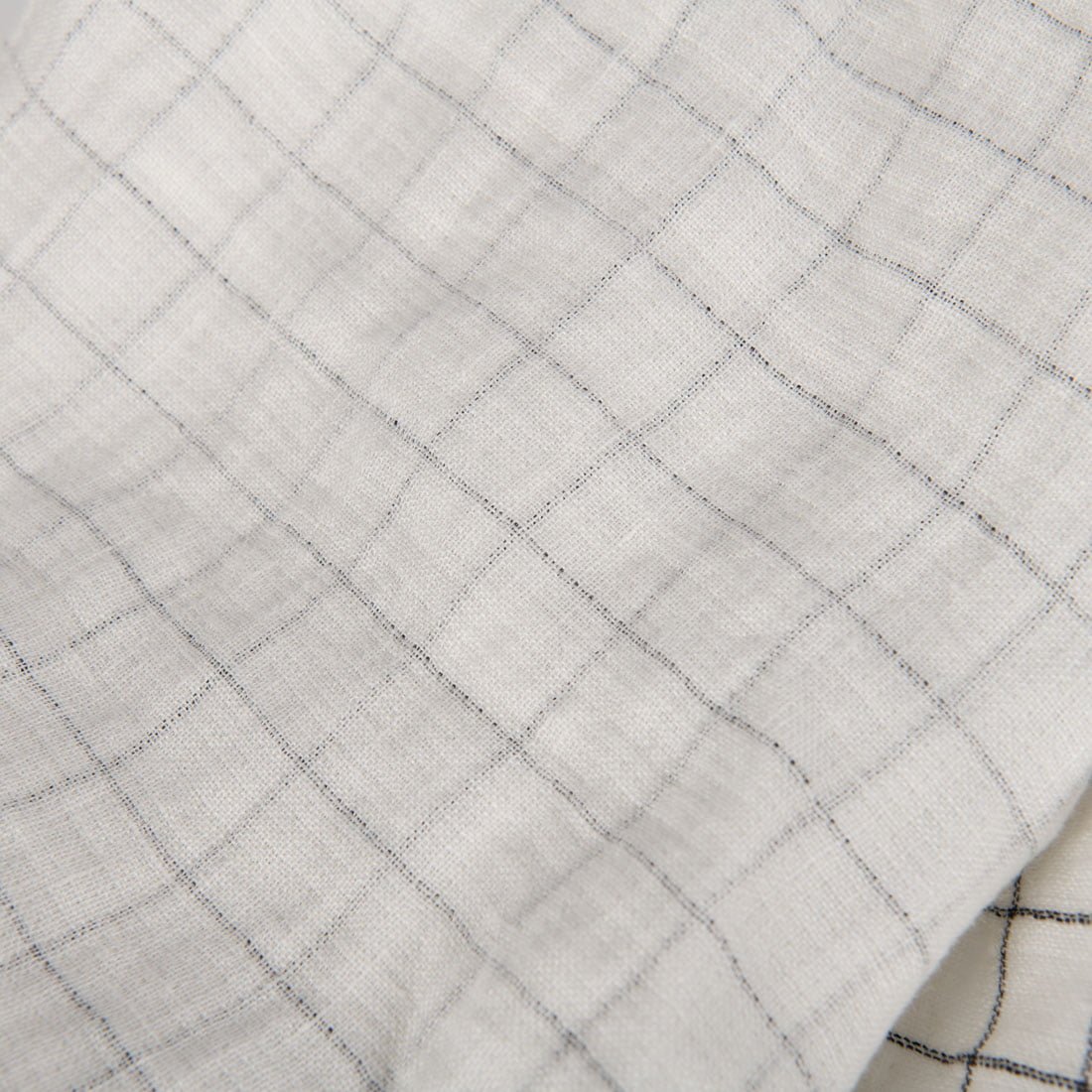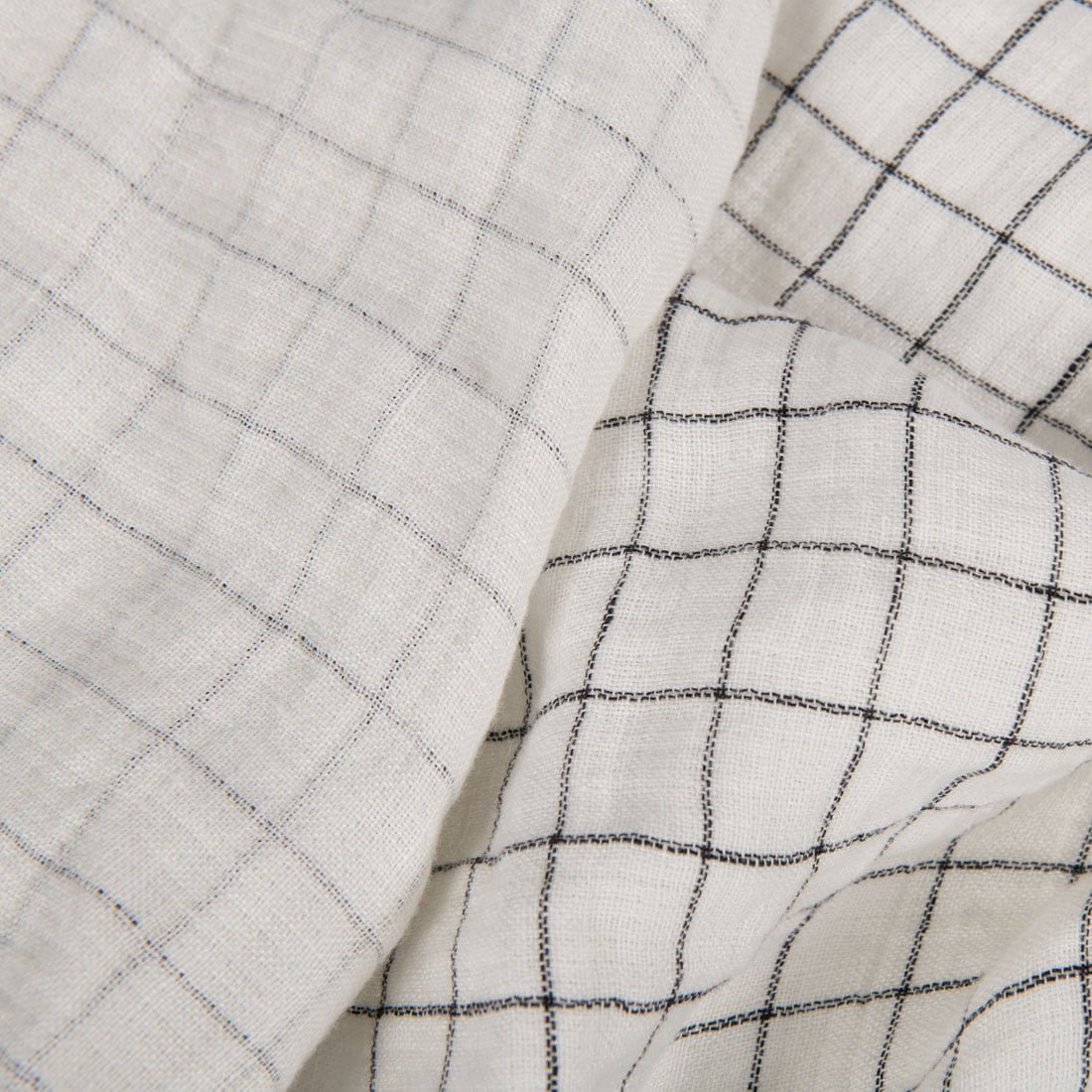 Baltas (pieno baltumo) lininis audinys su juodais 2cm x 2cm dydžio langeliais yra dvisluoksnis ir dvipusis: vienoje pusėje langeliai yra ryškesni nei kitoje. Tvirtas, tankiai suaustas, vidutinio storio. Skalbtas specialiomis technologijomis, kad taptų minkštas, švelnus ir nebesitrauktų.