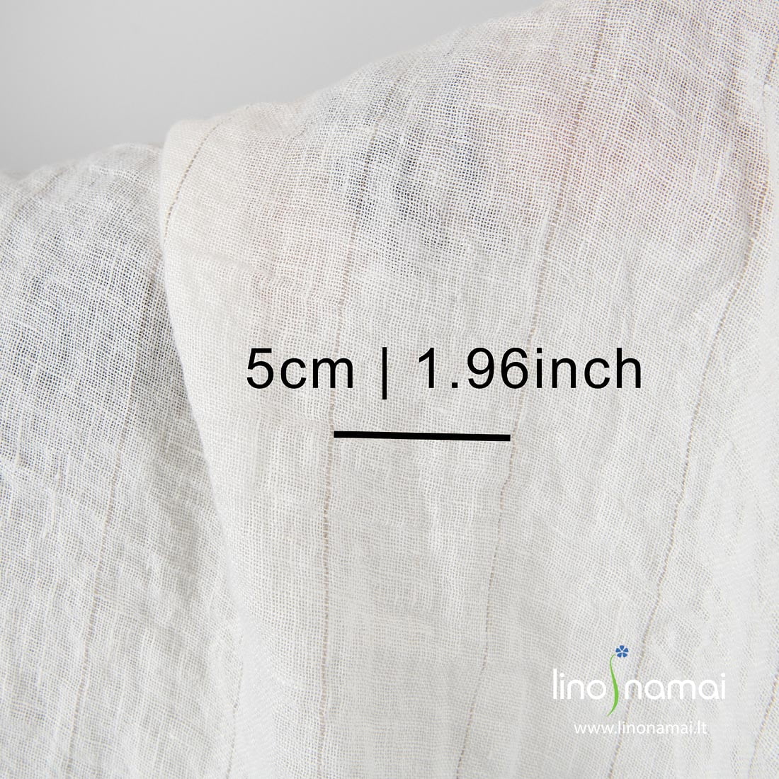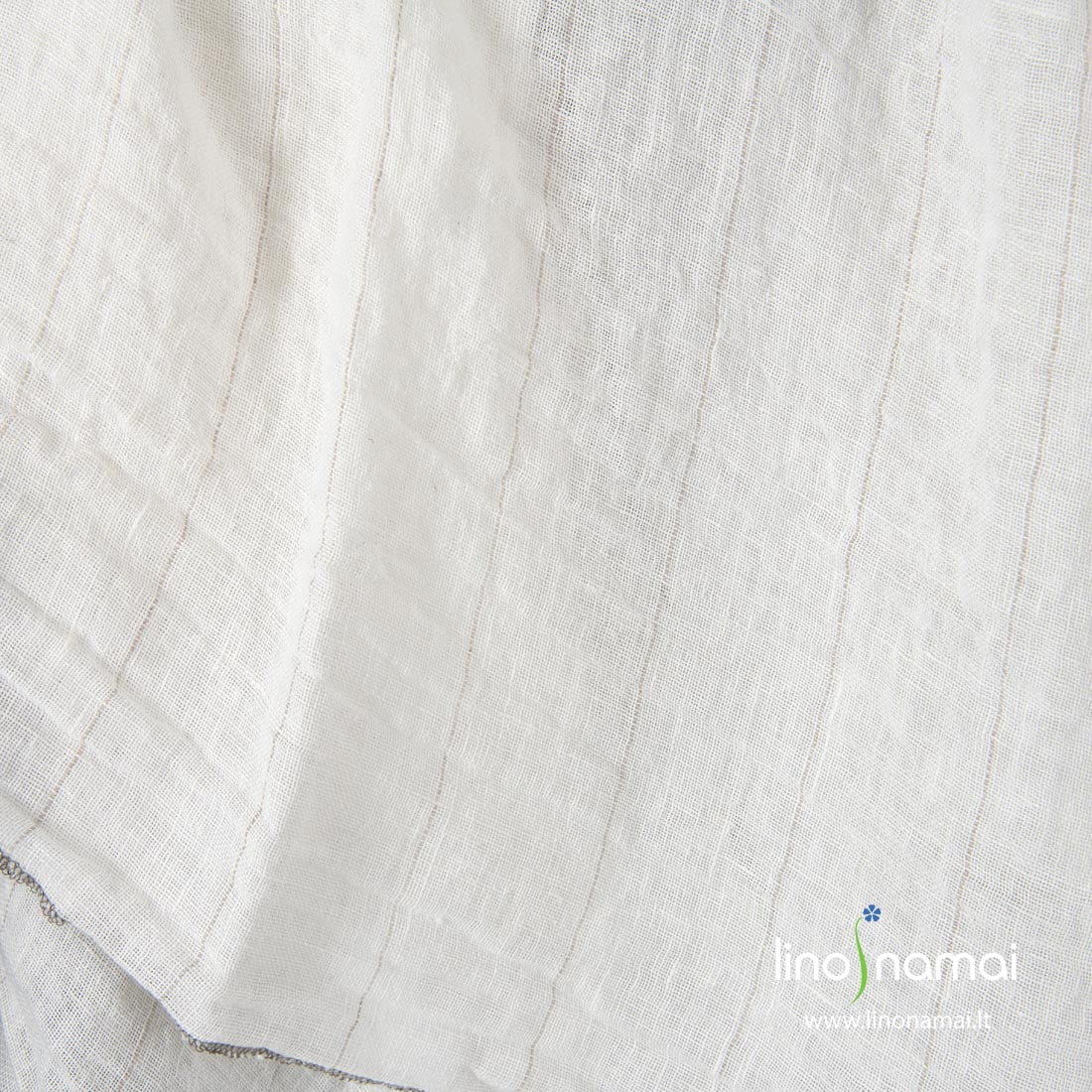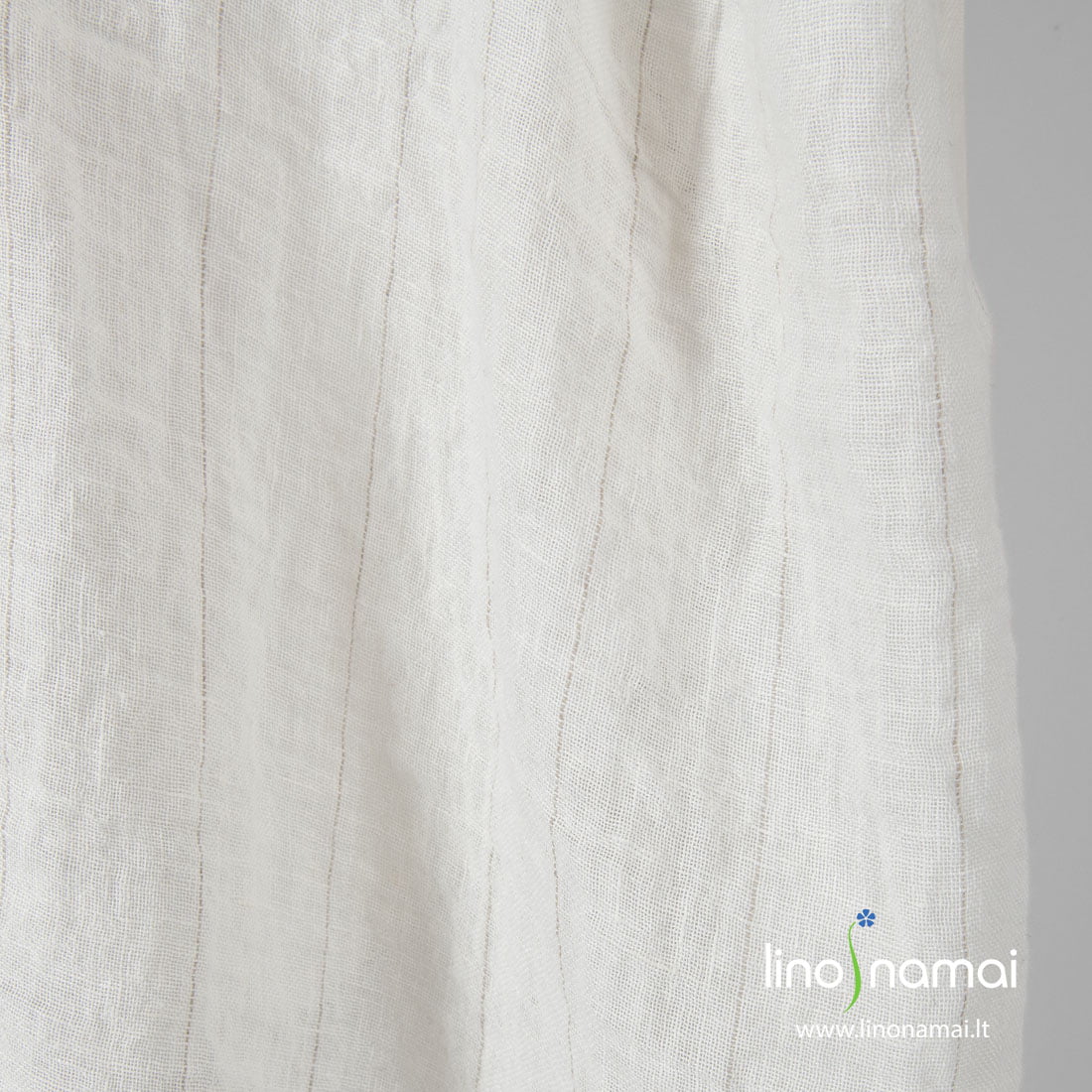 Baltas permatomas lininis audinys pilkais dryžiais, skalbtas. Audinys pieno baltumo (gelsvai baltas), o dryžiai išausti iš natūralios spalvos (nedažytų, rusvai pilkų) lininių verpalų. Lengvas, retas. Minkštumo ir švelnumo šiam linui suteikėme išskalbdami jį specialia technologija.