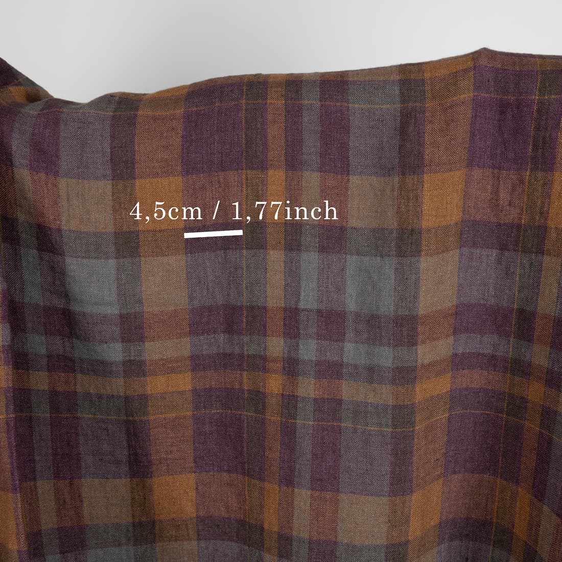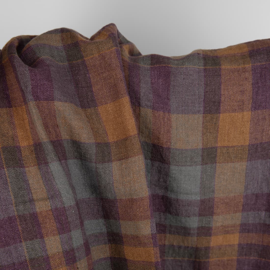 Languotas minkštas violetinis lino audinys. Margaspalvių langelių raštas buvo išaustas panaudojus violetinius, rudai gelsvus, tamsiai pilkus ir melsvai pilkus verpalus. Audinys buvo specialiai išskalbtas, todėl atrodo glamžytas ir ateityje daugiau nebesitrauks.