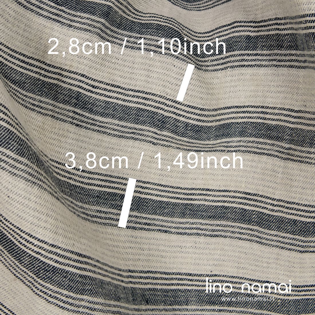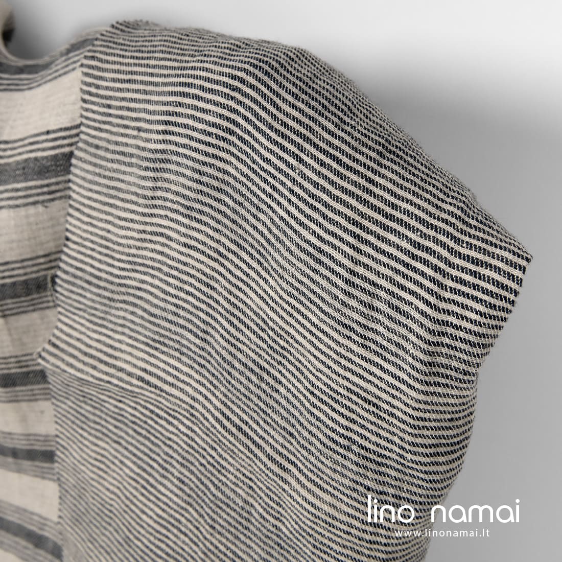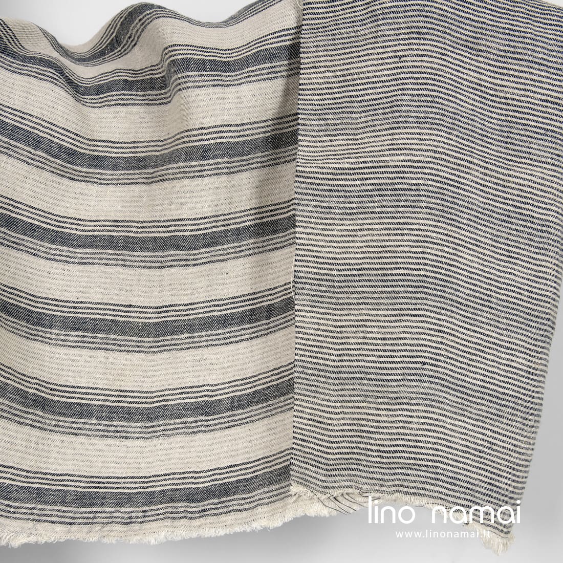 Lininis audinys dryžuotas dvipusis skalbtas. Išaustas įstrižais ruoželiais iš gelsvai baltų, pilkšvų ir mėlynai juodų verpalų. Viena audinio pusė su plačiais, kita - su siaurais dryžiais. Skalbtas specialiu būdu, todėl minkštas, švelnus, malonus odai, ypač tinka drabužiams, šalikams ir namų tekstilei siūti.