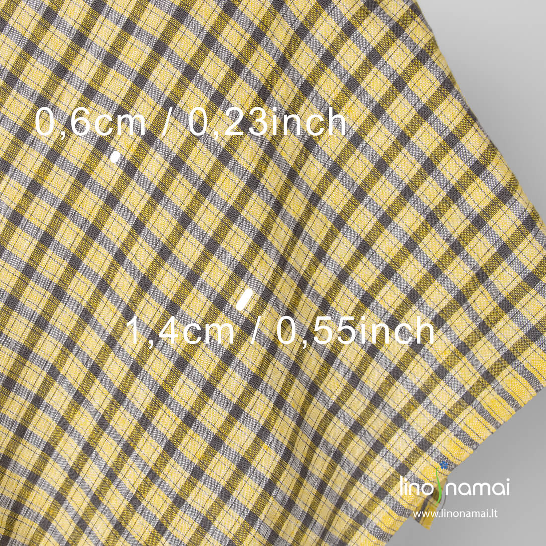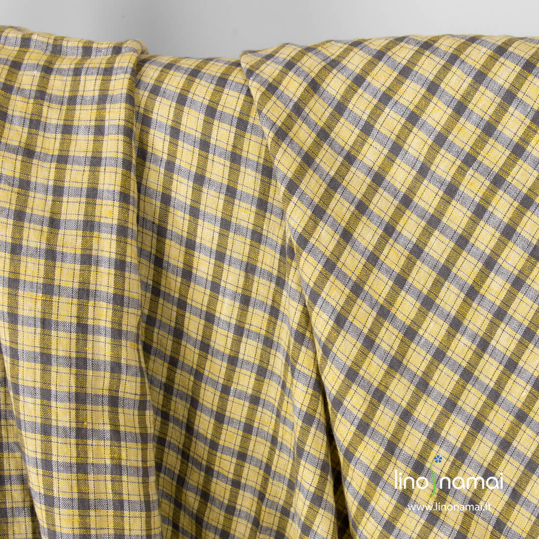 Lininis audinys geltonais, pilkai rudais (antracito spalvos) langeliais yra tankus, tvirtas, vidutinio storio. Išskalbėme jį specialia technologija, kad suteiktumėme minkštumo ir švelnumo. Nebesitrauks pakartotinai skalbiamas.