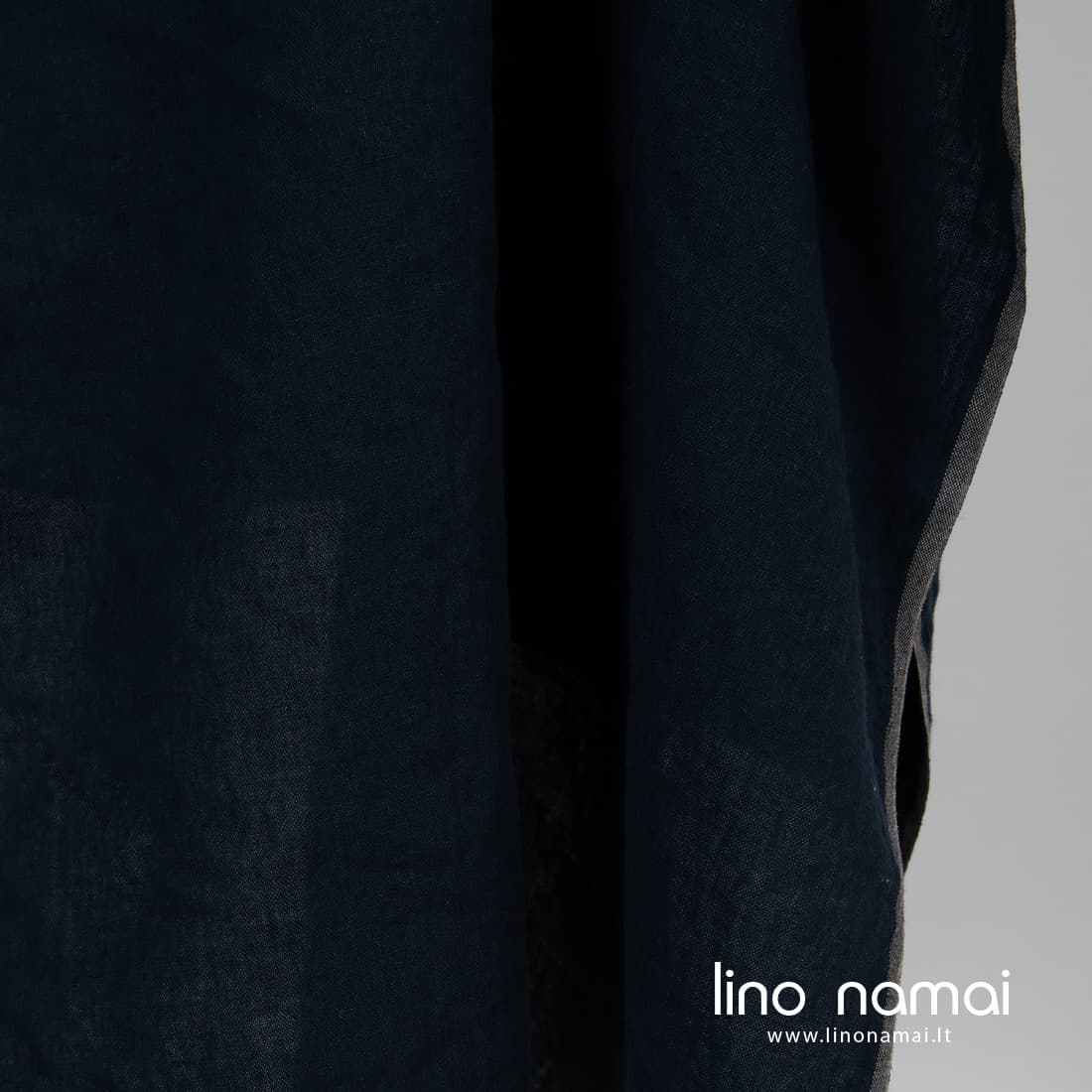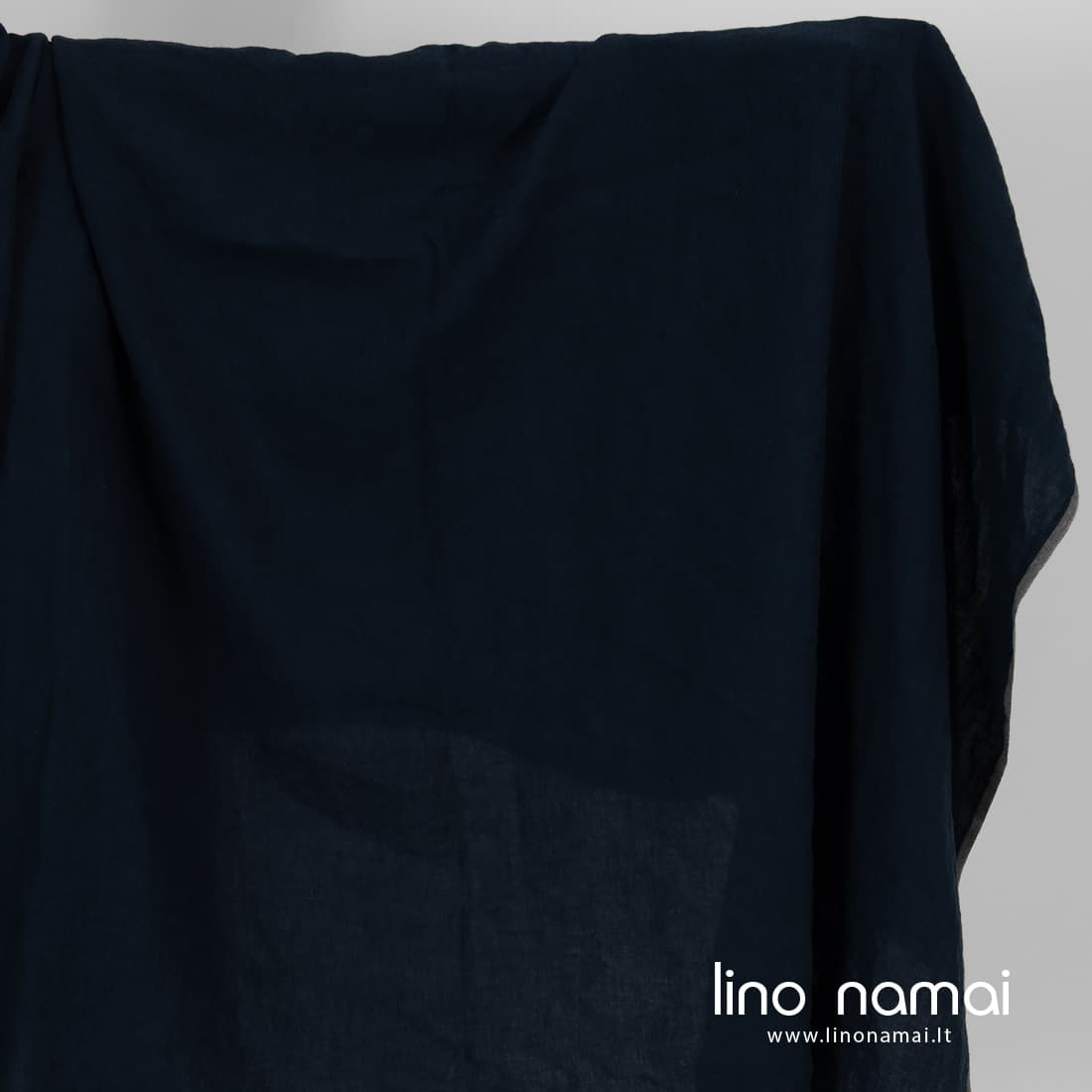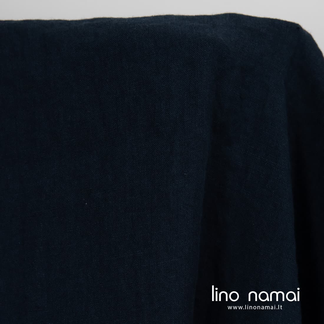 Lininis audinys mėlynai juodas: jame suausti juodi su mėlynu atspalvių verpalai. Tvirtas, tankus, vidutinio storio. Šį liną išskalbėme specialia technologija, jis minkštas, švelnus, malonus odai. Siūkite drabužius ir namų tekstilę.