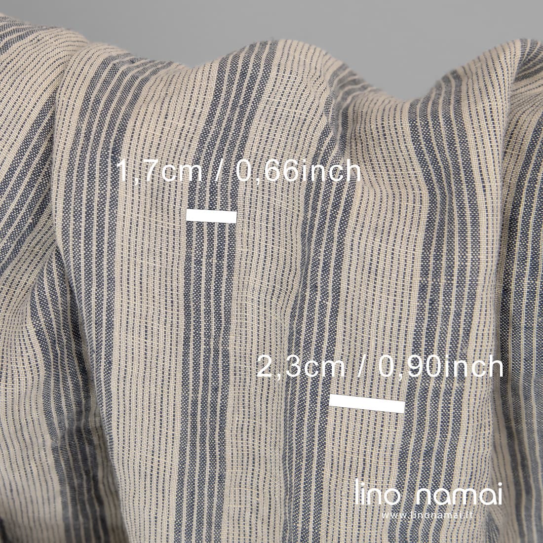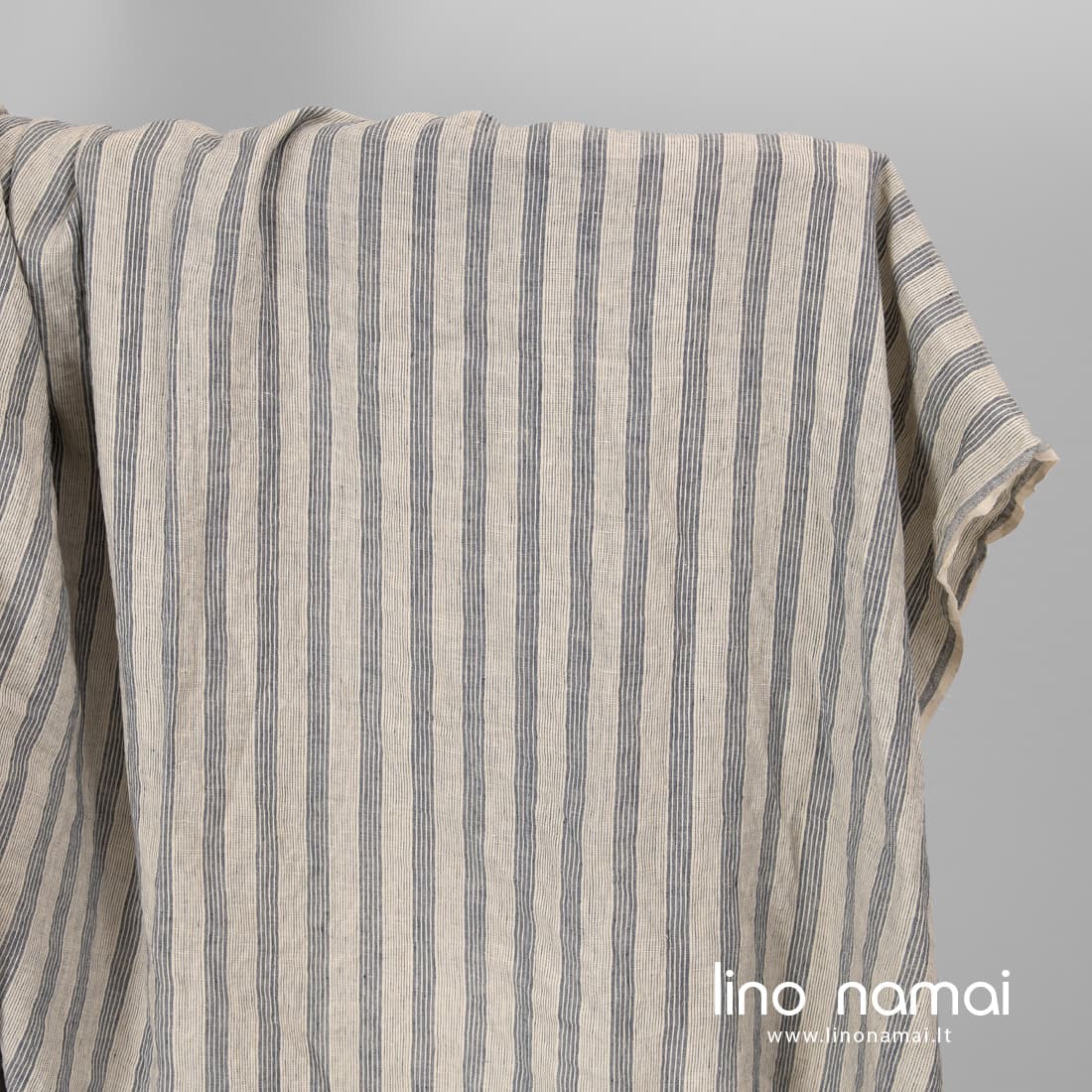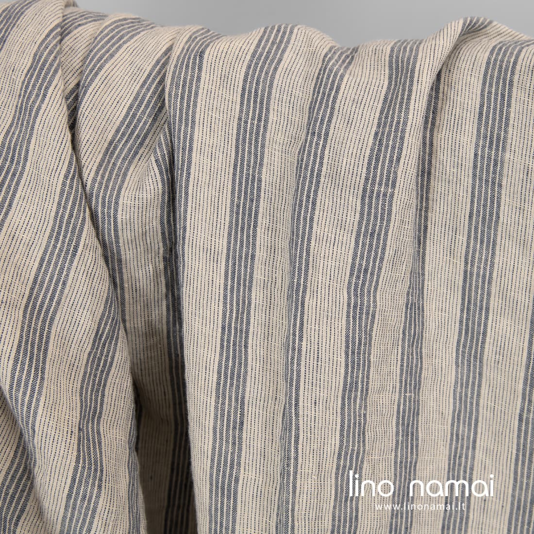 Lininis audinys mėlynais ir gelsvai baltais vertikaliais įvairių pločių dryžiais. Tvirtas, tankus, vidutinio storio. Specialiai skalbtas, todėl minkštas, švelnus, draugiškas odai. Ypač tinka lengviems sijonams, palaidinėms, marškiniams, patalynei, užuolaidoms, staltiesėms siūti.