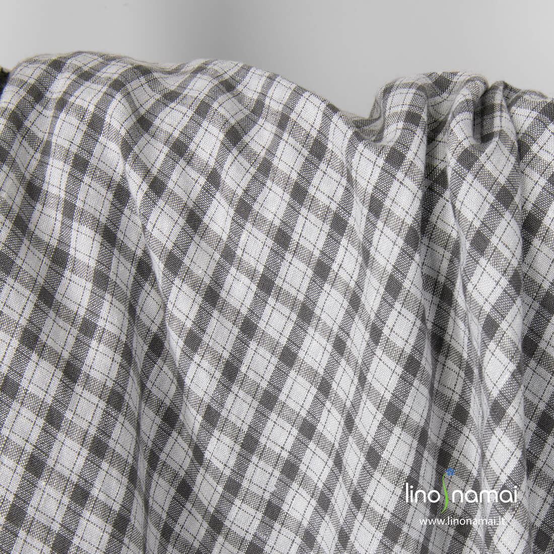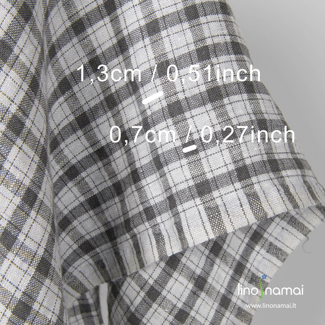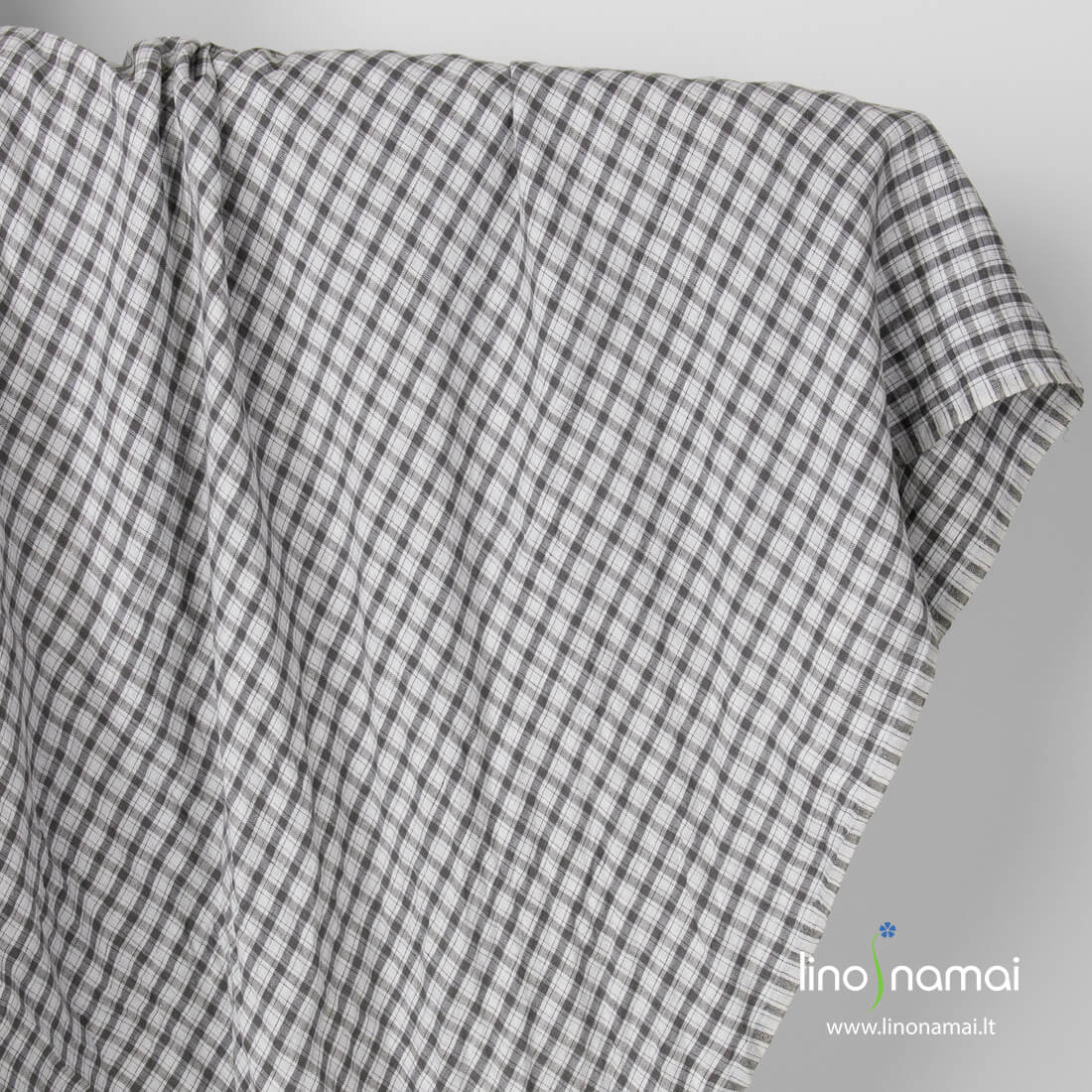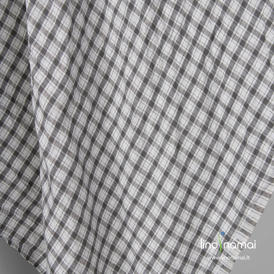 Lininis audinys pilkai rudais (antracito spalvos) langeliais šviesiai pilkame fone skalbtas specialiu būdu, minkštas, švelnus, nebesitrauks skalbiamas. Iš šio tankaus tvirto 100% lino audinio siūkite drabužius, patalynę, staltieses, servetėles, prijuostes, užuolaidas.