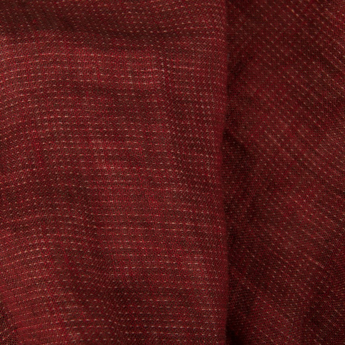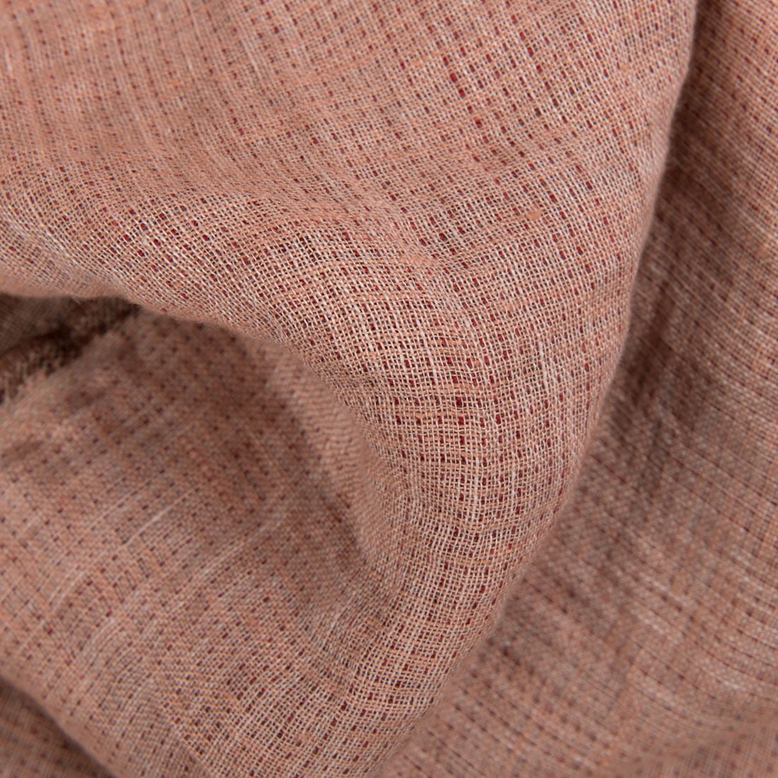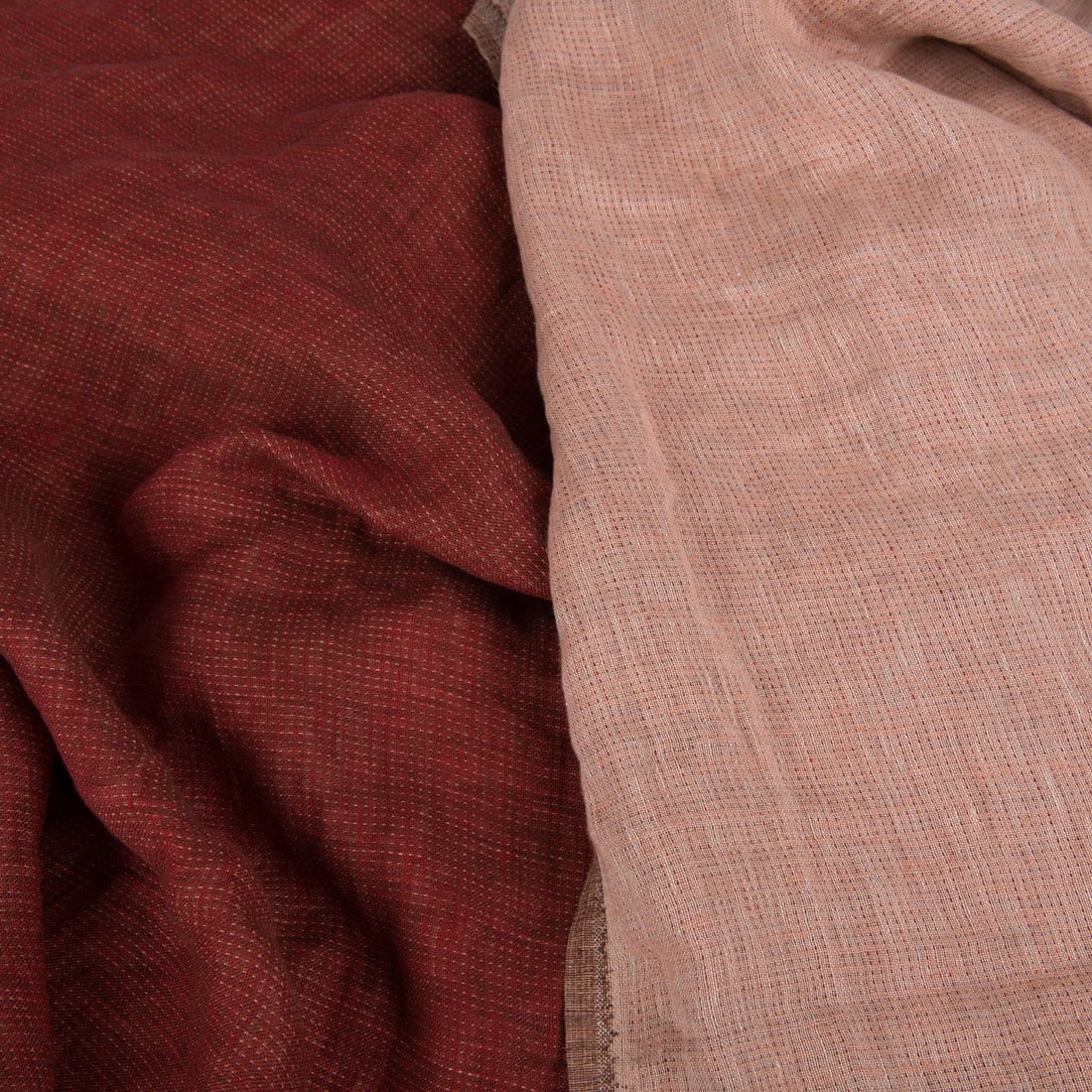 Lininis audinys dvisluoksnis ir dvipusis (siuviniams galite naudoti abi puses): viena pusė tamsiai raudona su mažais rusvais punktyrais / taškiukais, kita pusė švelnios rausvai rusvos spalvos su raudonais taškučiais. Audiniui naudoti keturių spalvų verpalai: skaisčiai raudoni, balti, tamsiai rudi ir pudros (rausvai rusvi, „nude“) spalvos. Minkštas, švelnus, skalbtas specialiu būdu, nebesitrauks. Tvirtas ir tankus.