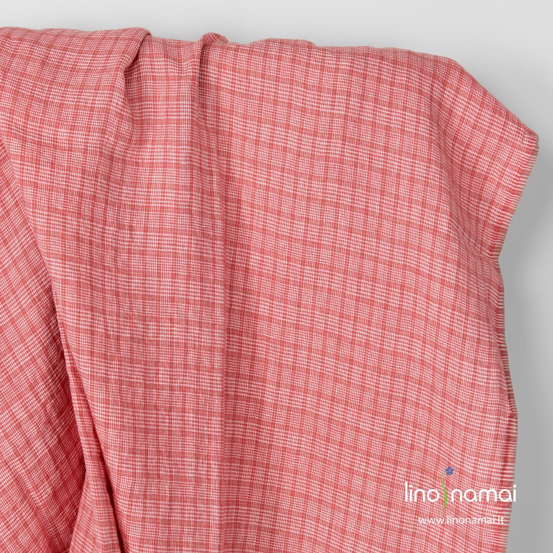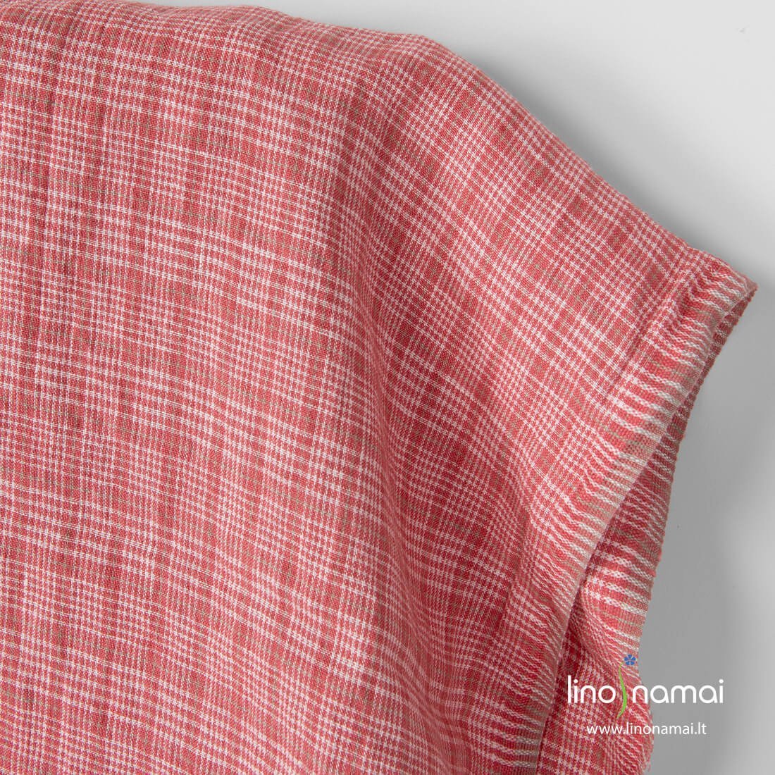Lininis audinys smulkiais rožiniais, pieno baltumo (gelsvai baltais) langučiais ir siauromis smėlio spalvos (rusvai pilkomis) linijomis. Šis lengvas, tvirtas, tankus linas ypač tinka drabužiams, patalynei, stalo gaminiams, užuolaidoms siūti. Skalbtas specialia technologija, todėl minkštas, švelnus, draugiškas odai.