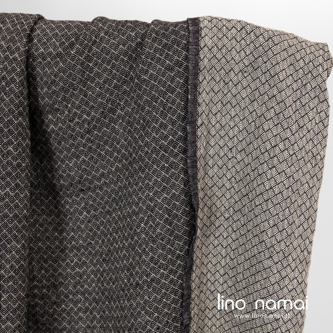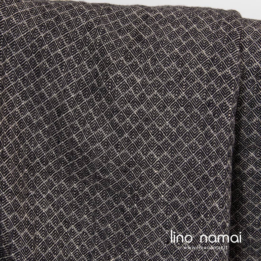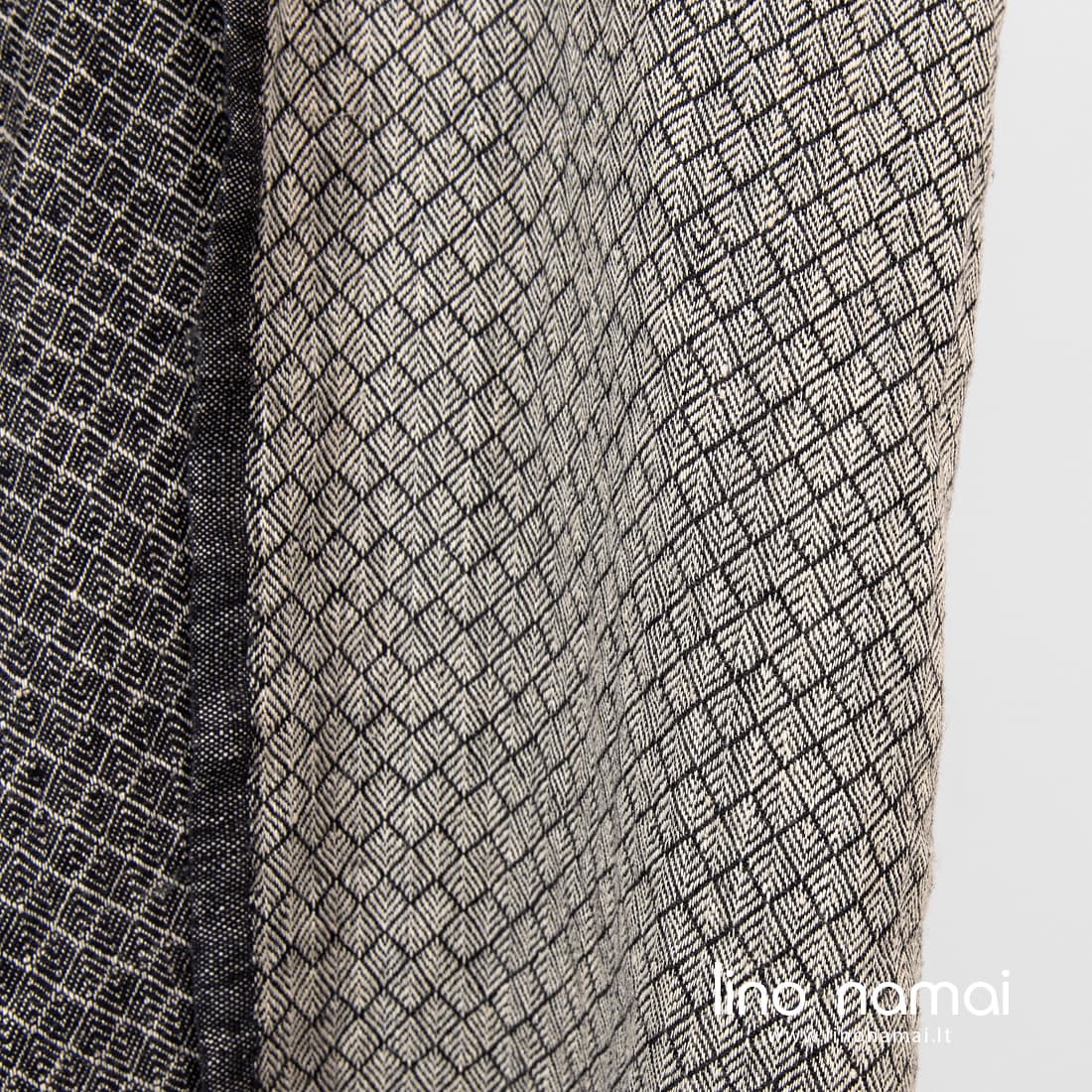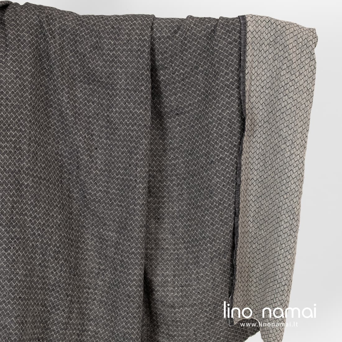 Lininis audinys rusvai juodas raštuotas yra dvipusis: vienoje pusėje dailių rombelių raštas išaustas juodais, kitoje pusėje rusvai pilkais verpalais. Šis linas sunkus, tvirtas, tankus, vidutinio storio. Minkštumo ir švelnumo jam suteikė specialus skalbimas. Iš šio subtiliai dekoratyvaus lino siūkite drabužius, šalikus, skaras, lovų užtiesalus, sofos pagalvėlių užvalkalus.