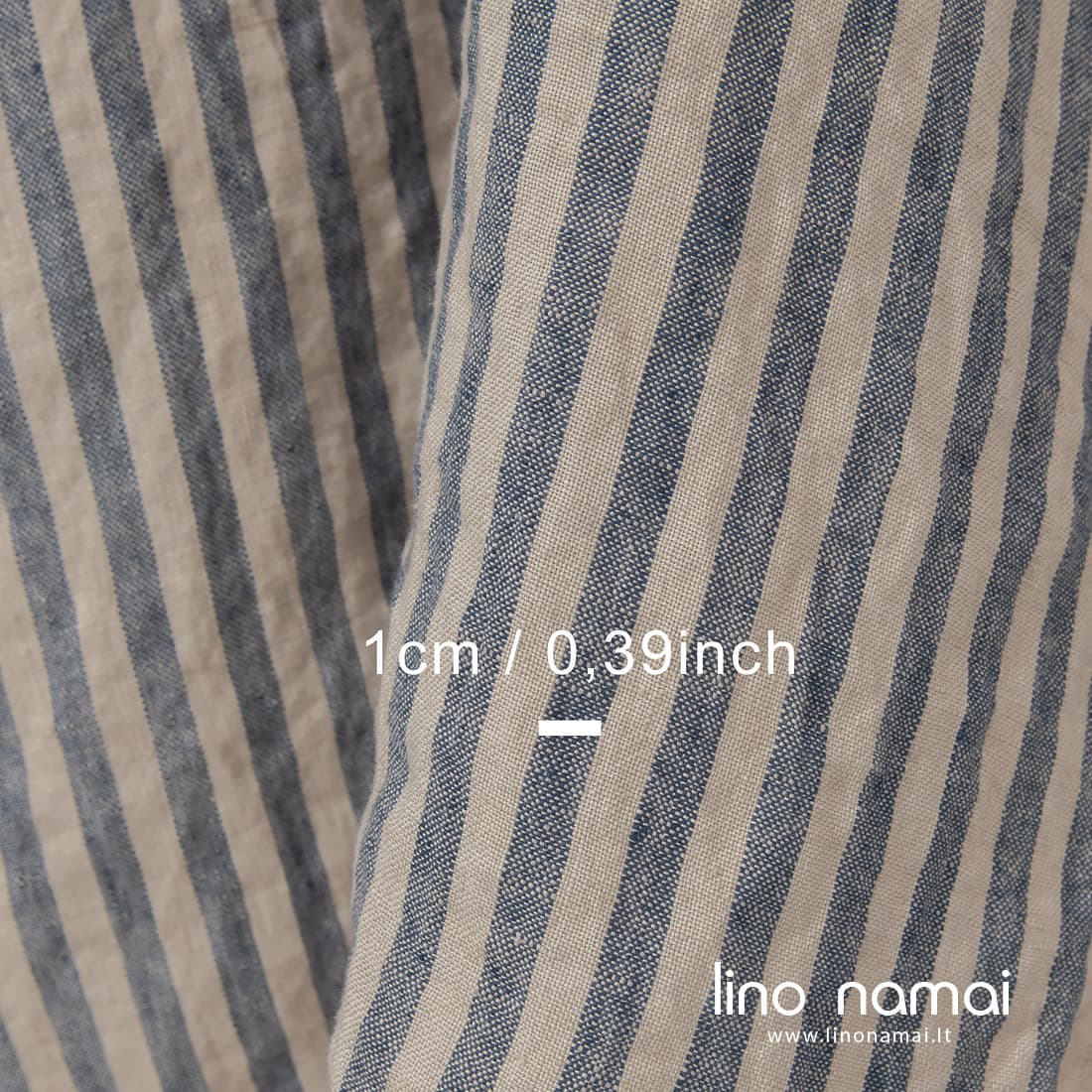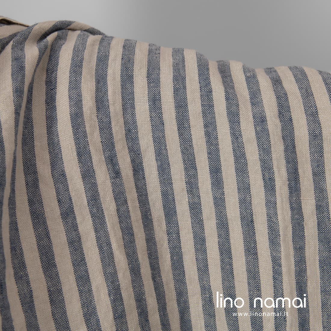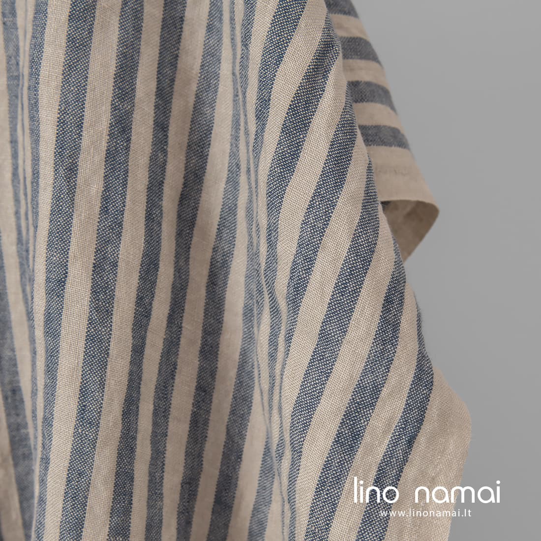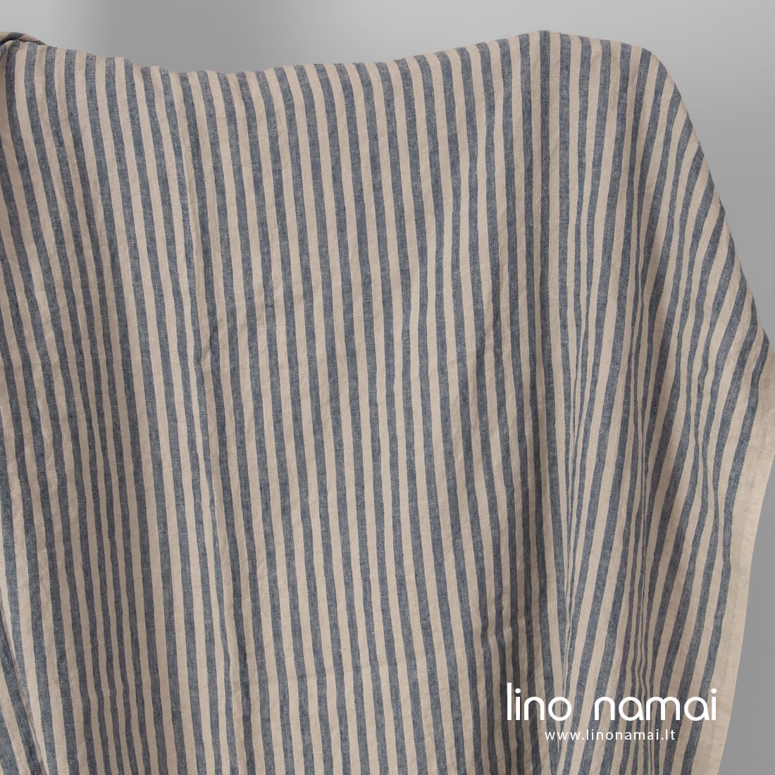 • Dryžuotas lininis audinys išaustas iš balto smėlio spalvos ir tamsiai mėlynų verpalų, skalbtas specialia technologija