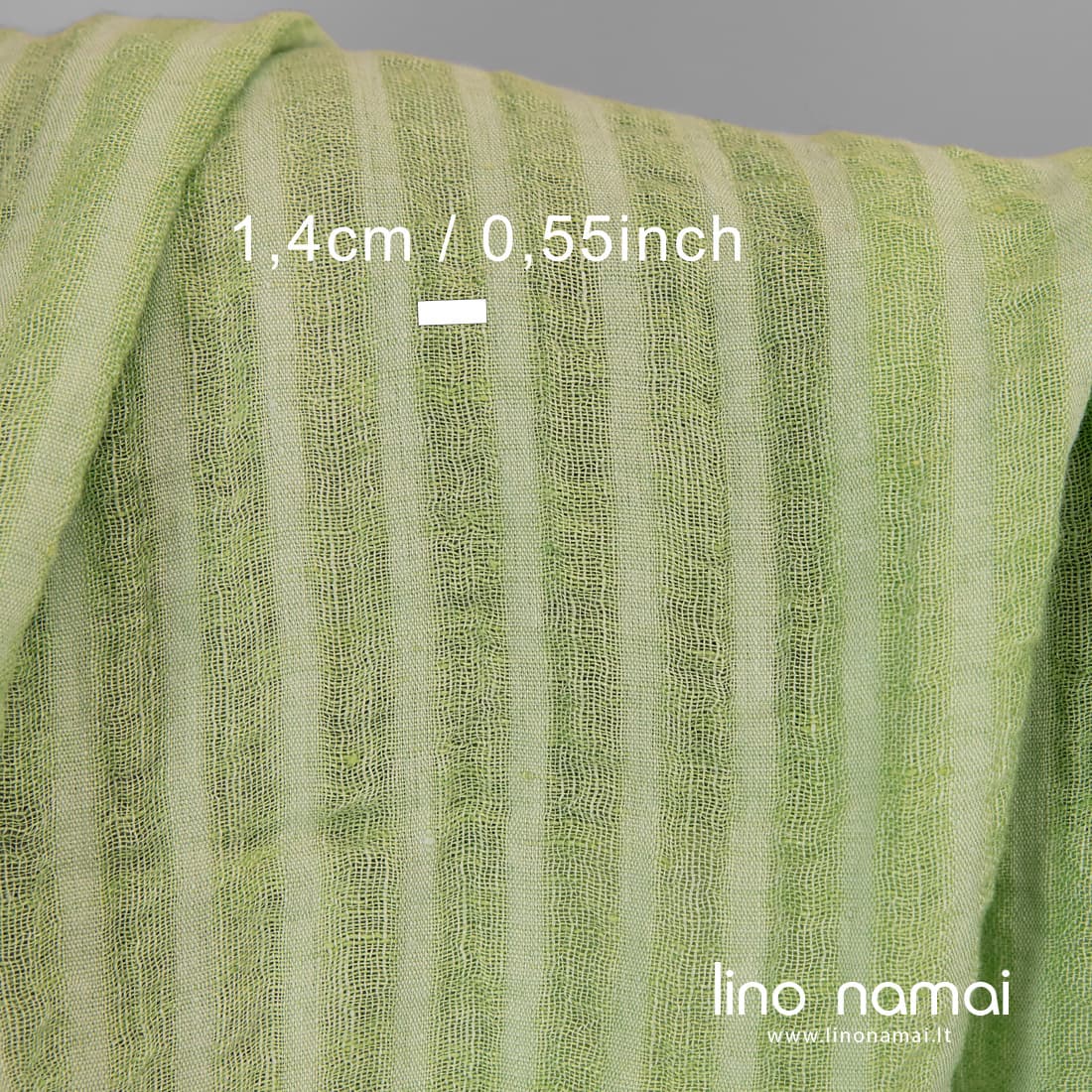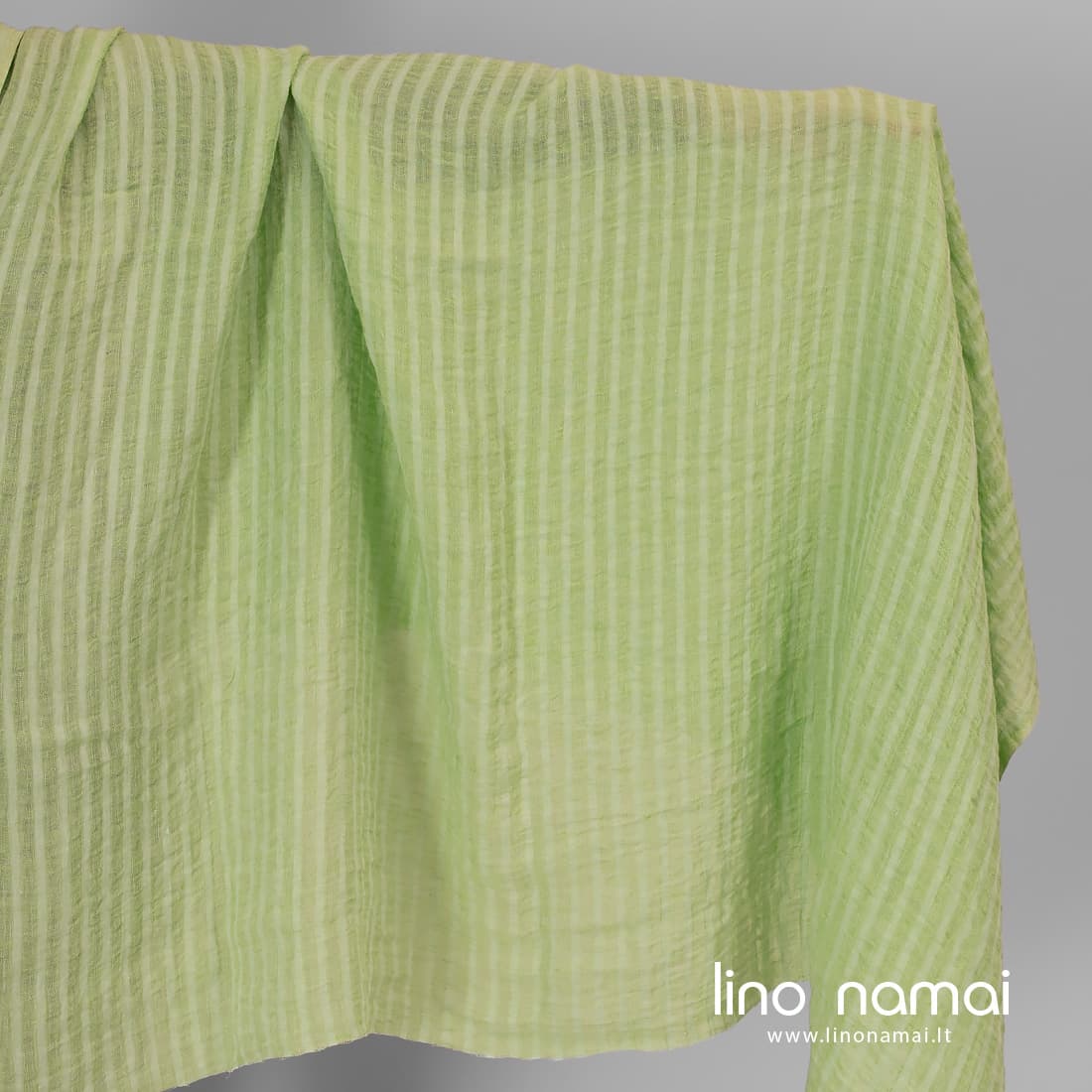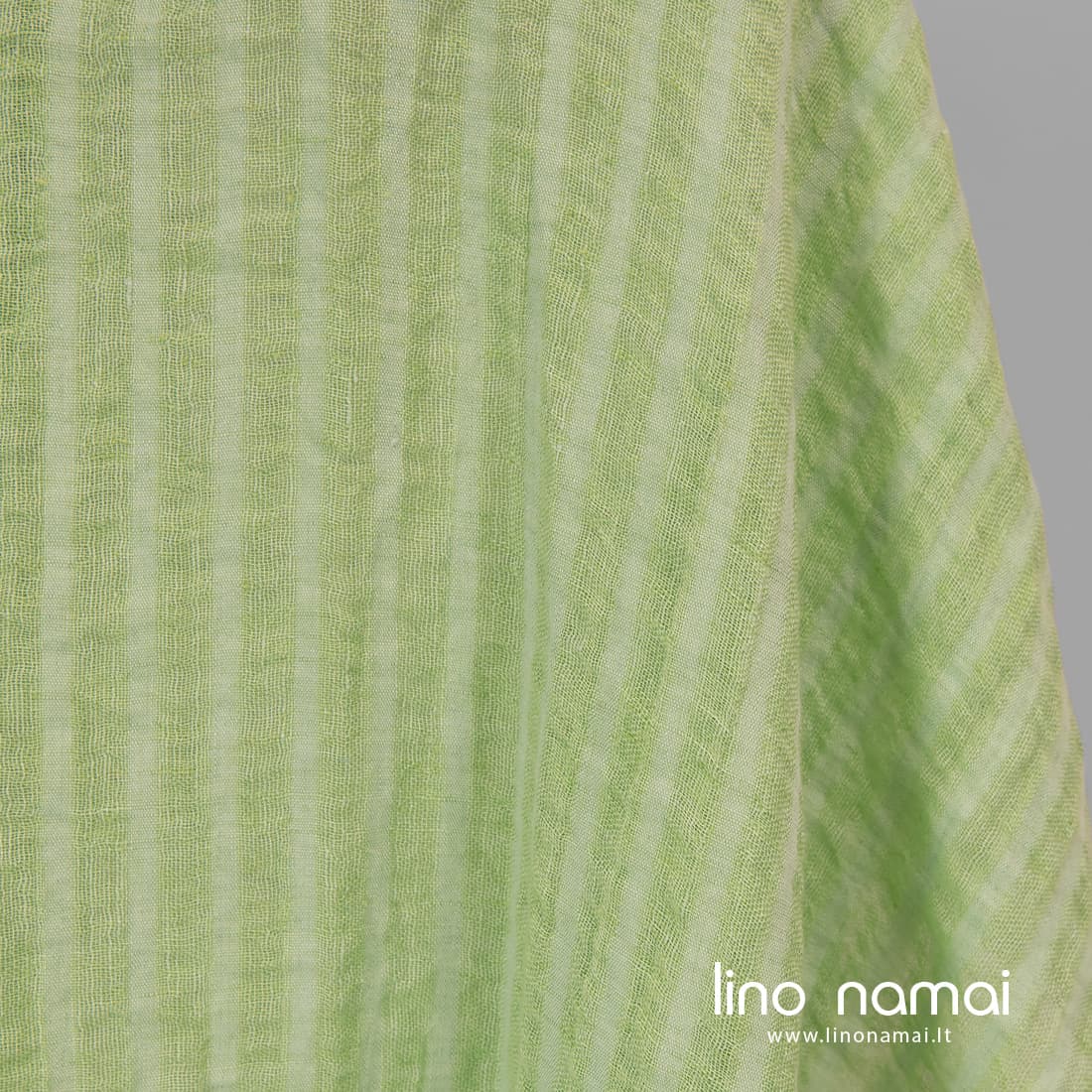 Lininis audinys vertikaliomis salotinėmis juostelėmis. Jame derinti šviesiai žalios ir mėtinės spalvos verpalai. Platesnės juostelės retesnio pynimo. Audinį išskalbėme specialia technologija, todėl jis minkštas, švelnus, nebesitrauks skalbiamas. Iš šio lengvo lino galima siūti šalikus, užuolaidas, staltieses, servetėles.