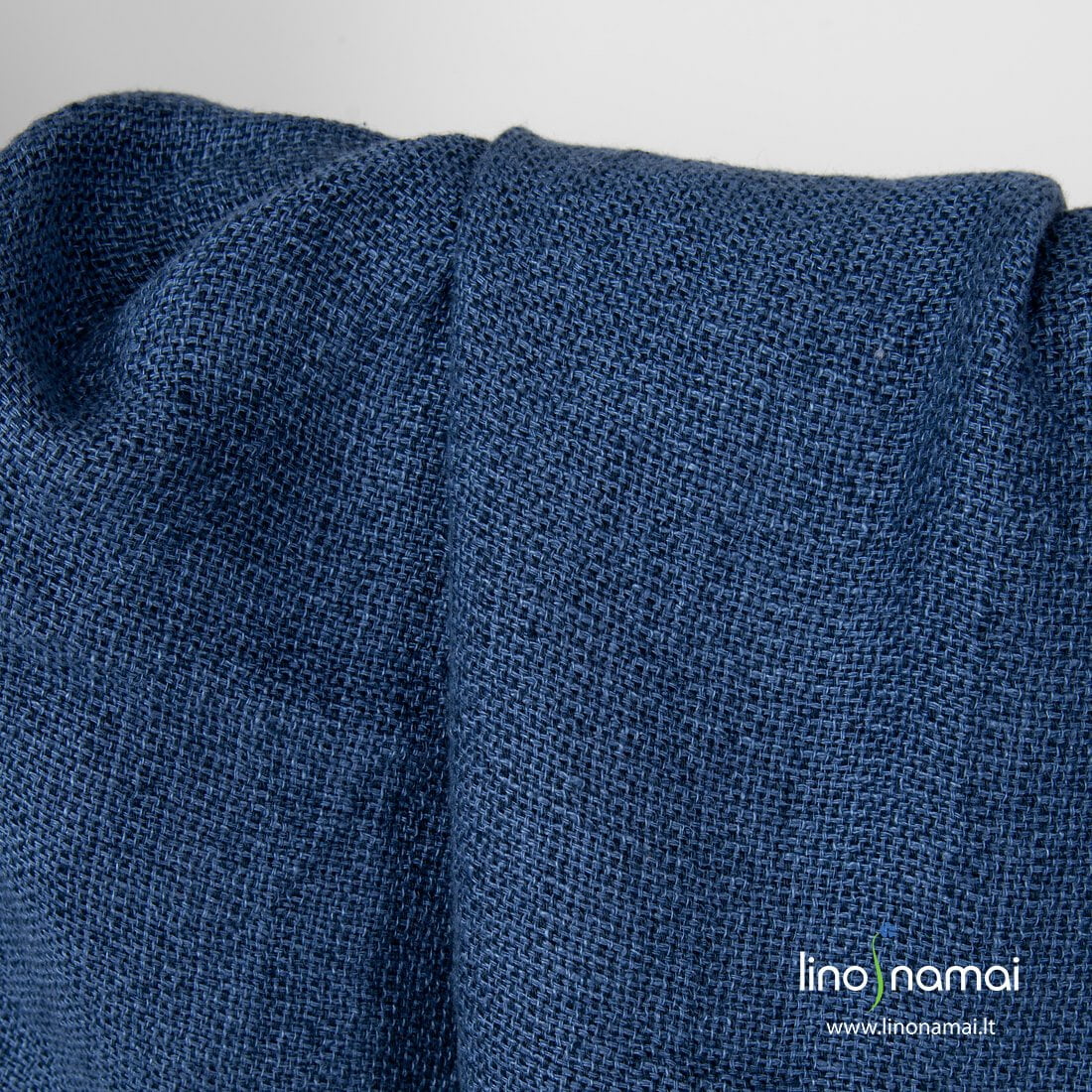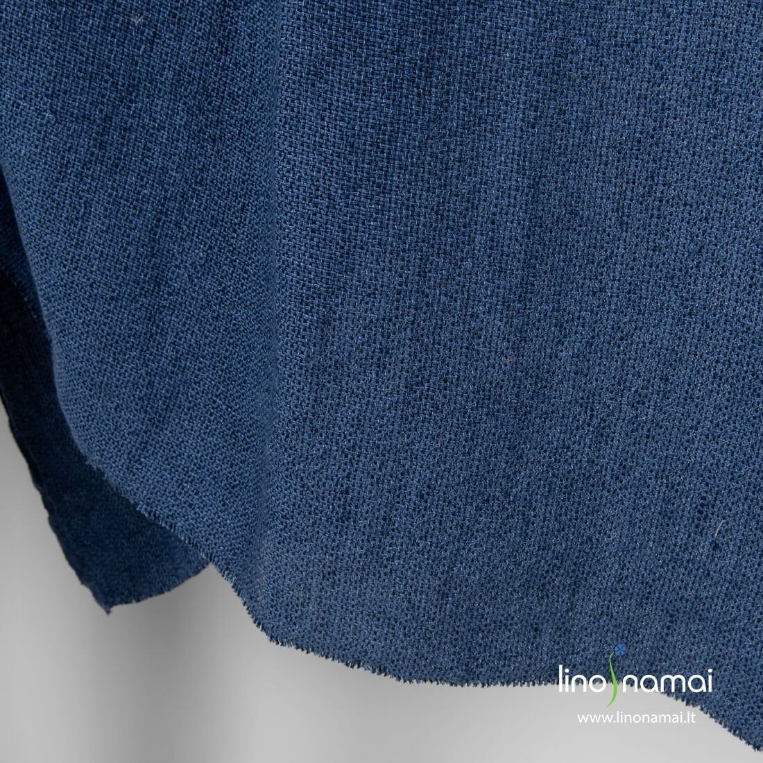 Lininis audinys tamsiai mėlynas melanžinis: jame suaudėme tamsiai mėlynus ir juodus su mėlynu atspalviu verpalus. Gamybos procese išskalbėme jį specialia technologija, kad suteiktumėme švelnumo ir minkštumo. Šis 100% linas tvirtas, tankus, sunkus, vidutinio storio. Iš jo siūkite drabužius, dekoratyvinių pagalvėlių užvalkalus, lovų užtiesalus.