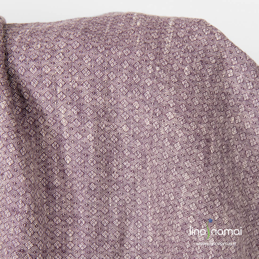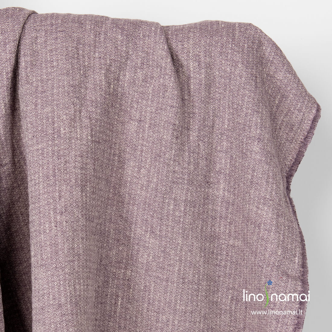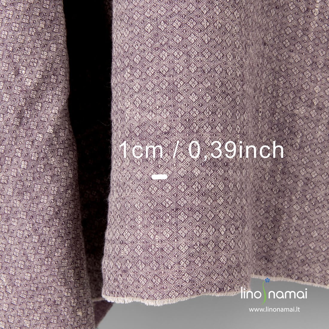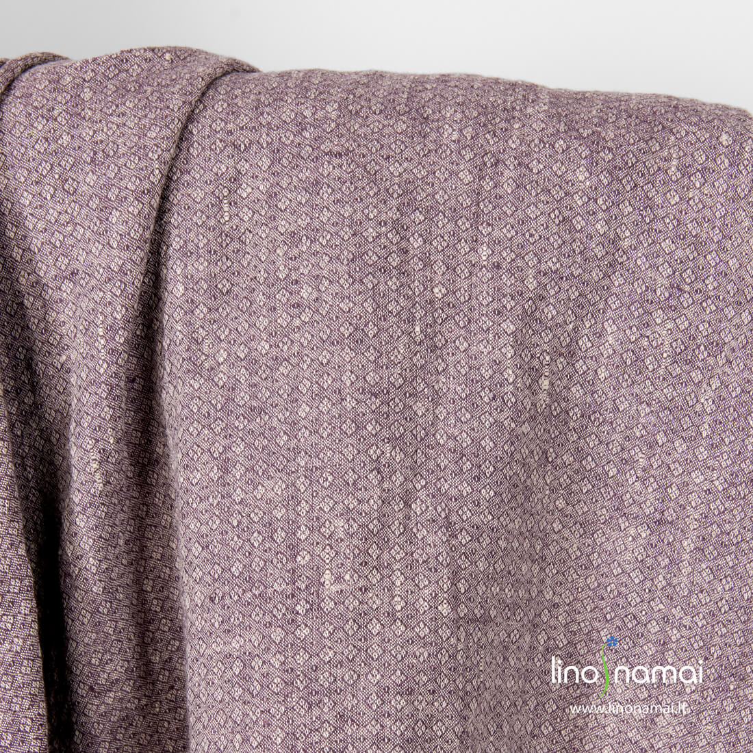 Lininis audinys violetinis raštuotas, išaustas mažais rombais iš šviesiai pilkų ir violetinių verpalų. Tvirtas, tankus, vidutinio storio. Specialiai skalbtas, kad taptų minkštas, švelnus, malonus odai. Siūkite drabužius, dekoratyvius namų gaminius (staltieses, užuolaidas, sofos pagalvėlių užvalkalus).