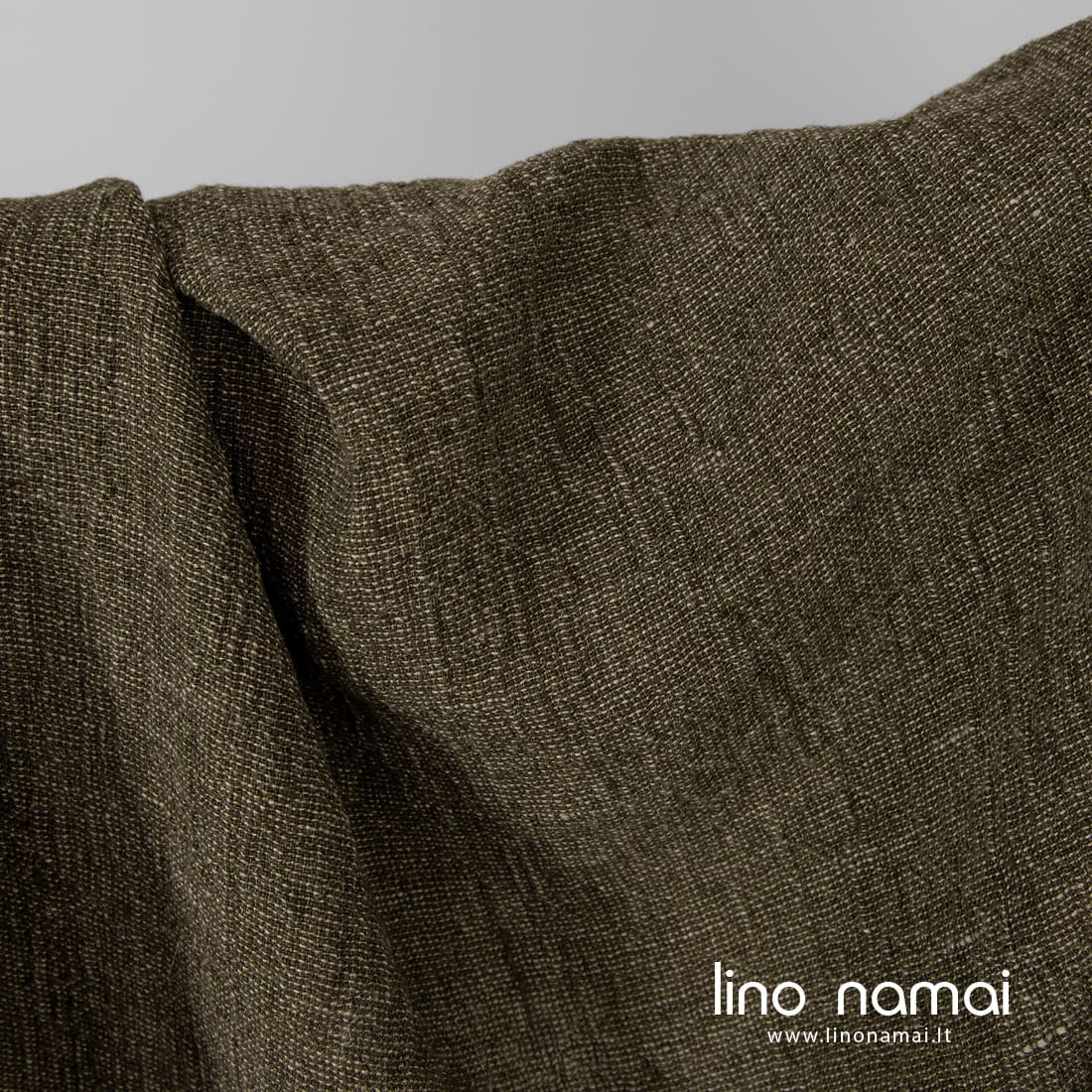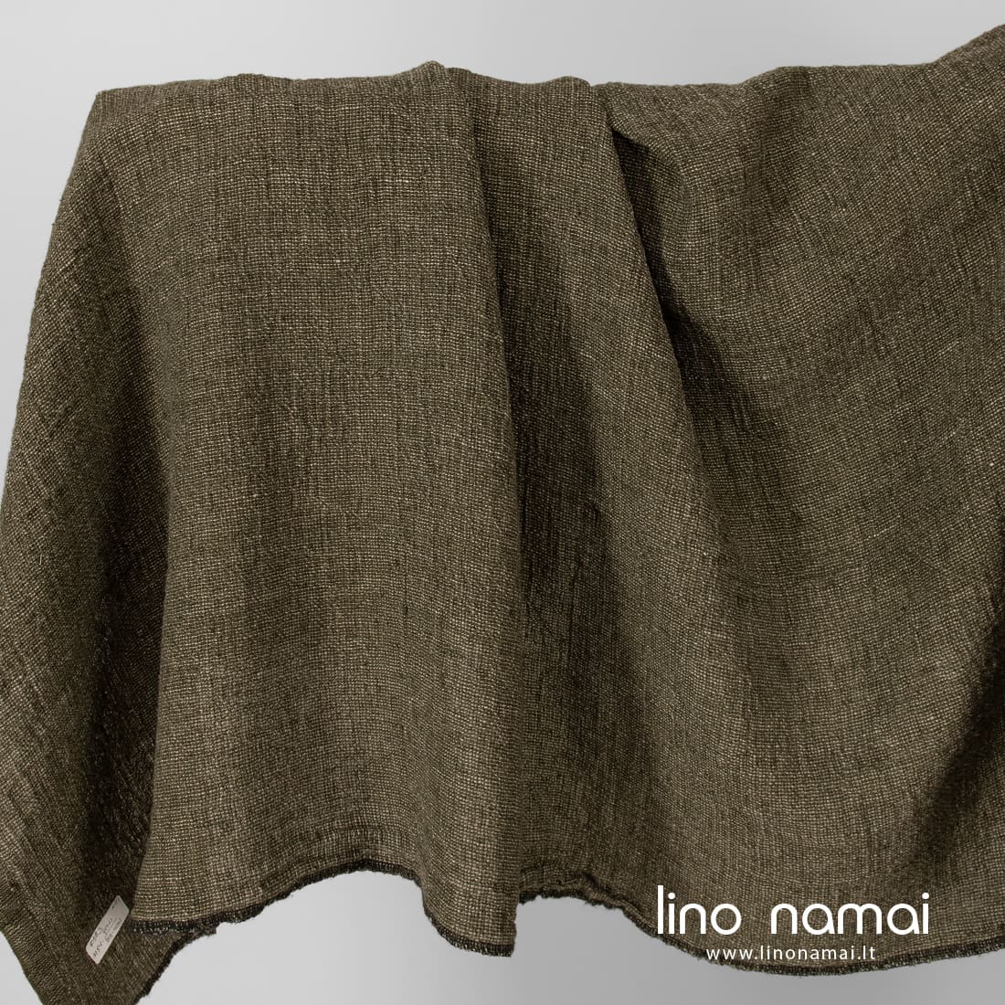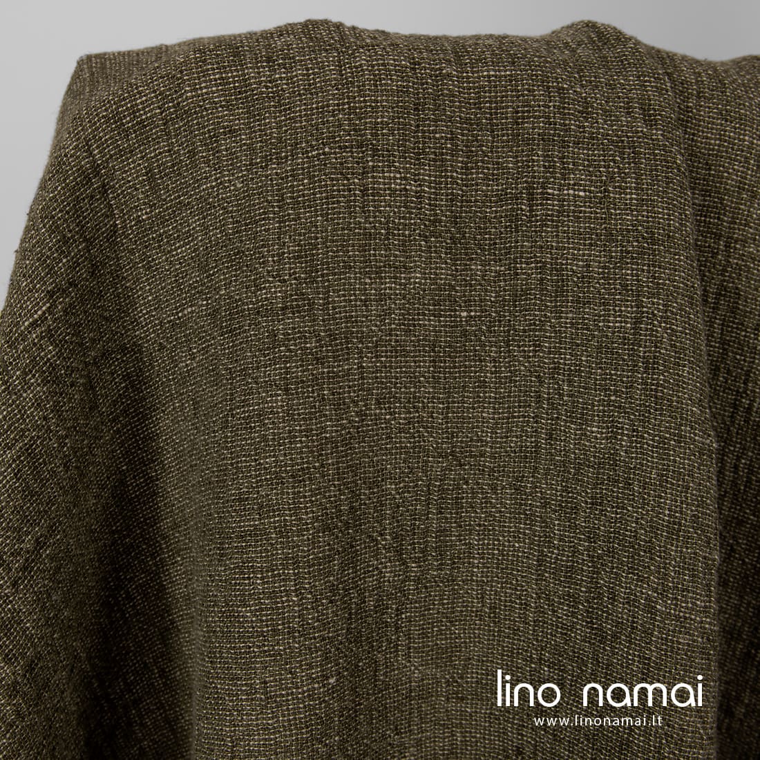 Lininis audinys rudai žalias (samanų spalvos) su pilkais brūkšniukais, kuriuos išaudėme iš nedažytų, natūralios spalvos lino verpalų. Storokas, tvirtas, tankus, sunkus. Skalbtas specialia technologija, kuri suteikė minkštumo ir švelnumo. Tinka drabužiams, namų tekstilės gaminiams siūti.
