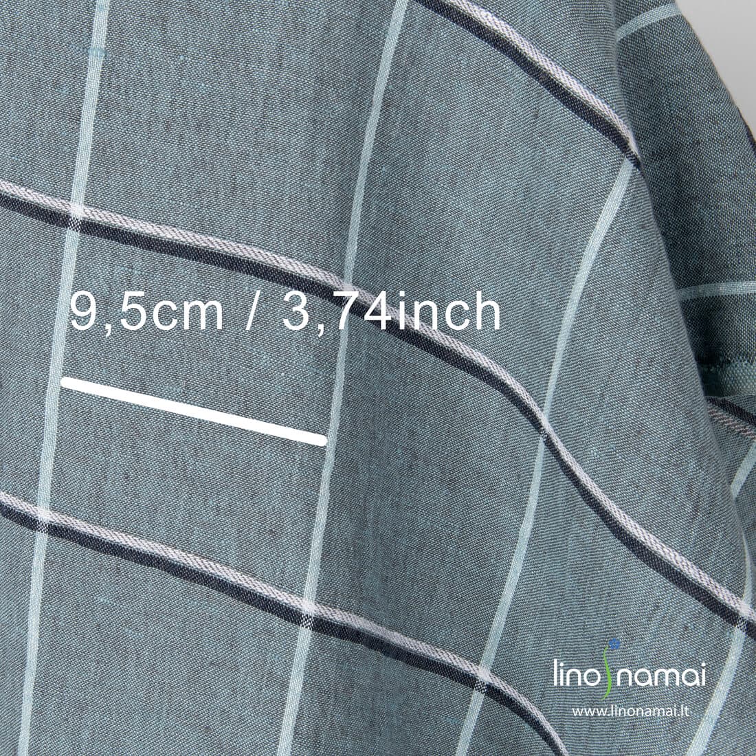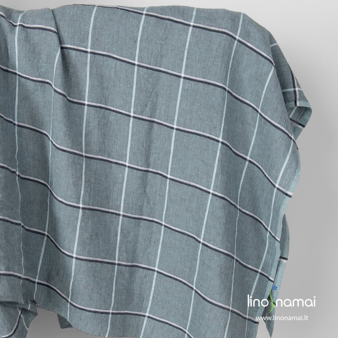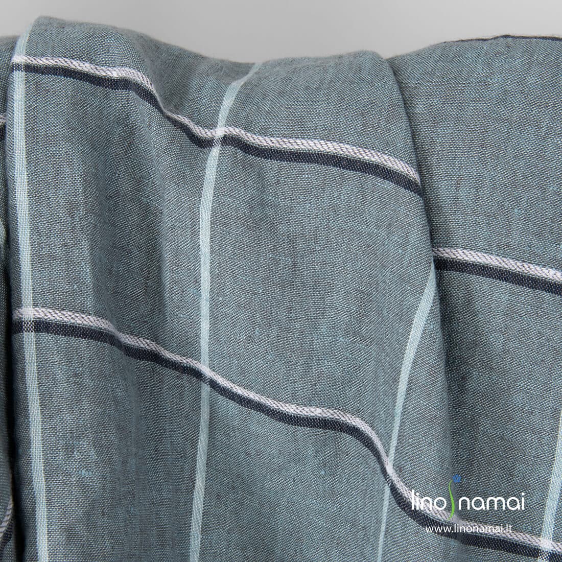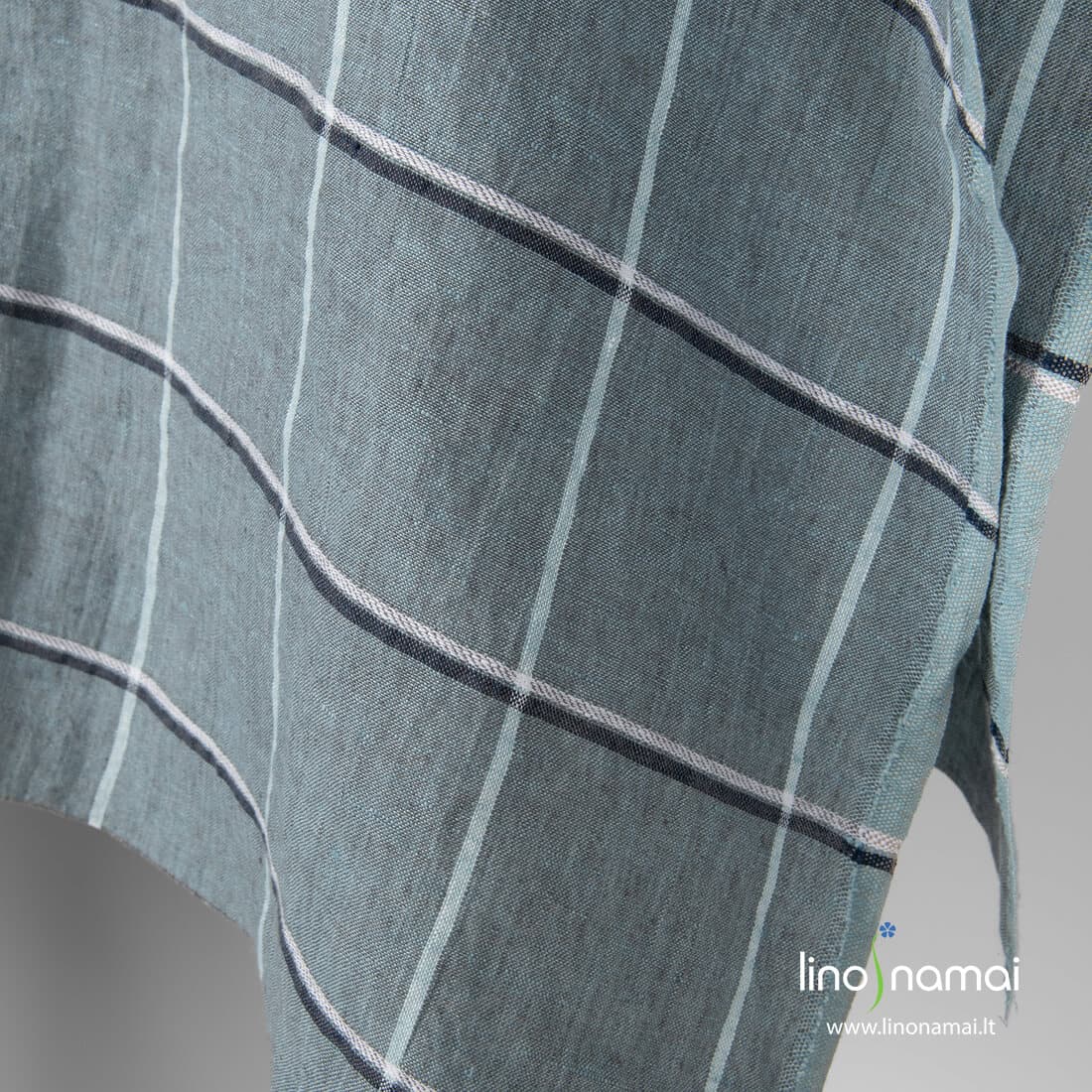 Lininis audinys žalsvas languotas. Audinio pagrindas melanžinis: jame suausti rusvai pilki ir melsvai žalsvi verpalai. Langelių linijoms naudoti balti ir melsvai juodi verpalai. Specialus skalbimas suteikė šiam linui minkštumo ir švelnumo.