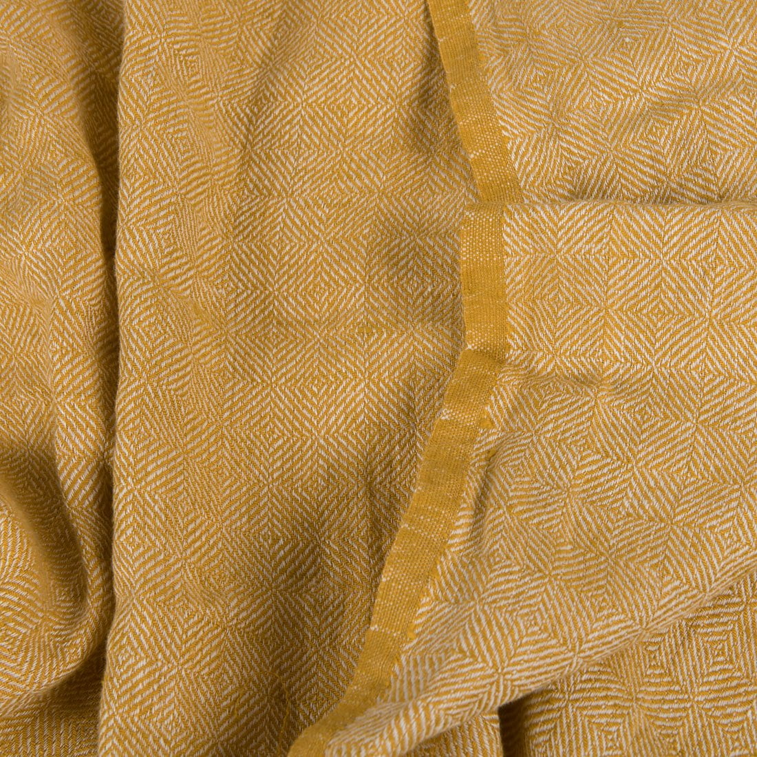Lininis audinys austas rombų raštu iš garstyčių geltonos ir baltos spalvos verpalų. Tvirtas, tankus, vidutinio storio. Šis linas skalbtas specialiu būdu, kad būtų minkštesnis, malonus odai, nesitrauktų skalbiamas.