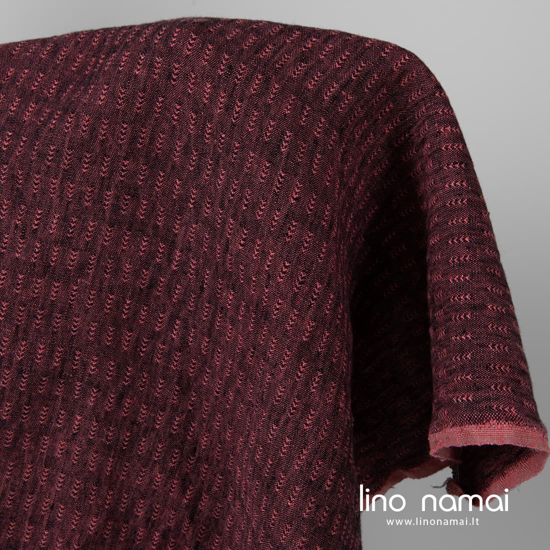 Lininis juodai-raudonai raštuotas audinys. Jį išaudėme iš juodų ir intensyvios rausvos spalvos verpalų, įaudėme „eglutes“. Tvirtas, tankus, vidutinio storio, gana sunkus. Šis linas skalbtas specialia technologija, kuri suteikė jam minkštumo ir švelnumo, sumažino traukimąsi. Drabužiams, namų tekstilei siūti.
