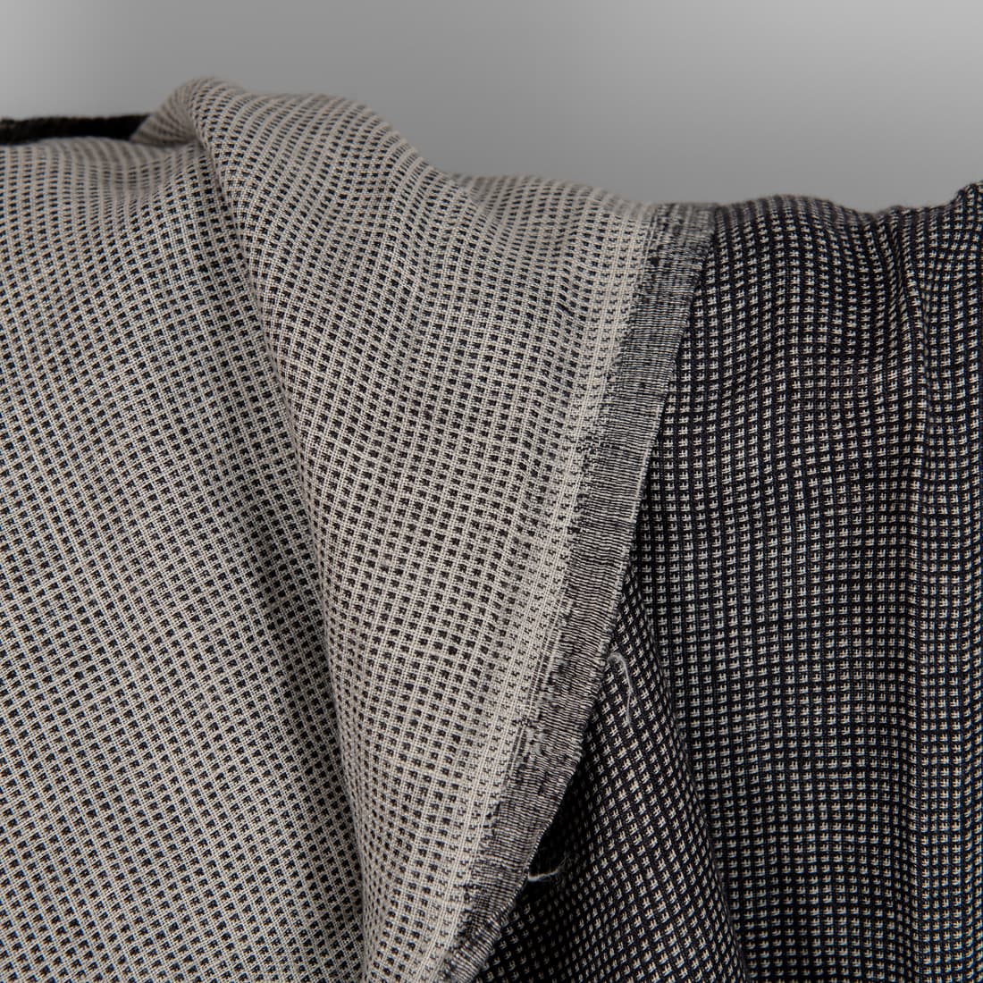 Dvipusis lininis audinys austas smulkių langelių raštu. Vienoje pusėje smėlio spalvos langeliai juodame fone, kitoje pusėje - atvirkštinis spalvų derinys. Audinys tvirtas, tankus, vidutinio storio. Skalbtas specialiu būdu, todėl minkštas, švelnus, nebesitrauks.