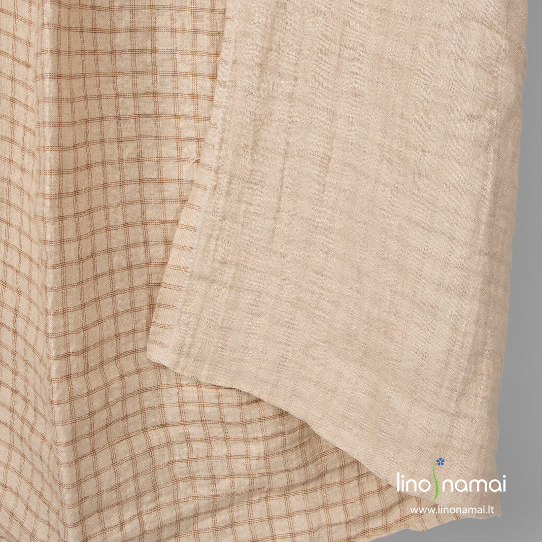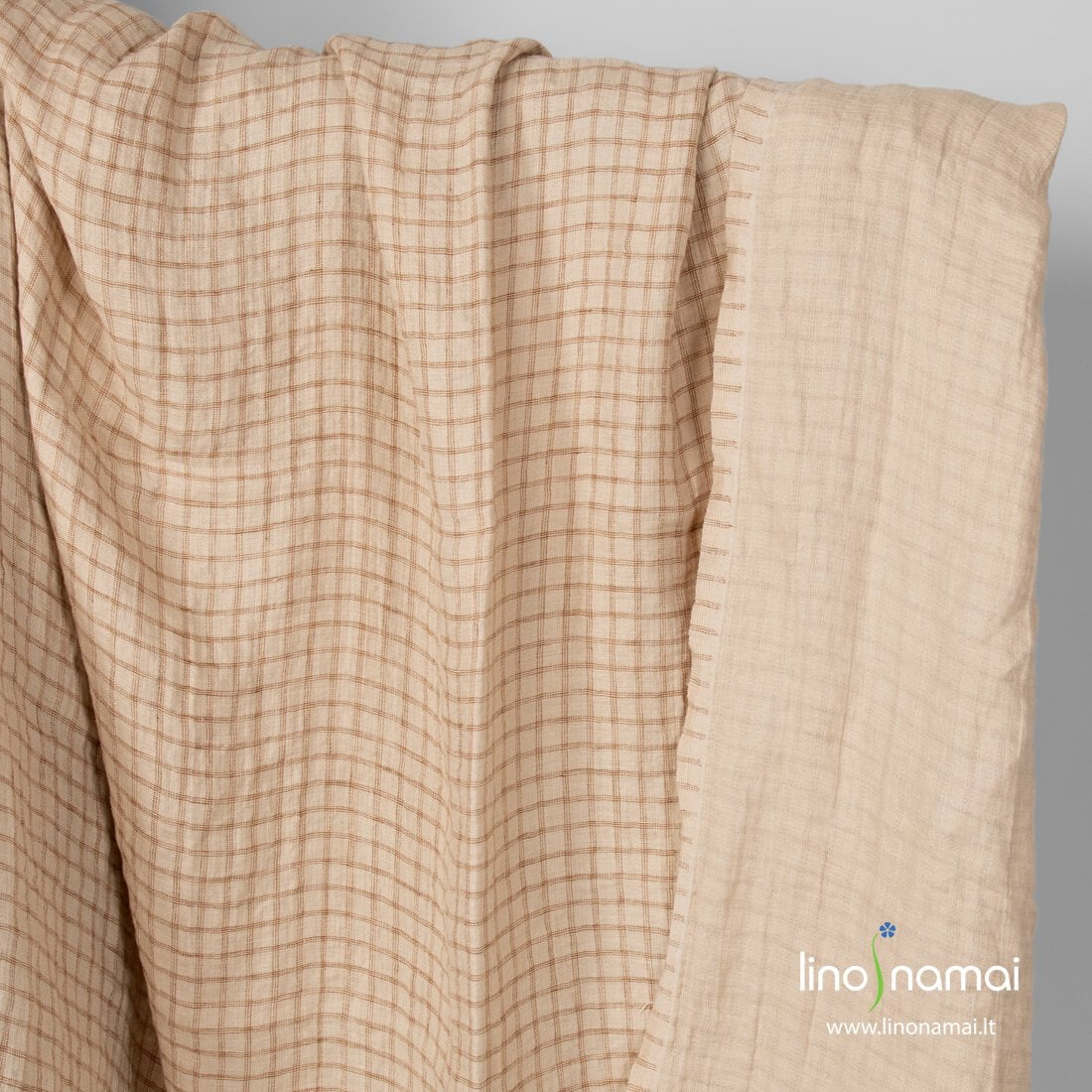 Lininis languotas dvipusis smėlio spalvos audinys: rusvoje pusėje išausti rudi siaurų linijų langučiai, kita pusė vienspalvė rusva. Dvisluoksnis, tvirtas, tankus, vidutinio storio. Skalbtas specialia technologija - taip padarėme jį minkštą, švelnų, sumažinome traukimąsi.