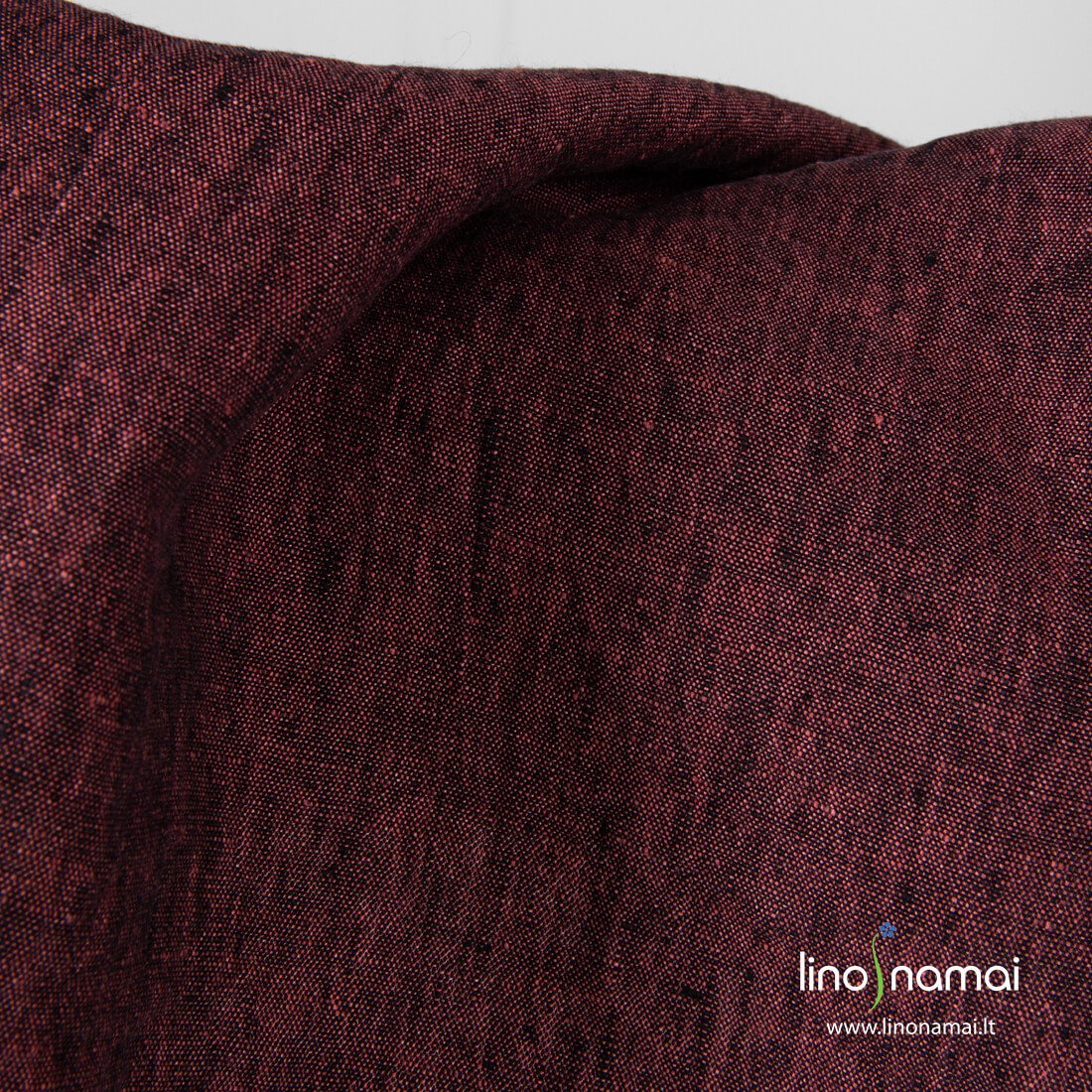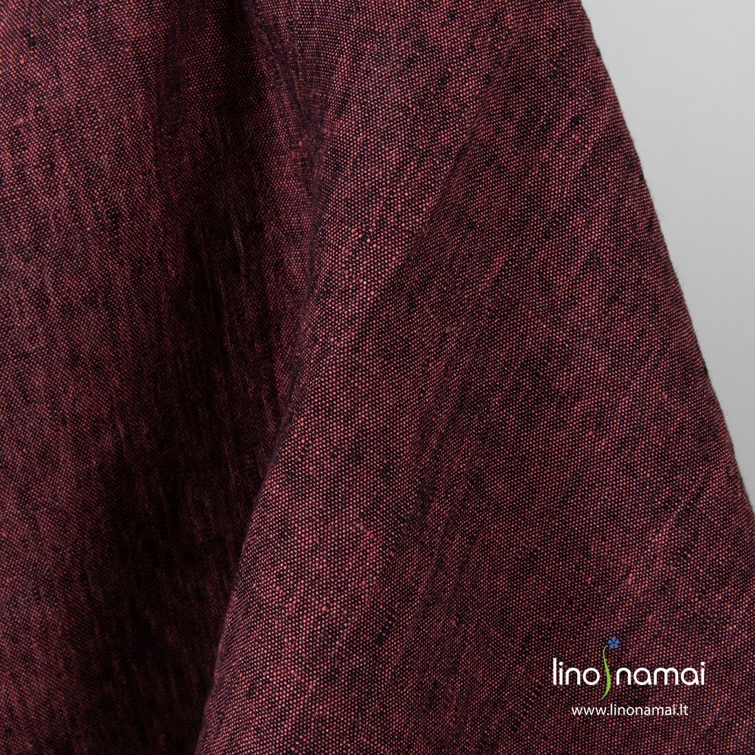 Lininis melanžinis raudonai juodas audinys. Šį 100% lino audinį išaudėme iš juodų ir rausvų verpalų, išskalbėme specialia technologija, kad jis taptų minkštas ir švelnus, nebesitrauktų Jums išskalbus namuose. Iš šio tvirto, tankaus, gana sunkaus audinio galima siūti storesnius viršutinius drabužius ir namų tekstilės gaminius.