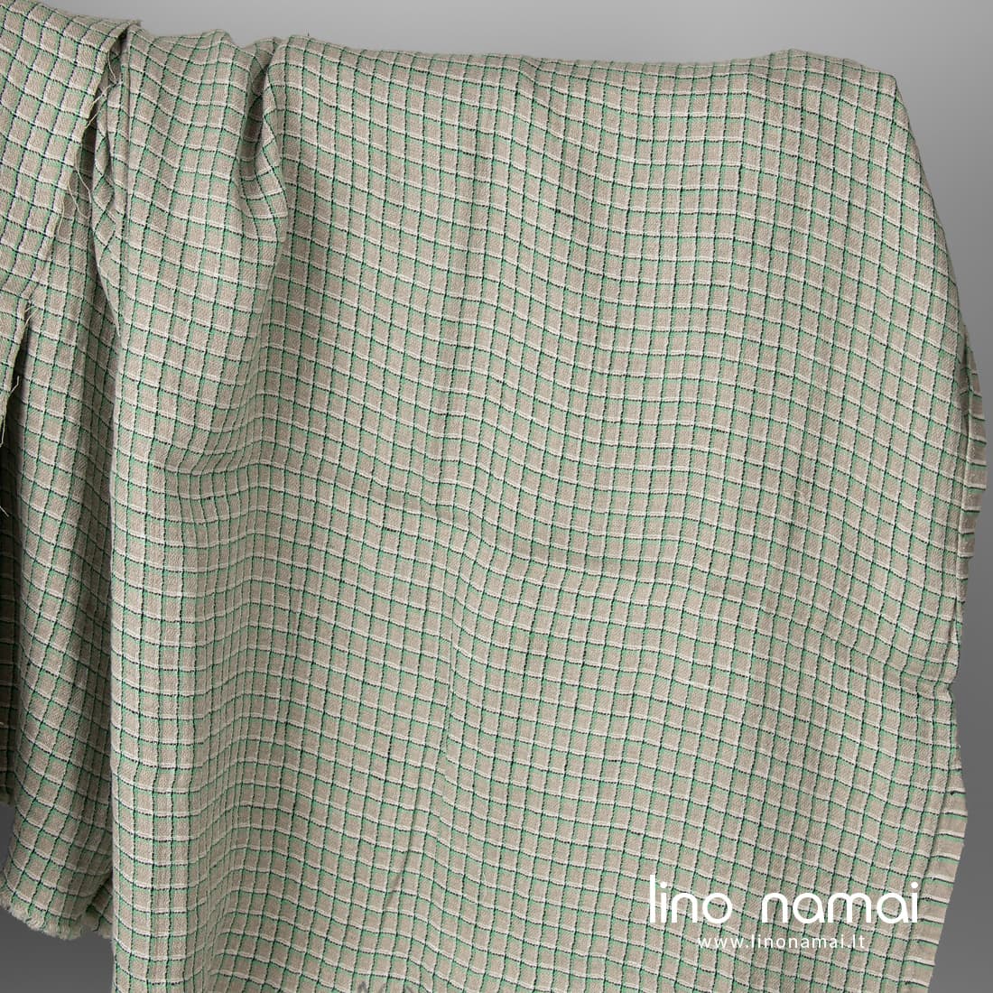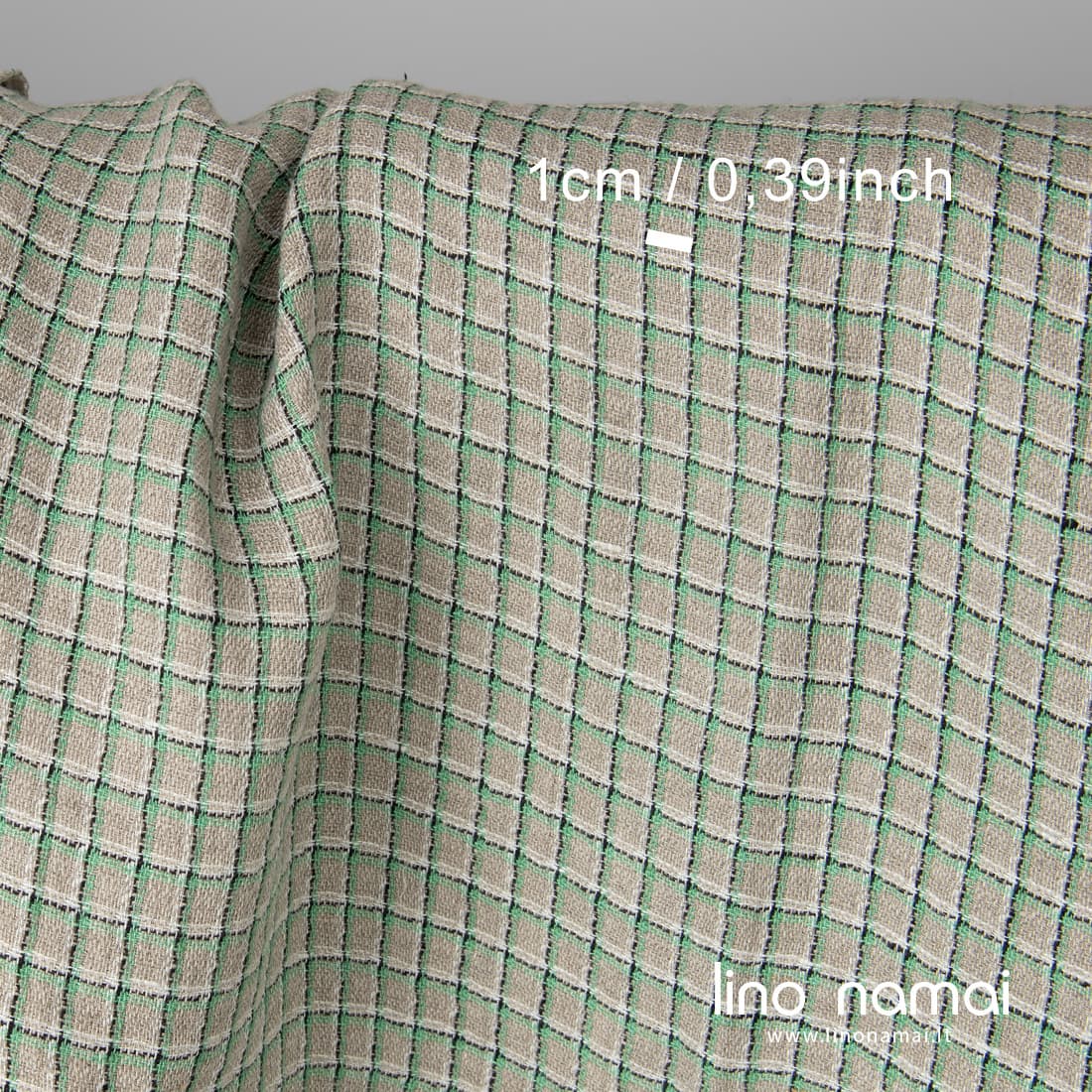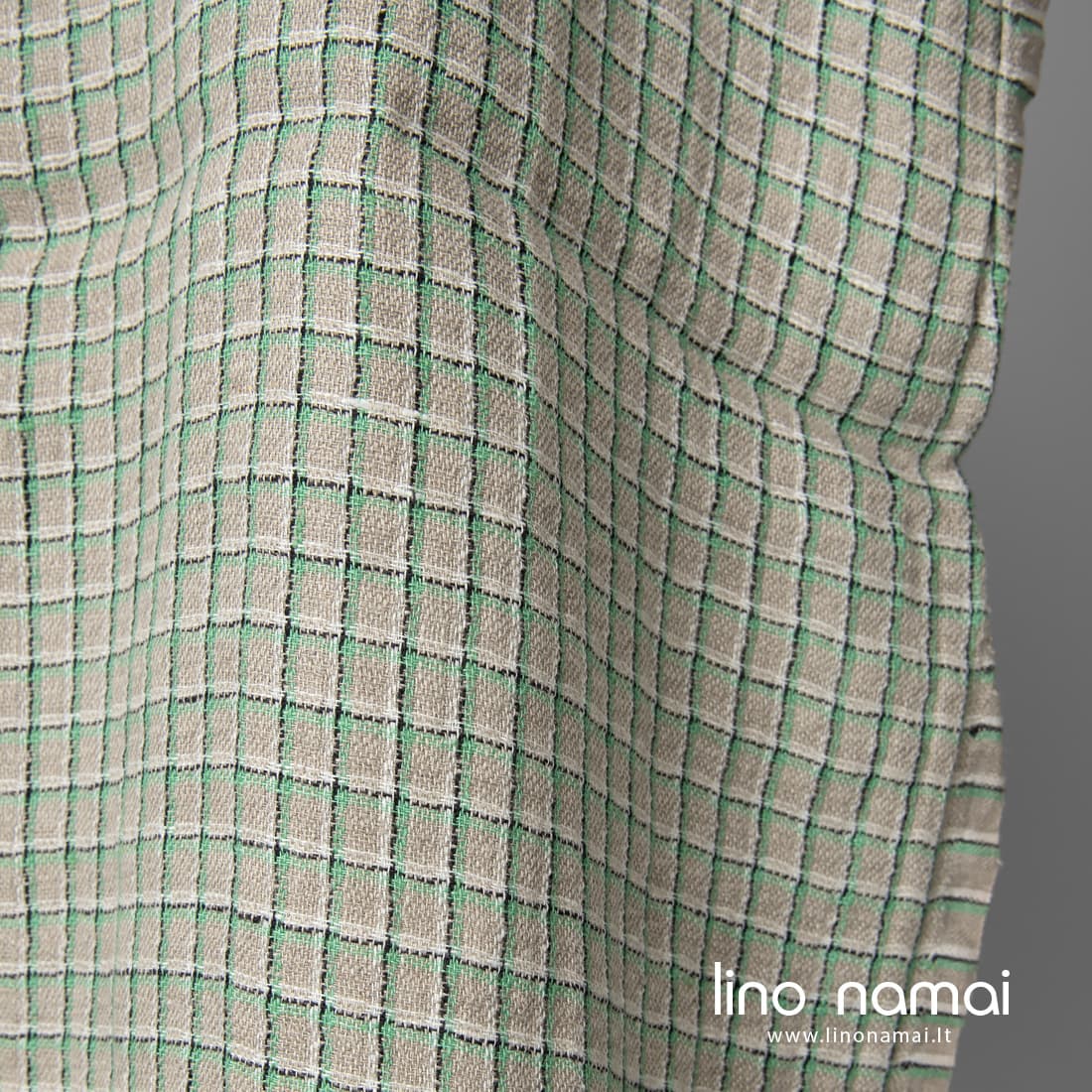 Natūralios pilkos lino spalvos 100% lino audinys su siauromis šviesiai žaliomis, juodomis ir baltomis juostelėmis, sudarančiomis 1cm x 1,5cm dydžio langelius. Tvirtas, tankus, nepermatomas. Skalbtas specialia technologija, kad taptų minkštas.