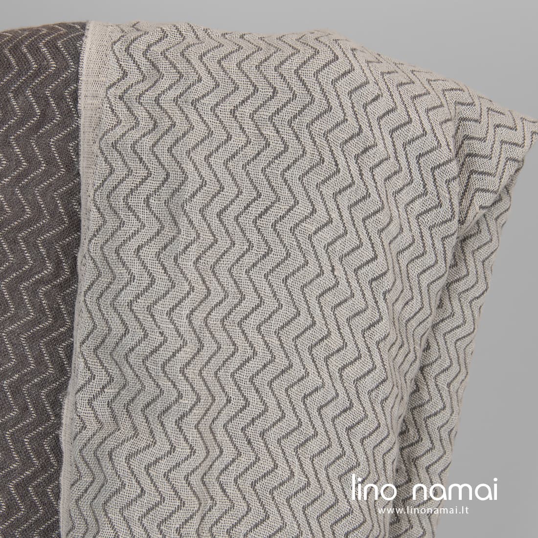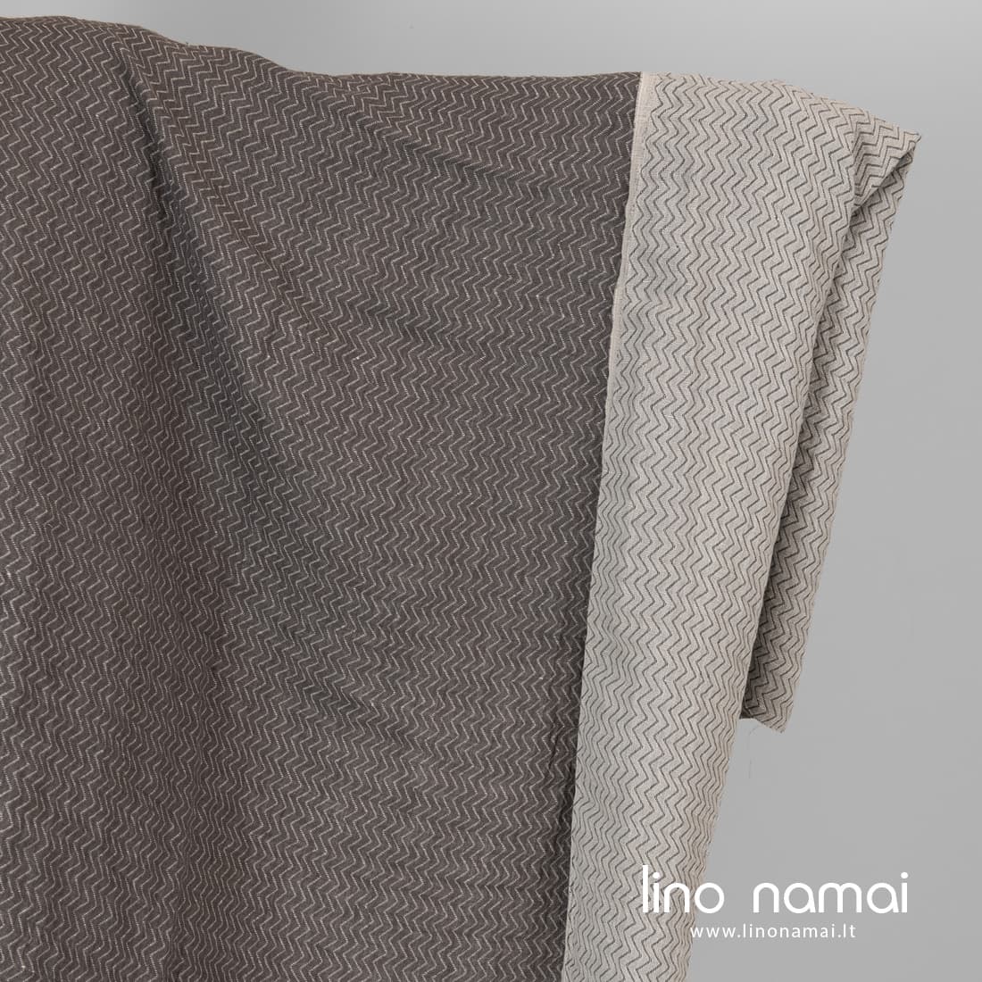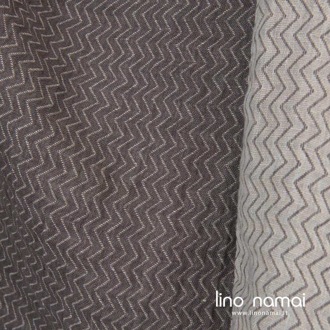 Lininis pilkas raštuotas dvipusis audinys. Rusvai pilkoje šio žakardinio lino pusėje išausti šviesiai pilki zigzagai, kitoje pusėje suausti šviesūs melsvai žalsvi ir rusvai pilki verpalai, įausti tamsesni pilki zigzagai. Siuviniams galima naudoti abi audinio puses. Šis linas tvirtas, tankus, vidutinio storio, sunkus, dvisluoksnis. Skalbtas specialiu būdu, todėl minkštas, švelnus, malonus odai.