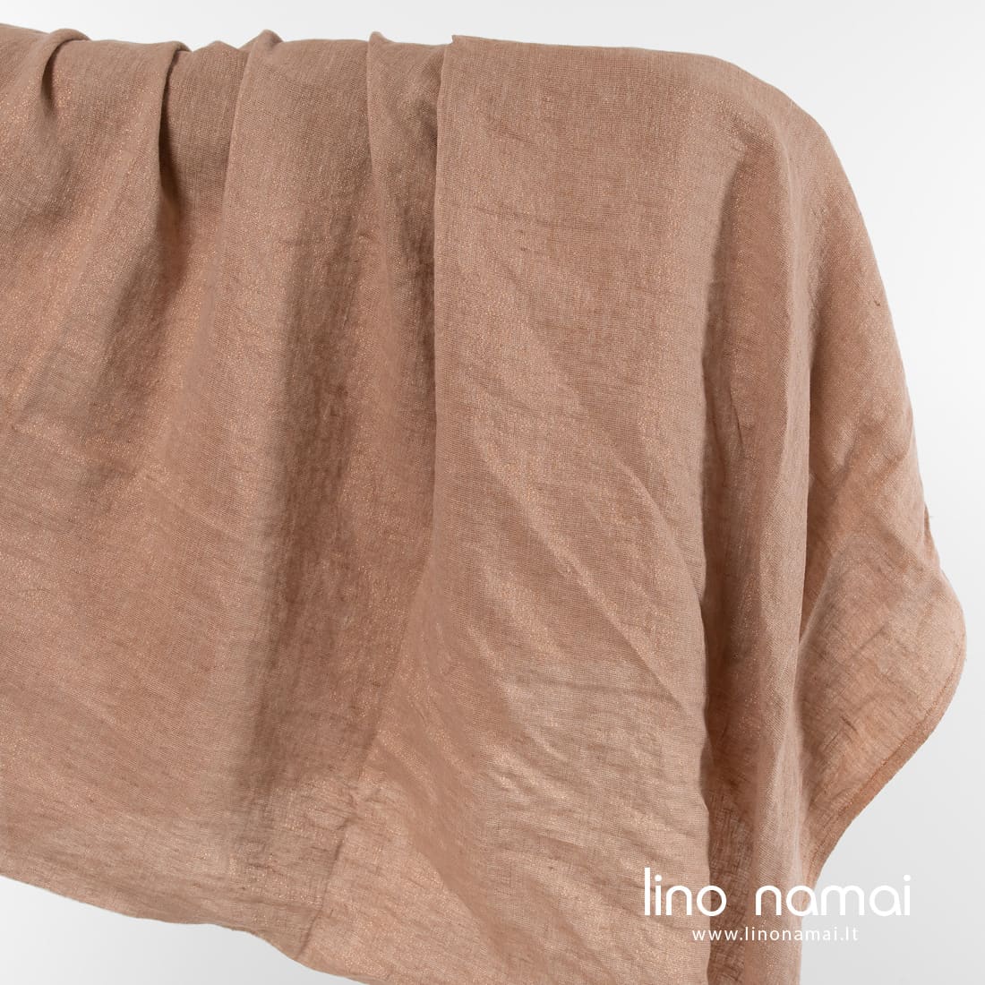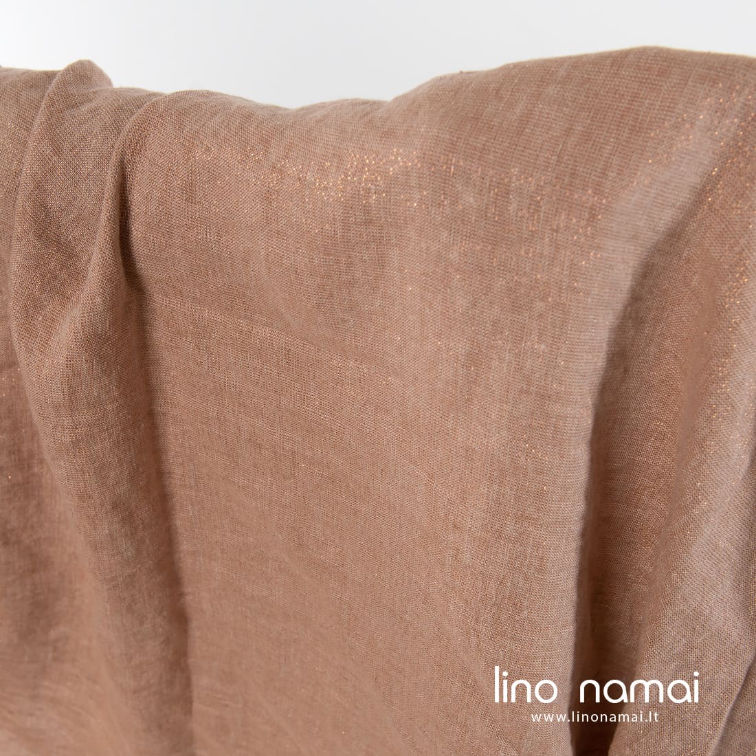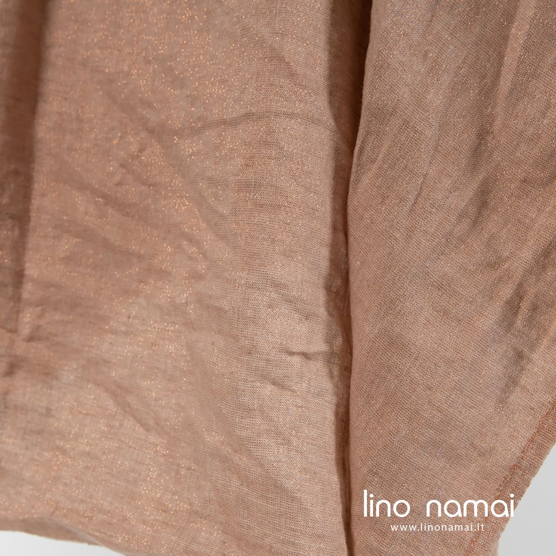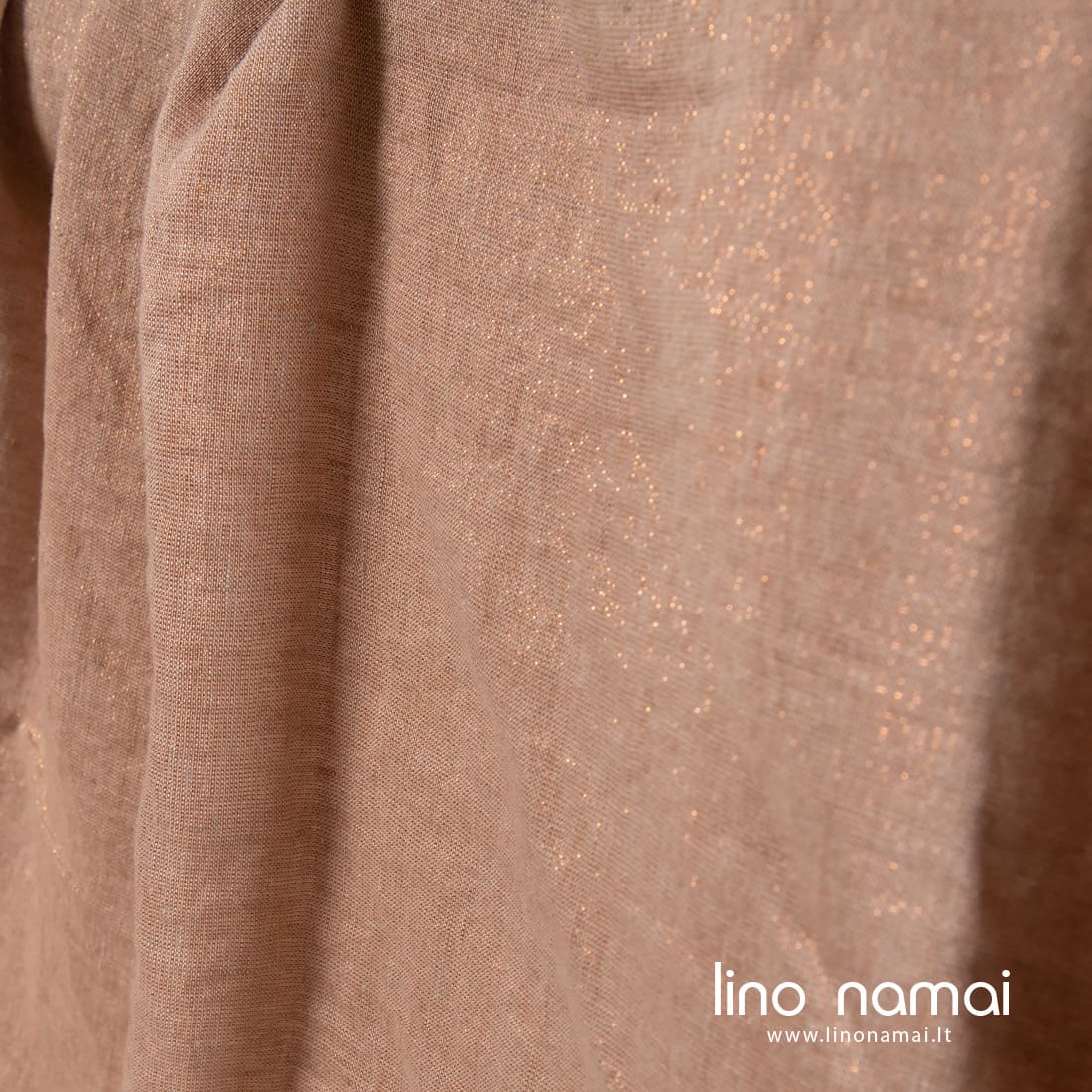 Lininis rusvas blizgus audinys skalbtas. Įausti vario spalvos poliesterio siūlai suteikė jam nekasdienio spindesio. Iš šio tvirto, tankaus, vidutinio storio audinio galima siūti šventiškus drabužius, staltieses, servetėles, užuolaidas. Dėl specialaus skalbimo audinys yra minkštas, švelnus, malonus odai.