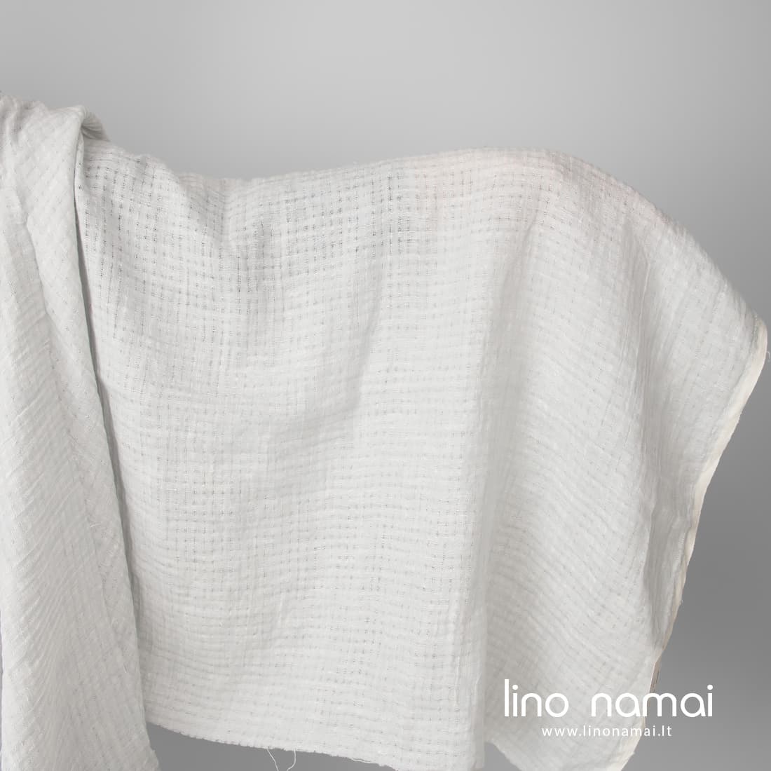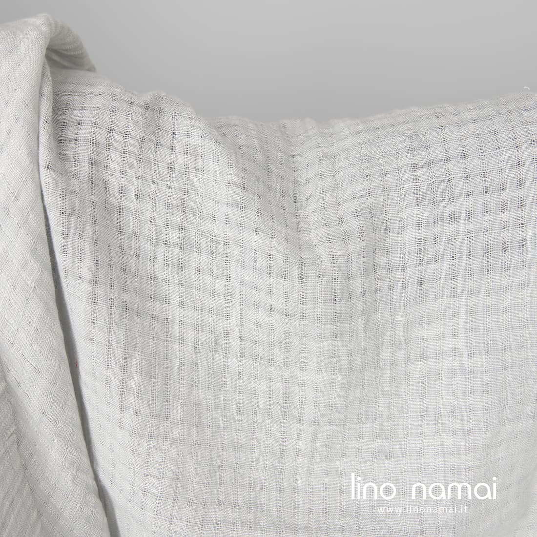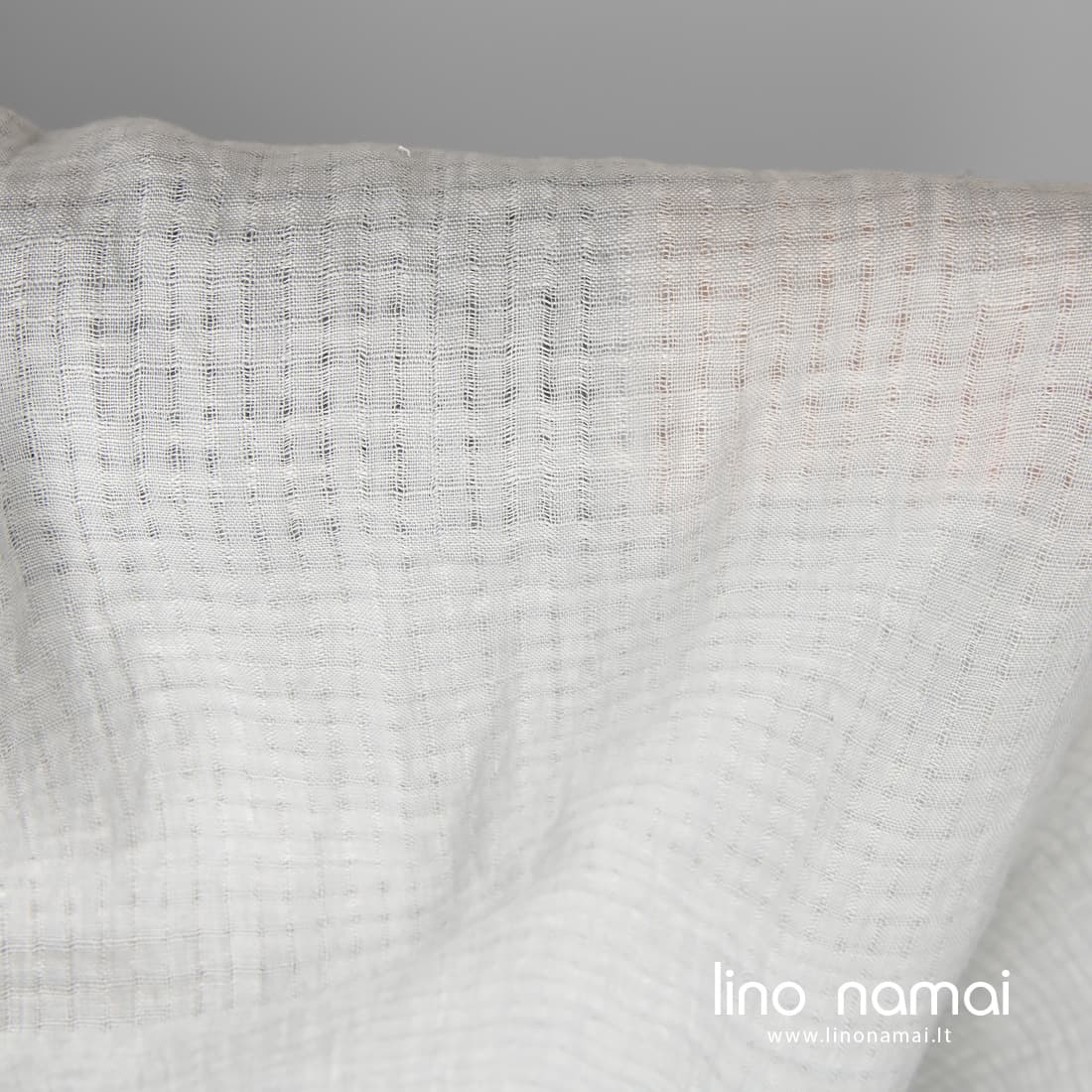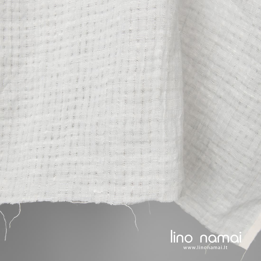 Lininis šviesiai pilkas audinys su siauromis ažūrinėmis juostelėmis, sudarančiomis 1cm x 1cm dydžio langelius. Tvirtas, lengvas audinys buvo skalbtas specialiu būdu, kad suminkštėtų, taptų malonus liesti, švelnus odai, nebesitrauktų skalbiamas. Idealiai tiks lengviems vasariniams drabužiams, šalikėliams siūti.