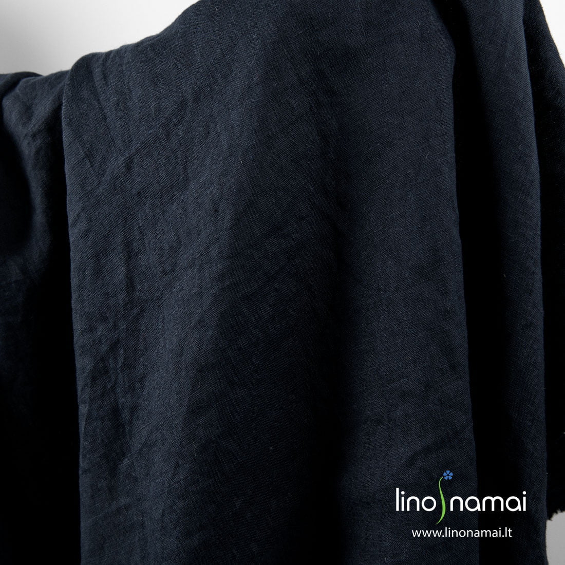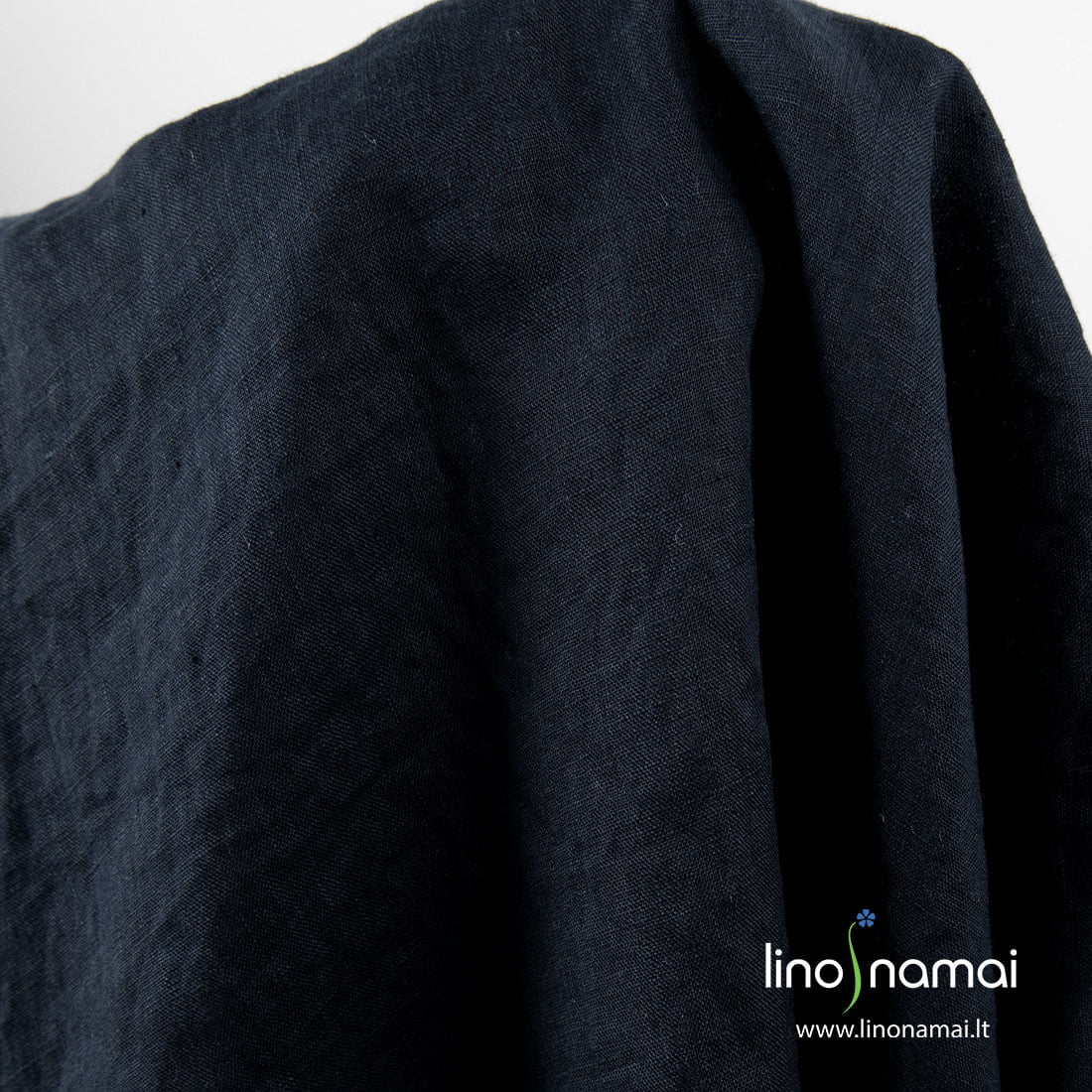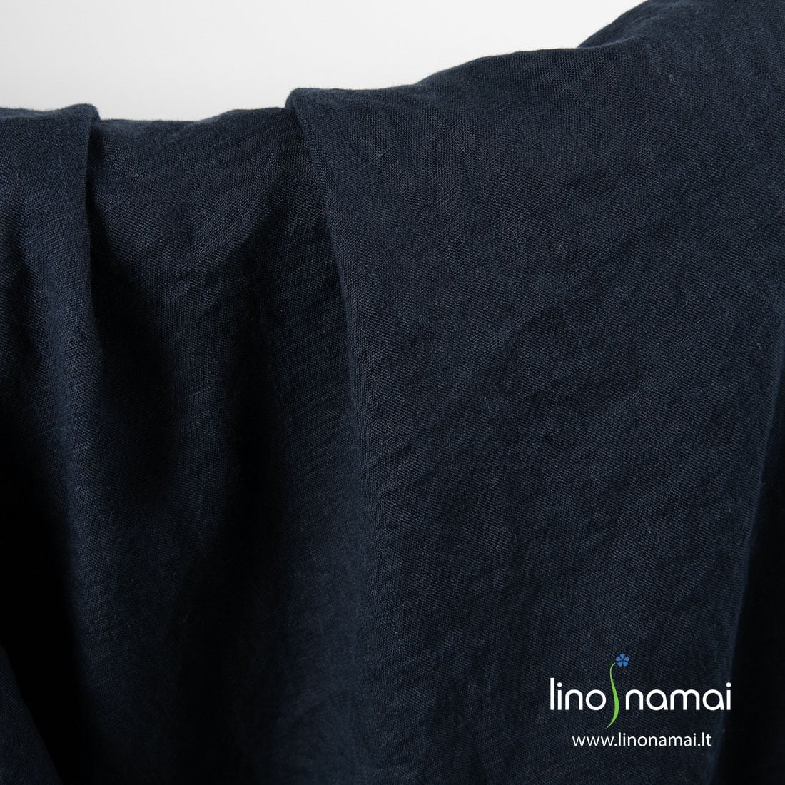 Lininis tamsiai mėlynas skalbtas audinys. Lengvas, plonas, iš dalies permatomas. Audinį specialiu būdu išskalbėme tam, kad jis taptų minkštas, švelnus, nebesitrauktų.