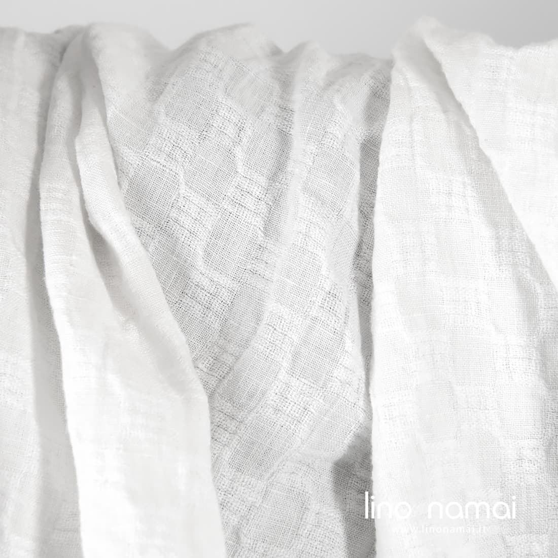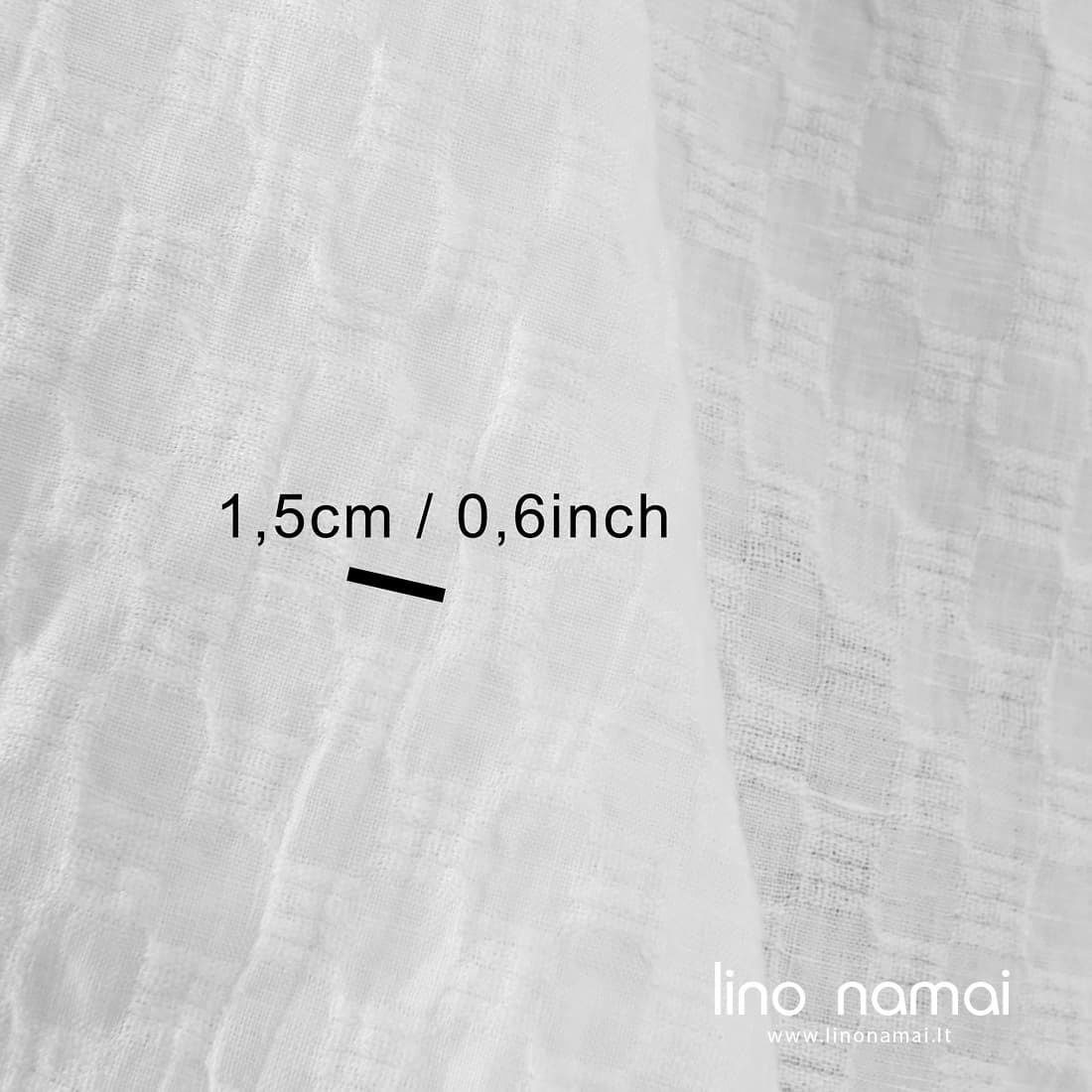 • Ryškiai baltas 100% lino audinys su langelių raštu, specialiai skalbtas