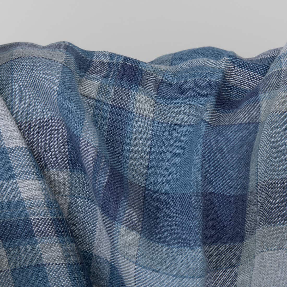 Įstrižais ruoželiais austas languotas 100% lininis audinys. Įvairiaspalviams, skirtingų dydžių langeliams išausti naudoti melsvai pilkšvi, melsvi, tamsesni mėlyni ir pilki verpalai. Audinys skalbtas specialia technologija, todėl nepaprastai minkštas, švelnus, malonus liesti, o taip pat nebesitrauks skalbiamas pakartotinai.