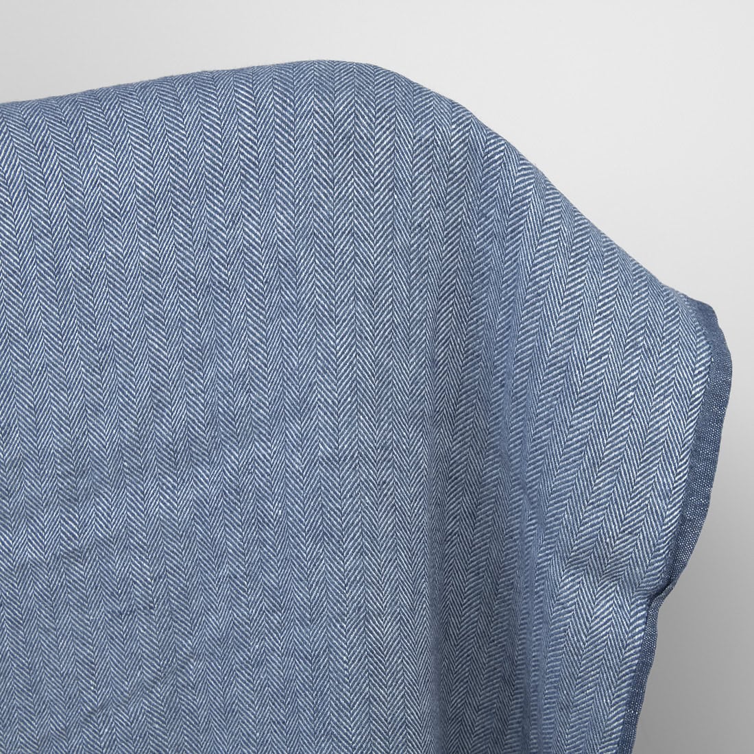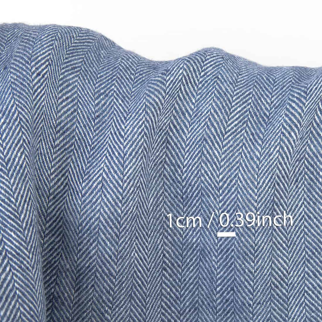 Baltos ir melsvos spalvų eglutės rašto lino audinys. Skalbtas specialia technologija, todėl gaminiai iš šio audinio skalbiami nebesitrauks. Ganėtinai sunkus ir tankus lininis audinys yra minkštas, malonus liesti. Tinka siūti įvairius drabužius, pledus, aksesuarus.