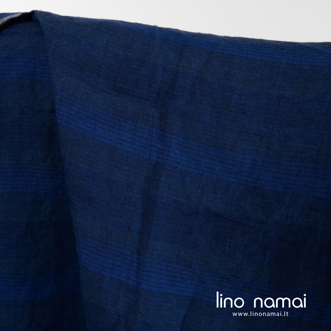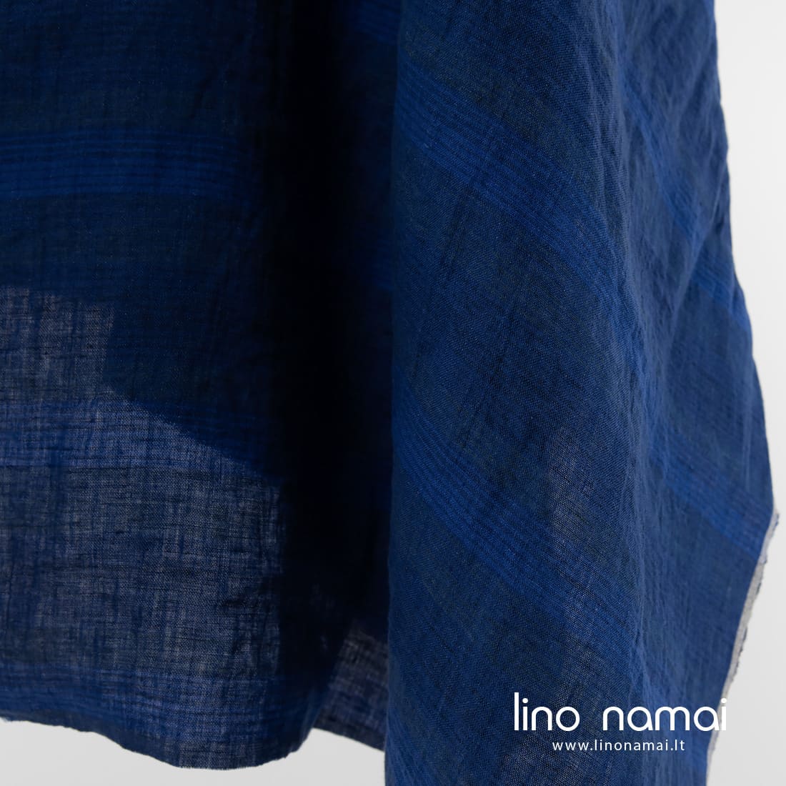 Mėlynai dryžuotas lininis audinys, išaustas iš keturių atspalvių mėlynų verpalų siauromis horizontaliomis juostelėmis. Lengvas, tvirtas, tankus. Tinka drabužiams ir namų tekstilei siūti.