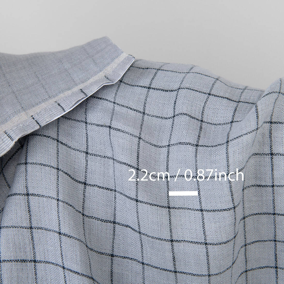 Pilkas lininis audinys su siauromis tamsiai mėlynomis juostelėmis, sudarančiomis apytikriai 3cm x 3cm dydžio kvadratėlius. Audinys dvisluoksnis: viena jo pusė languota, kita vienspalvė pilka. Dėl specialios skalbimo technologijos šis audinys tapo minkštas, švelnus, malonus liesti, skalbiamas nebesitrauks.