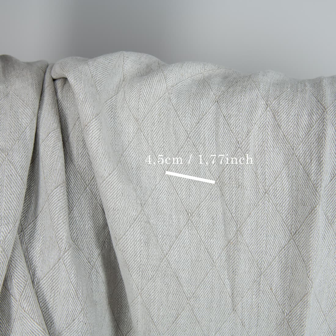 Pilkos spalvos skalbtas 100% lininis audinys, austas dryžuotų rombų raštu. Audinys dvipusis: viena jo pusė šviesesnė su tamsesniais rombų ornamentais, kita - tamsesnė su šviesesniais tokiais pat ornamentais. Gamybos procese buvo išplautas naudojant specialias technologijas, tad tapo daug minkštesnis, o ateityje išplovus nebesitrauks. Šis pakankamai sunkus audinys puikiausiai tiks siūti virtuvės gaminiams, užuolaidoms, drabužiams bei aksesuarams.