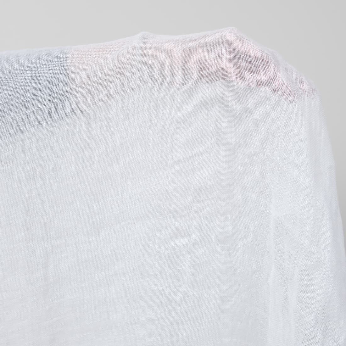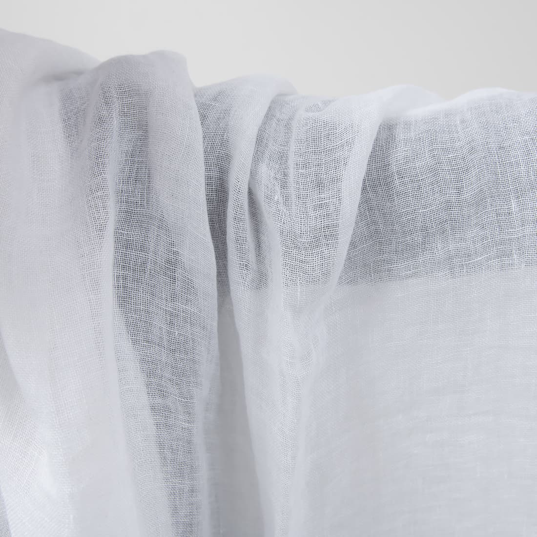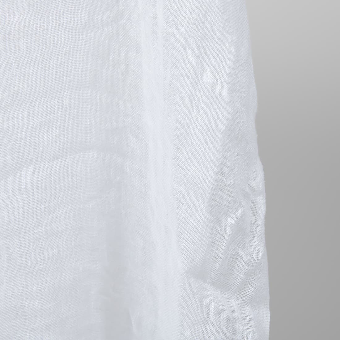 Ryškiai baltos spalvos lininis audinys. Lengvas, permatomas, reto pynimo. Skalbtas specialiu būdu, todėl minkštas, šiek tiek glamžytas. Idealus pasirinkimas šalikėliams siūti.