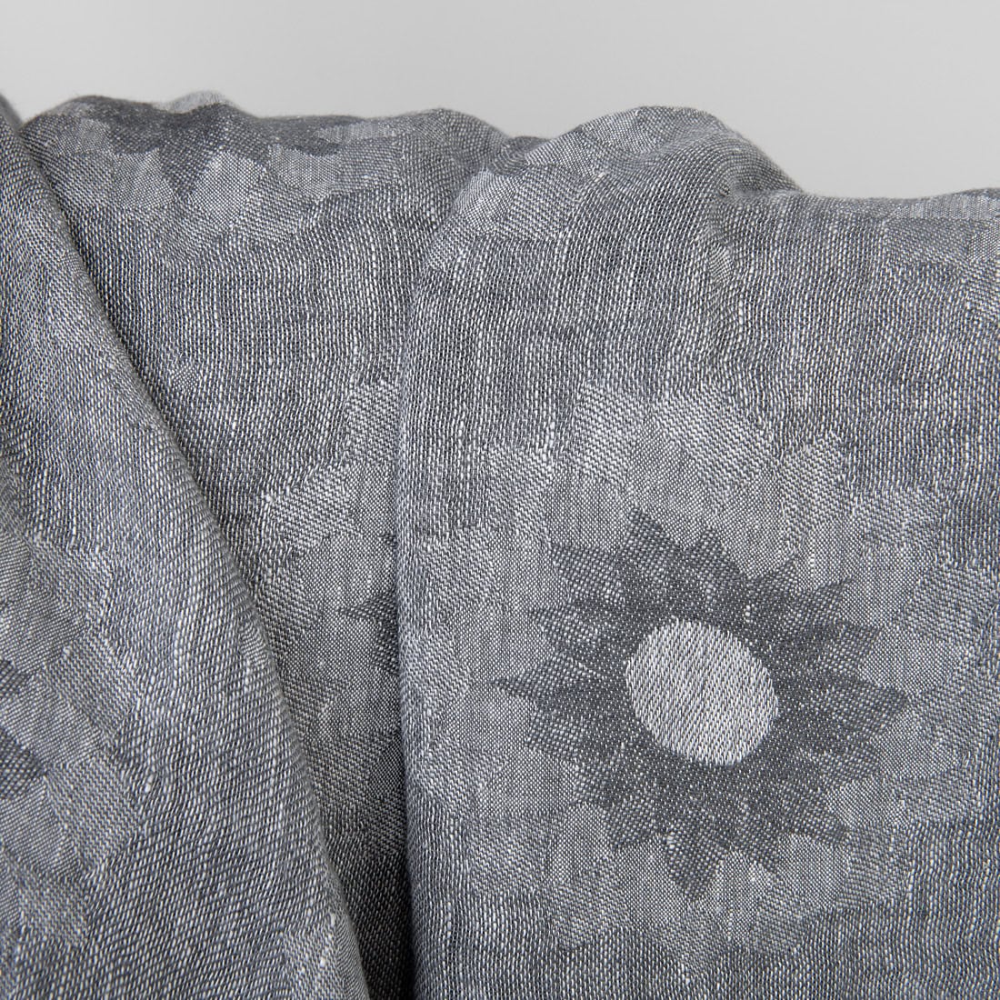 Gėlėtas žakardinis skalbtas lininis audinys. Šiam audiniui naudoti balti ir pilki verpalai. Vidutinio storumo audinys yra specialiai išskalbtas, todėl pakartotinai išskalbus daugiau nebesitrauks, tik taps minkštesnis ir švelnesnis.