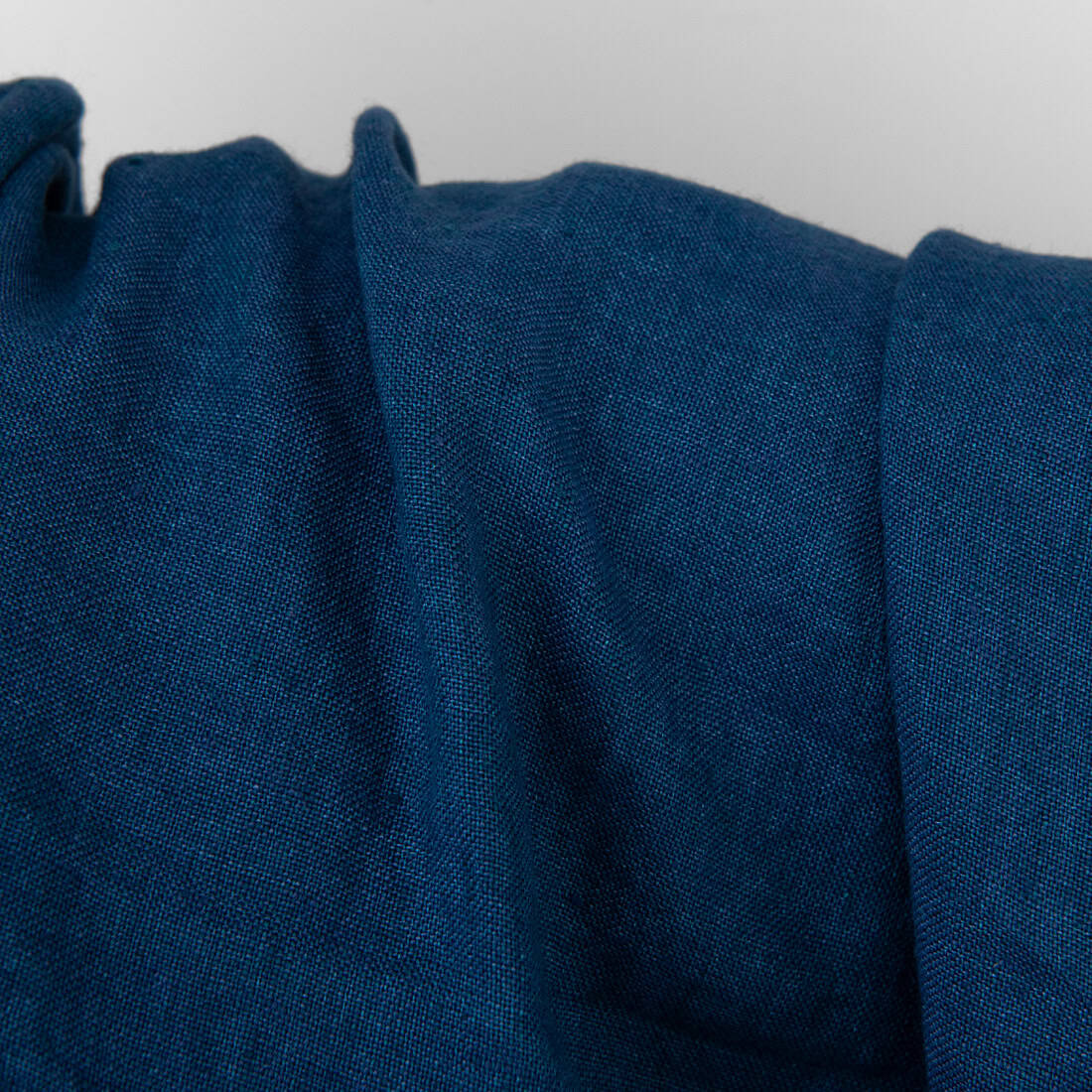 Sodriai mėlynos spalvos lininiam audiniui išausti naudojome tamsiai mėlynus ir tamsaus turkio spalvos verpalus. Traukimąsi pašalino ir minkštumą audiniui suteikė pramoninis skalbimas.