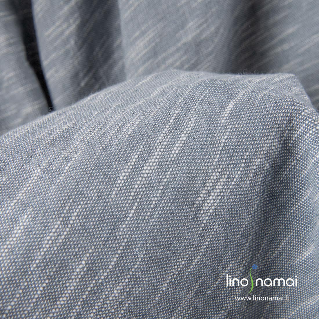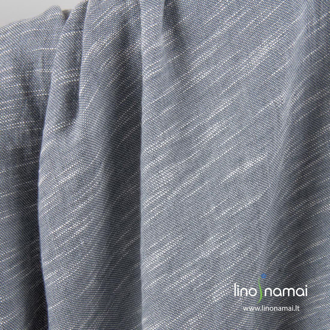 Puslininis pilkas margas audinys, skalbtas. Išaustas iš pilkų ir baltų (su specialiais sustorėjimais) lino ir medvilnės verpalų. Išmėtyti atsitiktine tvarka horizontalūs balti dryžiukai sukuria "gyvą" margumą. Šį audinį išskalbėme, jis suminkštėjo, pasidarė švelnesnis, malonus odai.