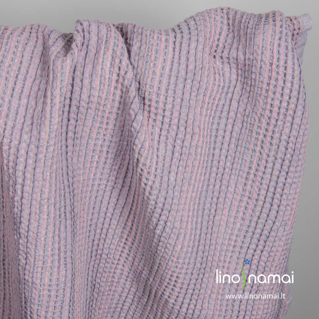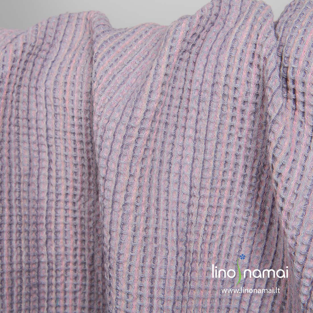 Puslininis „vaflinis“ šviesiai violetinis skalbtas audinys. Suausti šviesiai pilki, rožiniai, melsvi, violetiniai ir alyvinės spalvos (šviesiai violetiniai) lininiai ir medvilniniai verpalai suteikia audiniui žaismingo margumo. Audinys purus, minkštas, švelnus, nes skalbtas specialiu būdu. Iš jo pasiūti gaminiai nebesitrauks skalbiami.