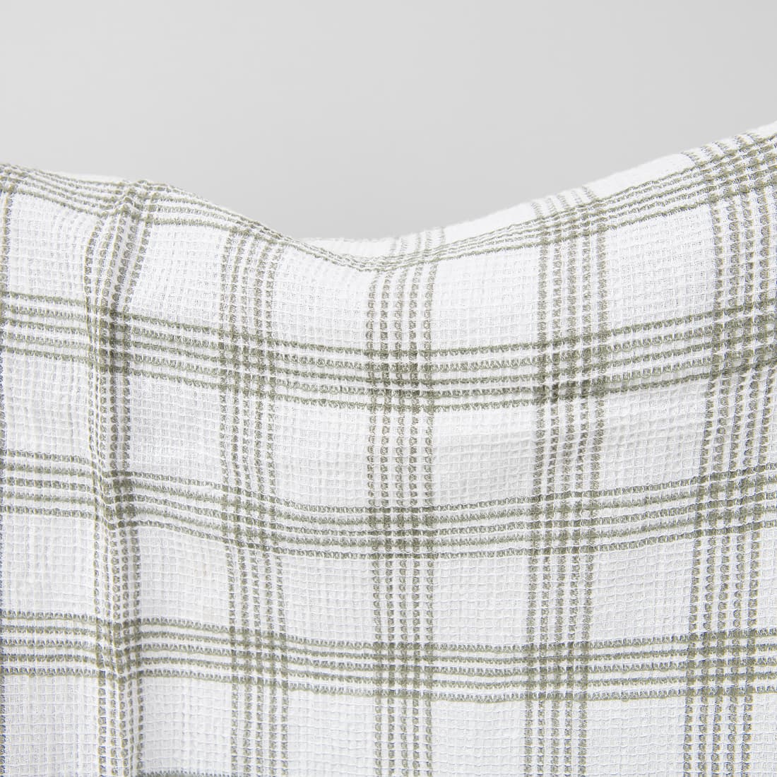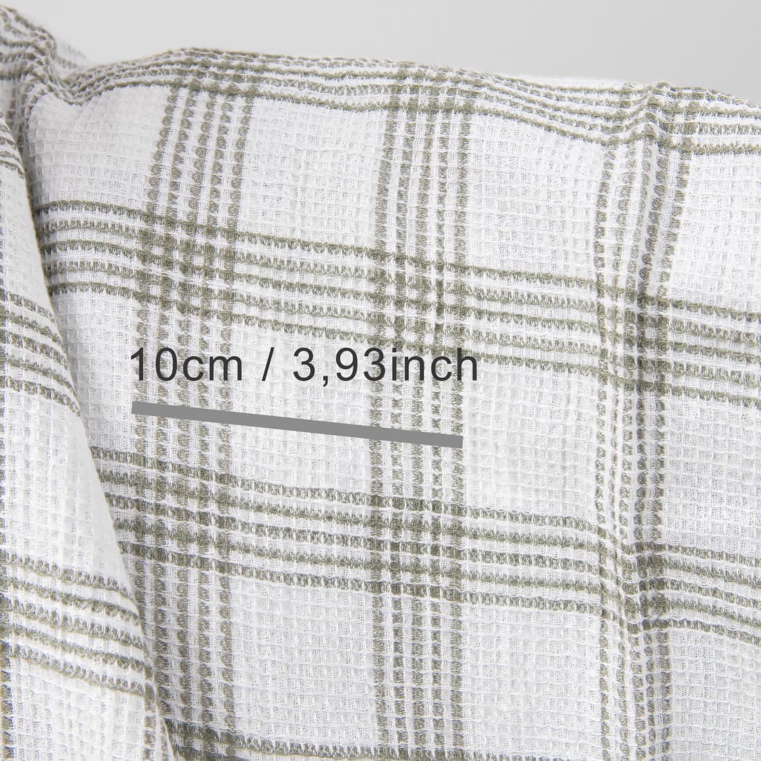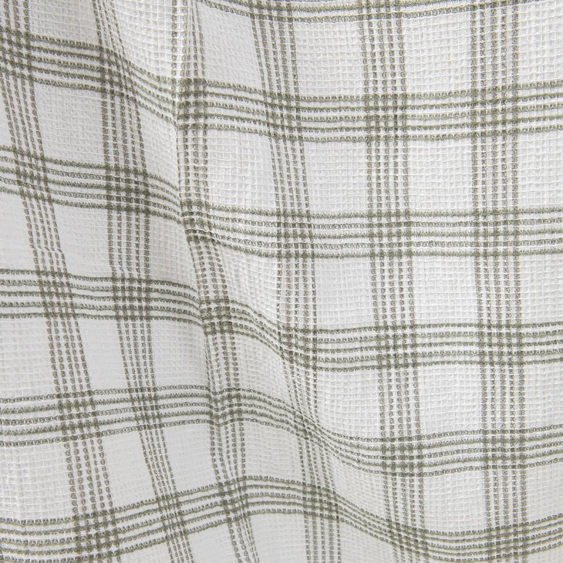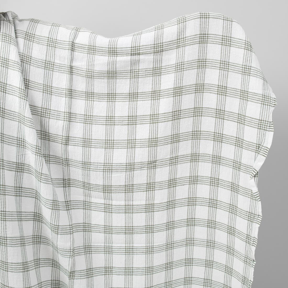 Ryškiai baltas lino / medvilnės sudėties audinys su vertikaliomis ir horizontaliomis tamsiomis žalsvai pilkomis juostelėmis. Austas smulkiais „vafliniais“ langeliais, išskalbtas pramoniniu būdu, minkštas, purus, puikiai sugeriantis drėgmę. Skalbiant pakartotinai audinys nebesitrauks.