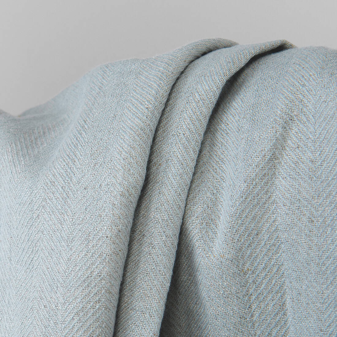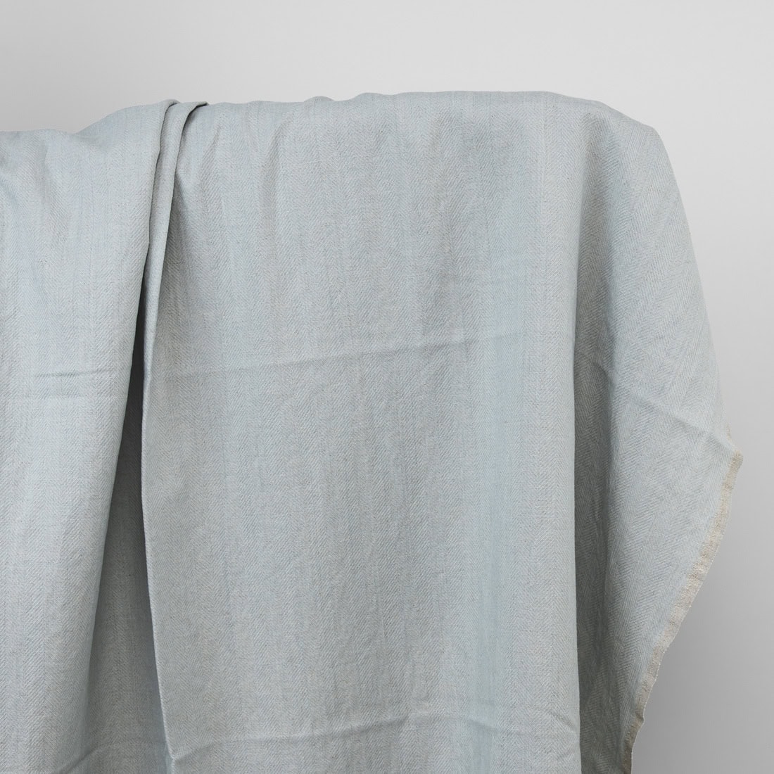 Šviesus lino-medvilnės sudėties audinys, austas „eglutės“ raštu iš natūralios spalvos (pilkų, nedažytų) ir melsvai žalsvų verpalų. Tankus, vidutinio storio, pakankamai sunkus, tačiau minkštas ir švelnus, malonus liesti, nes skalbtas specialia technologija. Skalbiamas nebesitrauks.